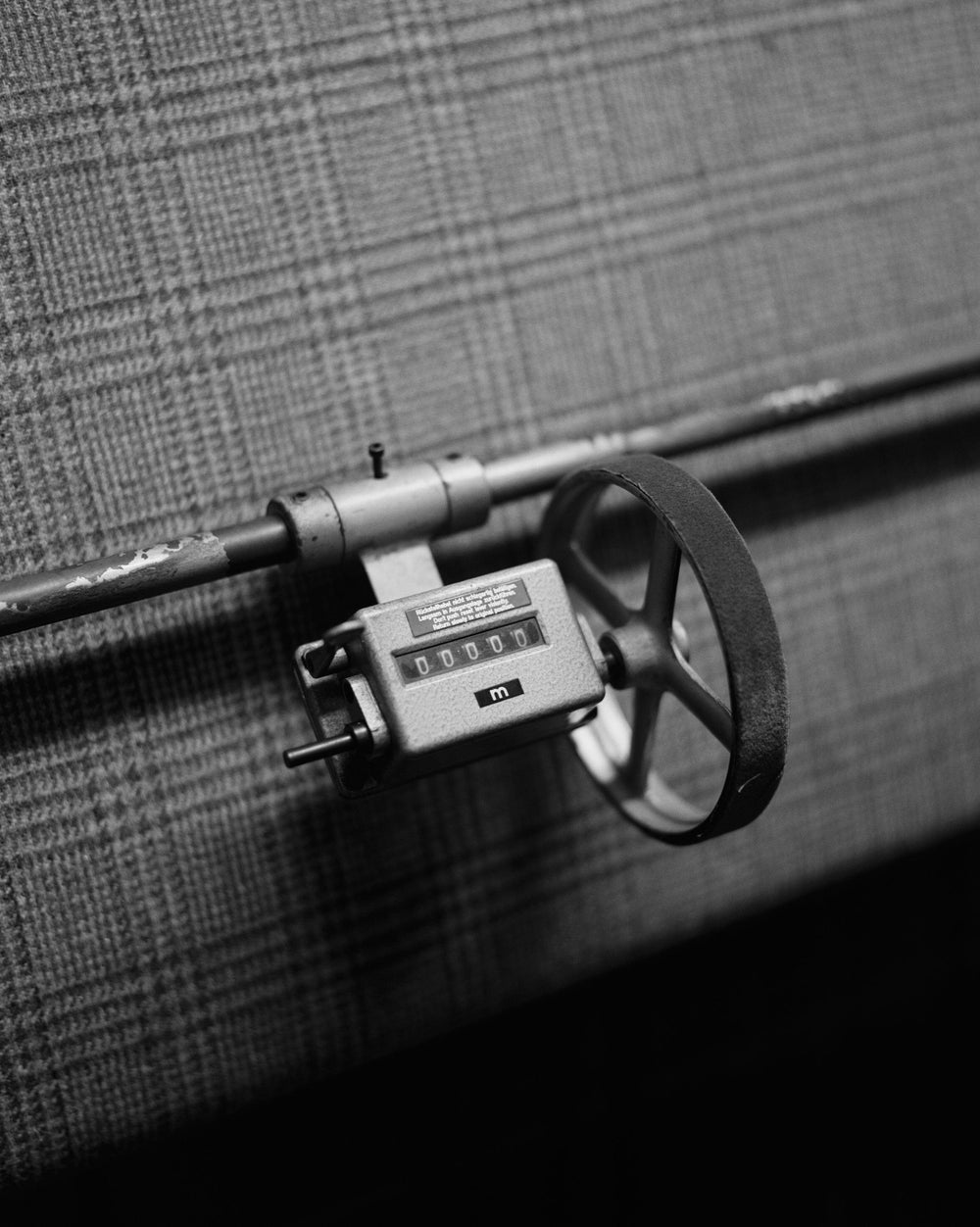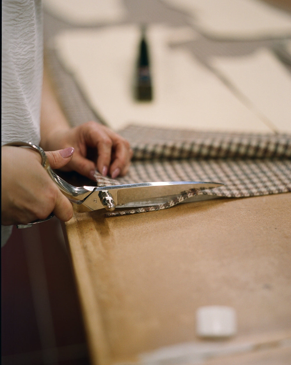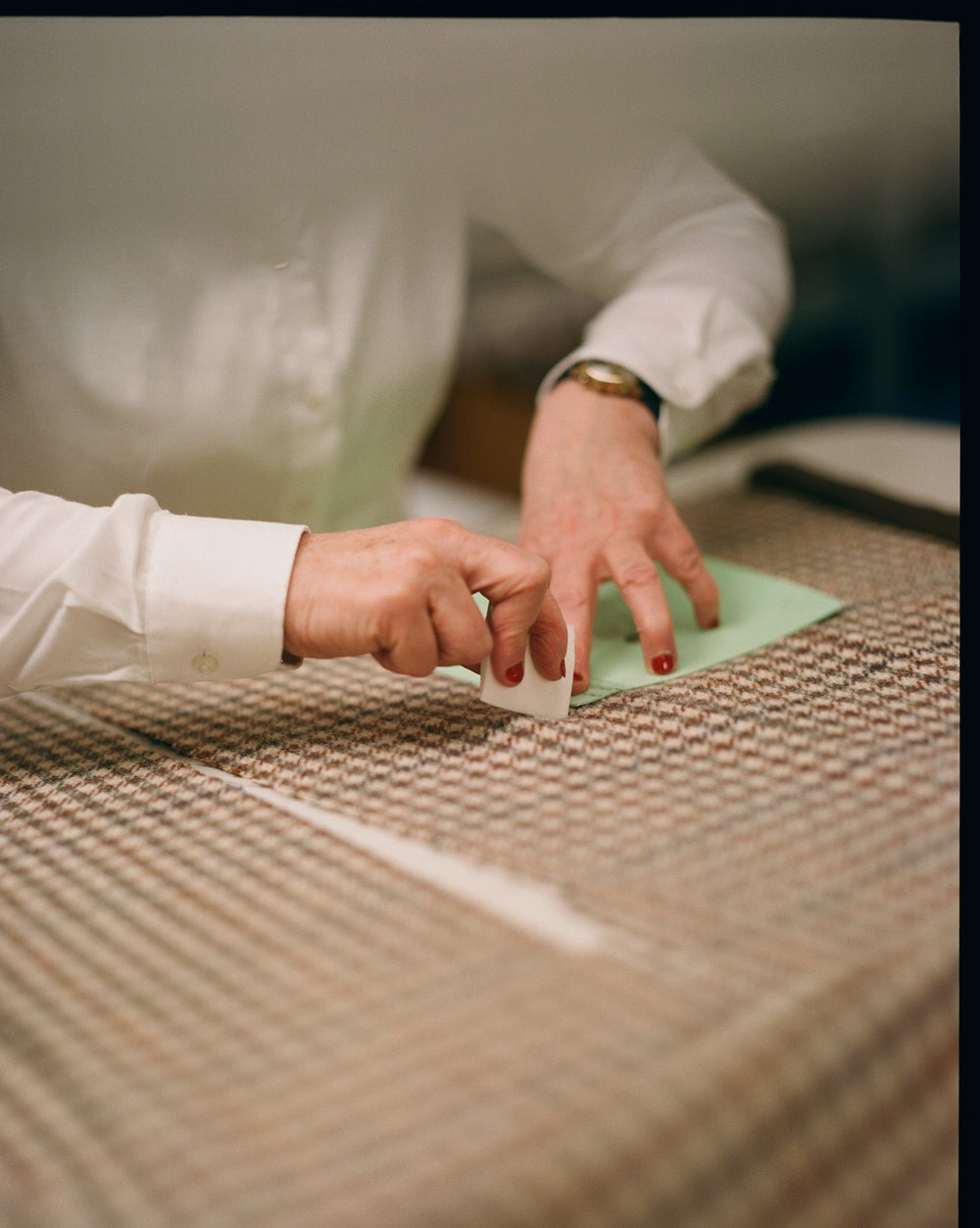 Among a library of cloth sits a behemoth machine carrying one of our selected fabrics - something to behold in its entirety after we have been poring over sample squares for the last few months - which is then carefully inspected with a giant wooden compass for any imperfections, before being laid out for cutting.