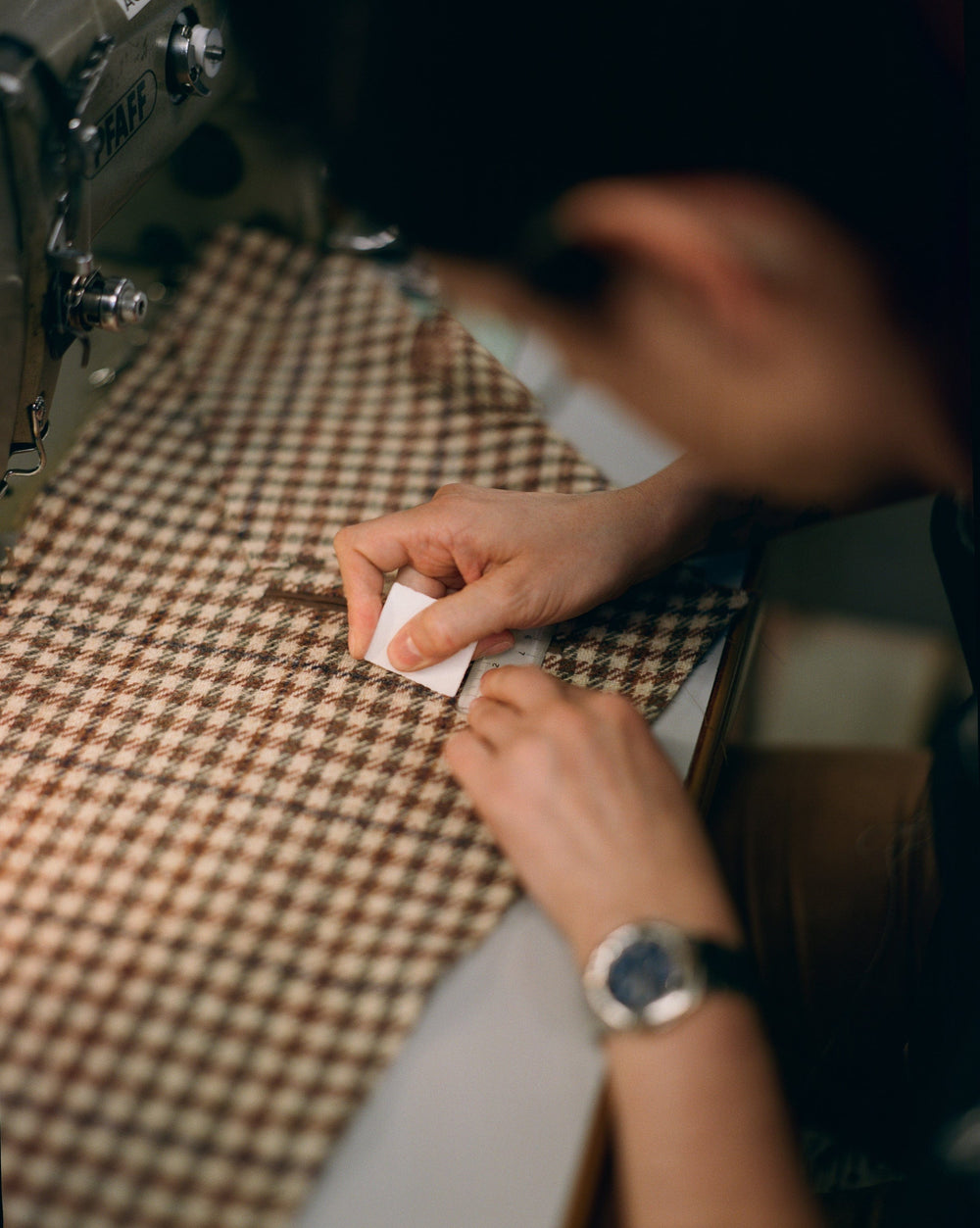 As we continue our tour, we come across three older women sitting together, chatting and sewing buttonholes by hand, each using a large magnifying glass to stitch with careful precision. Watching their steady hands at work is a reminder of the deep experience and tradition that run through this factory. Moving on, we spot someone stitching a canvas to a jacket with a quiet focus. She doesn’t even glance up as we hover nearby, absorbed in the task at hand.