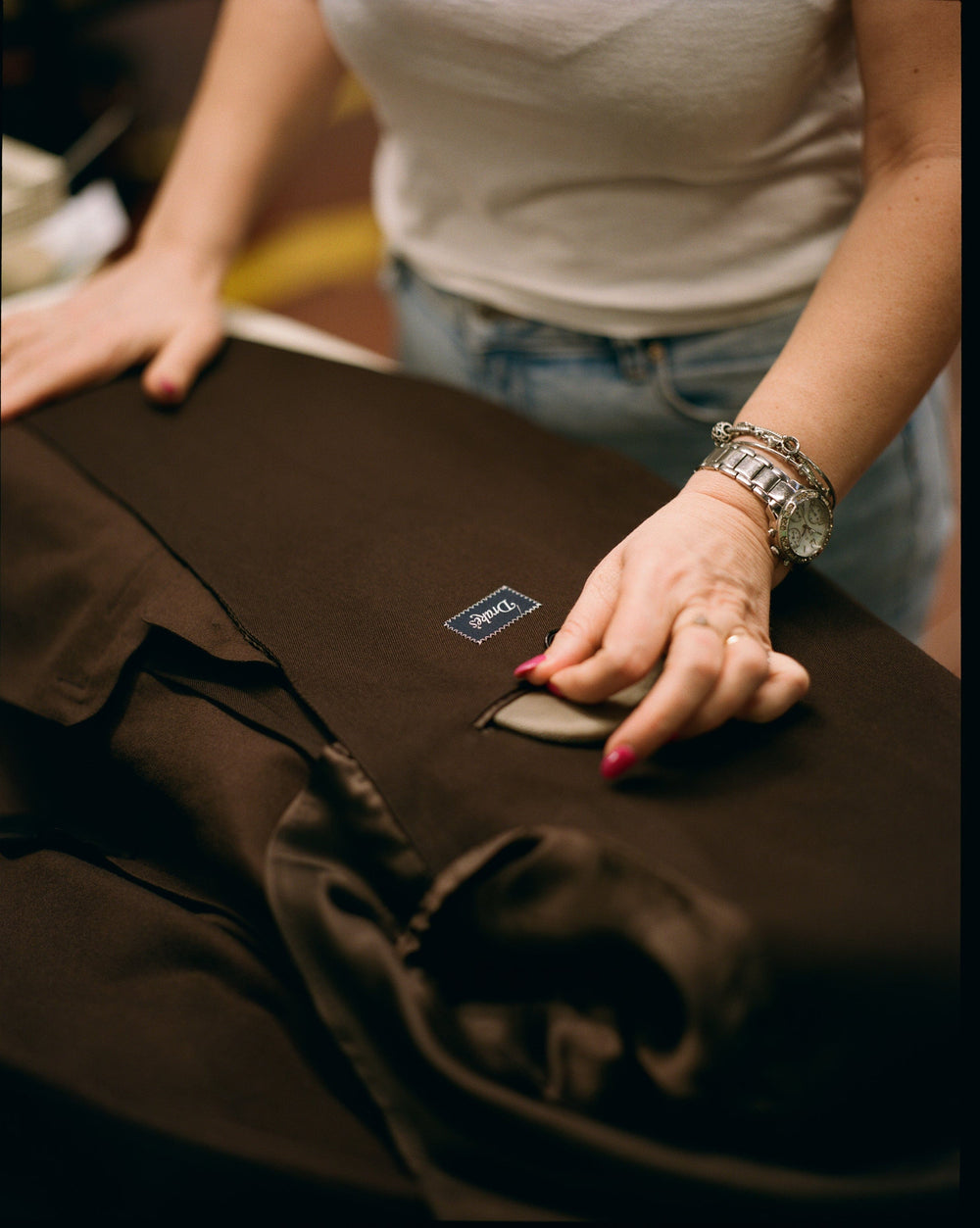 We pause for a moment to chat with one of the cutters, Barbara. Her hands move with the kind of fluidity that comes only from years of experience. “I’ve been doing this for a long time,” she says, looking up from her work. “We cut by hand to match the pattern across pockets, flaps, and seams. It takes time, but this is the best way to make it perfect.”