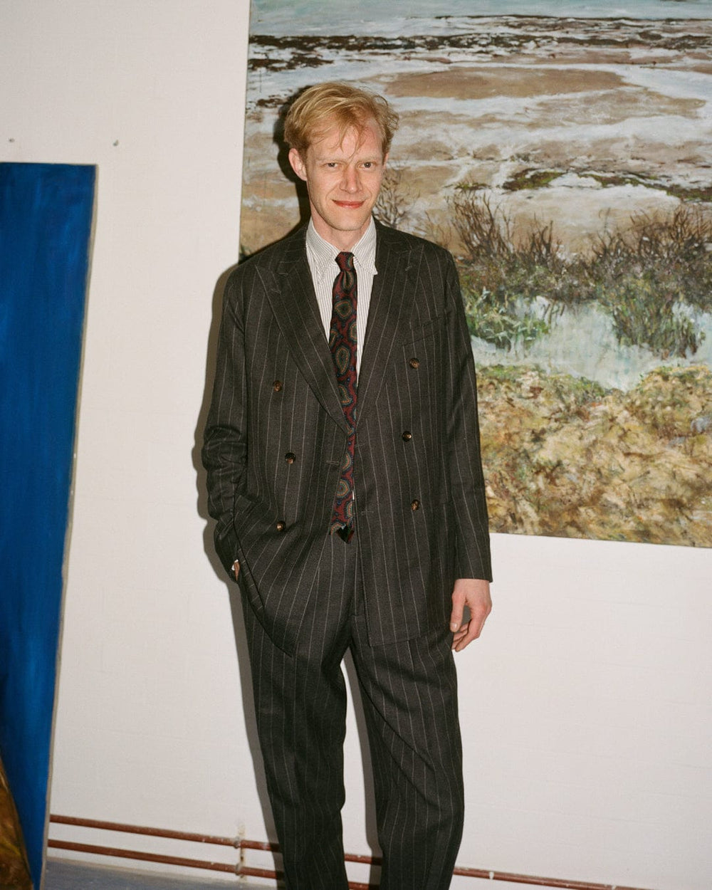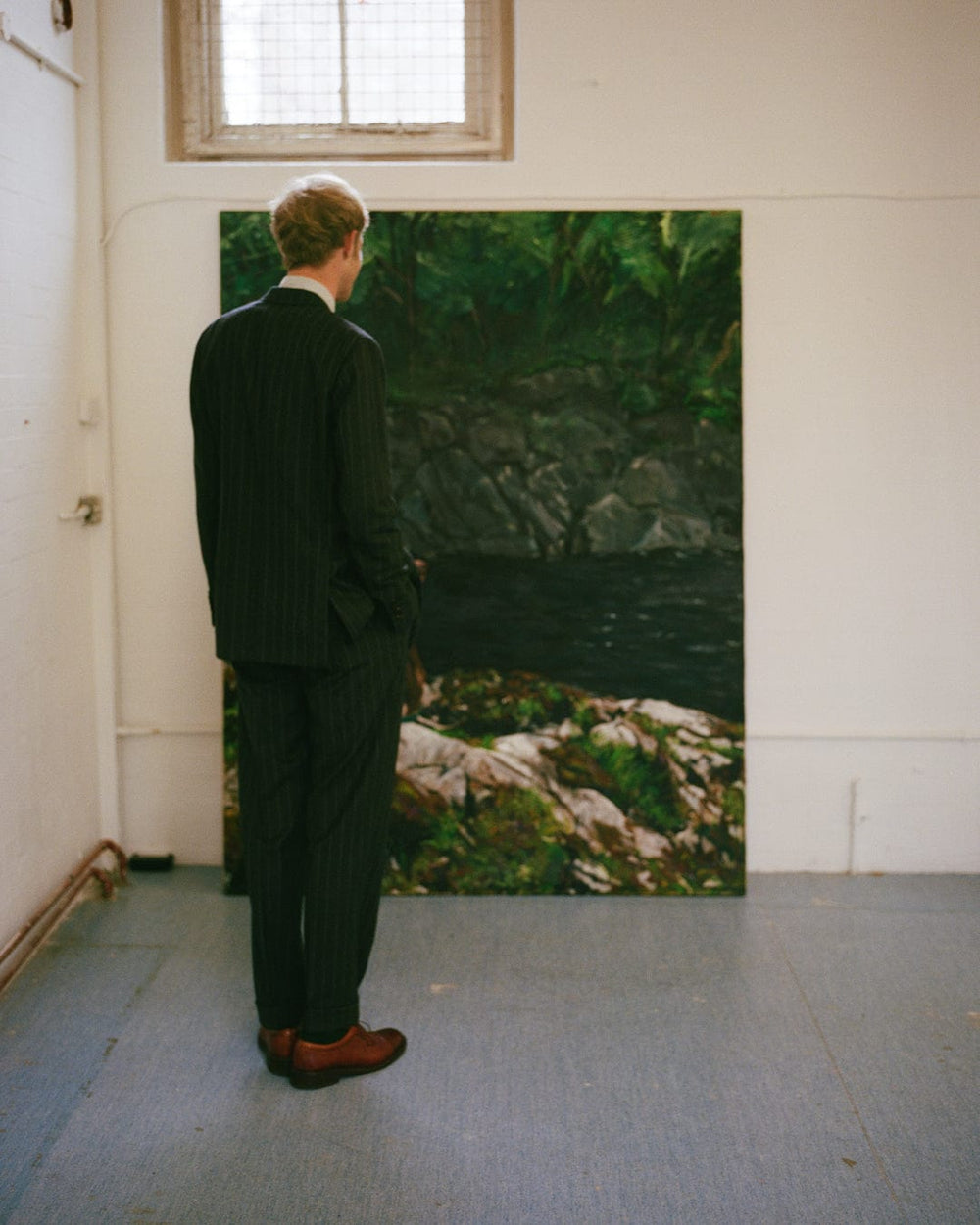 When I visit his studio in Stockwell, Hugo, a tall wispy blond figure in paint covered loafers and a long warm coat, is waiting outside for me, smoking. He points out one of the trees he painted for the exhibition, it’s a small, fragile sapling, verdant and pure, foregrounded by a parking lot and framed by industrial rooftops.