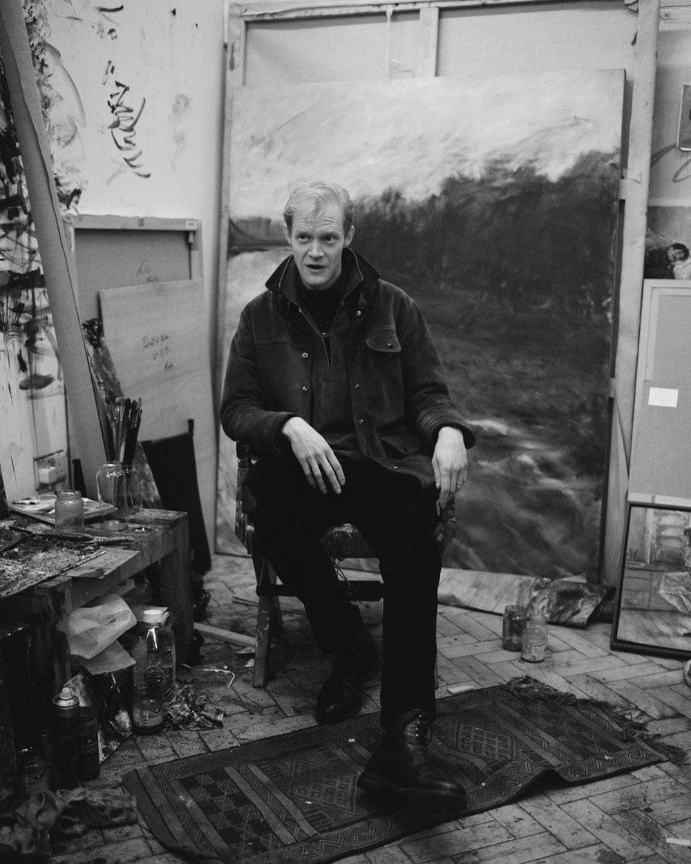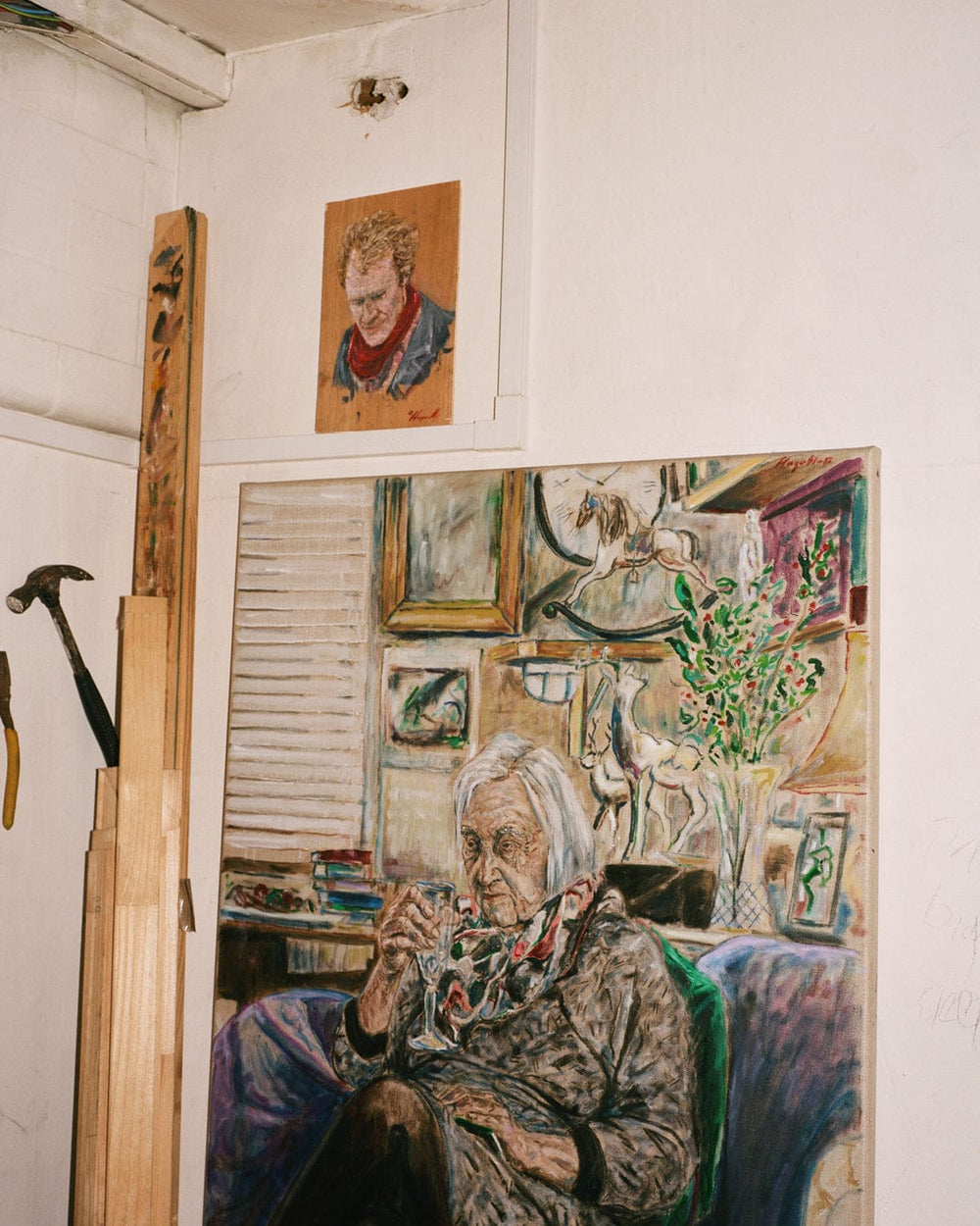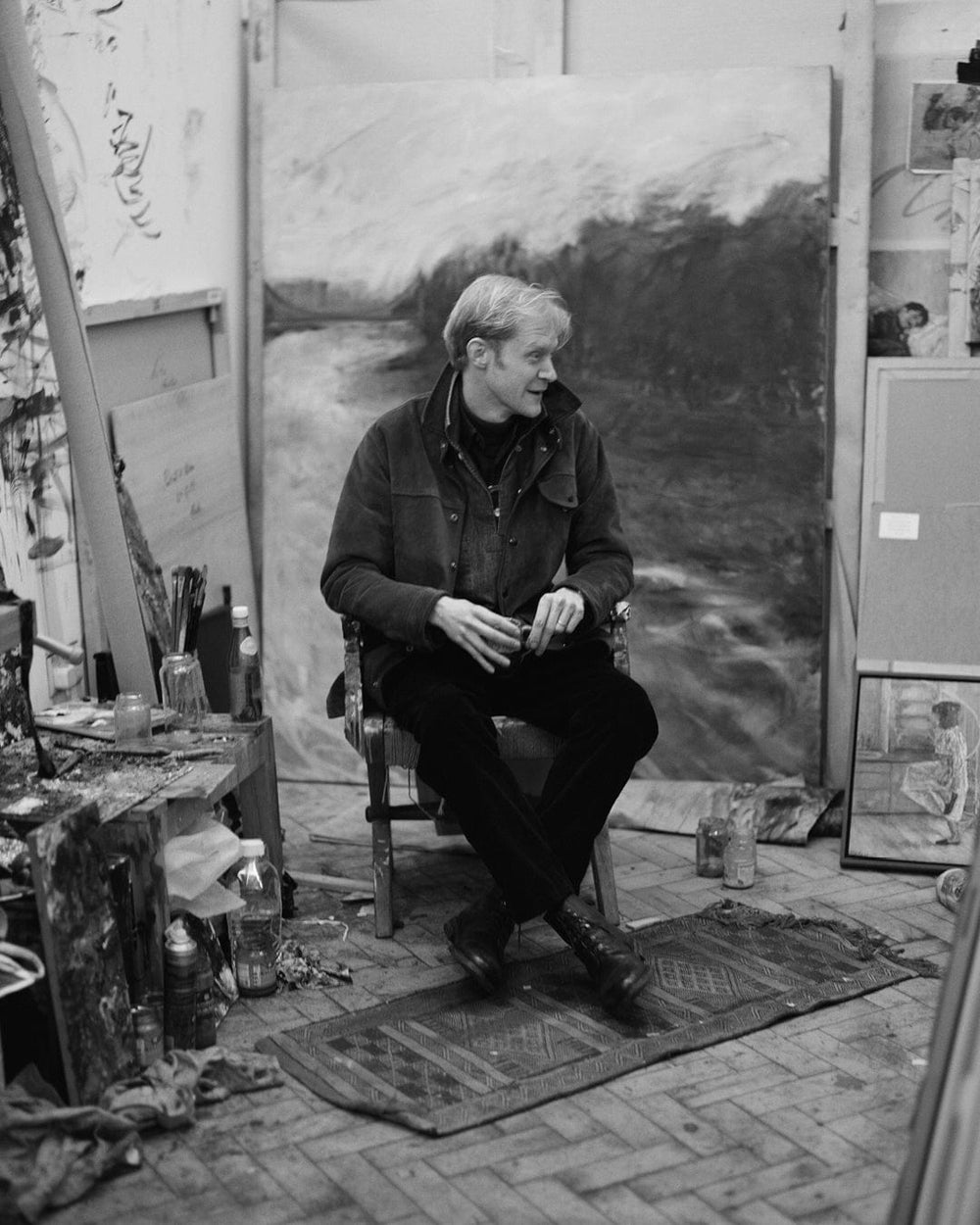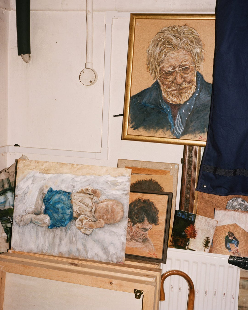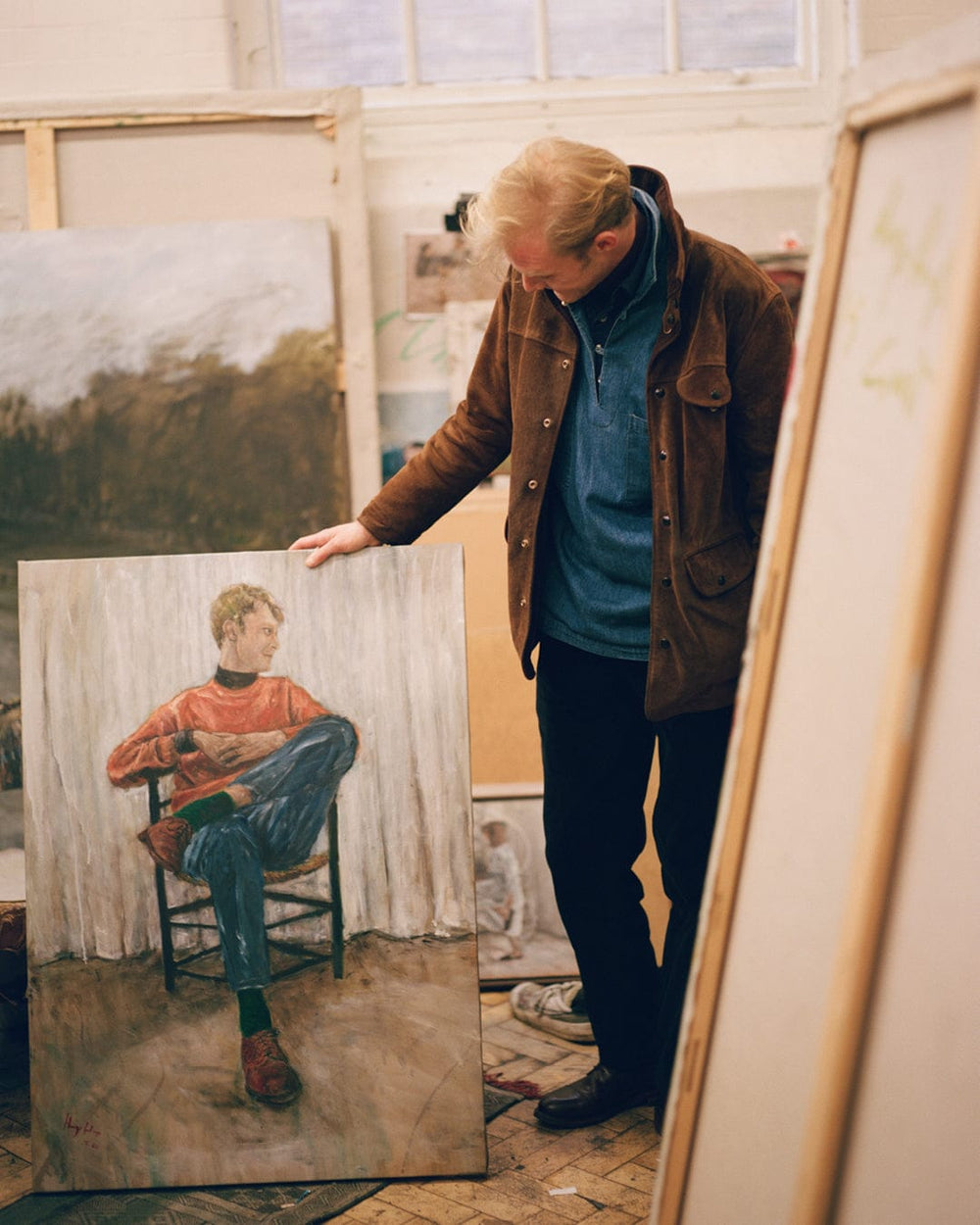 Hugo makes us both coffee and starts rearranging the stacks of huge canvases that line two of the walls of his studio. One of the others is given over to the actual work of painting, and all the abstract accumulations of detritus from oil painting. The fourth wall is covered with small portraits of friends.