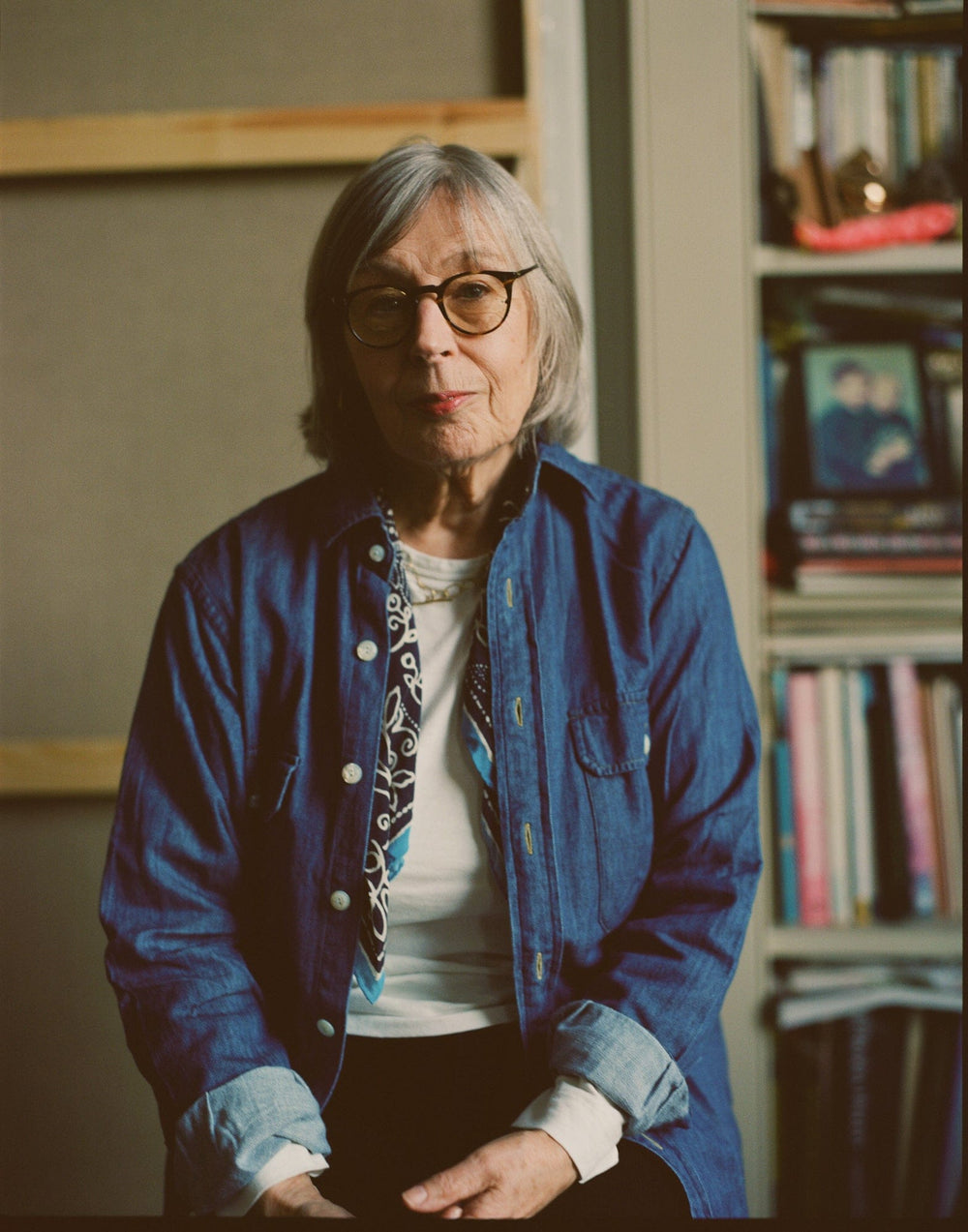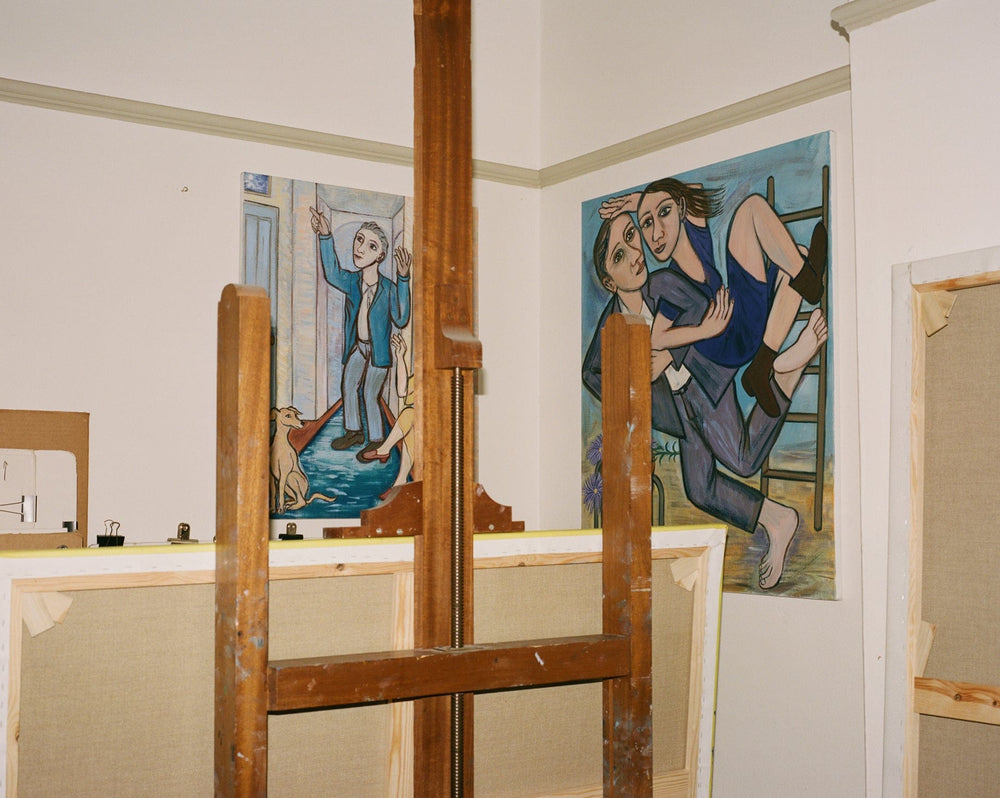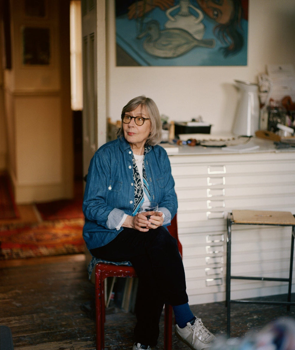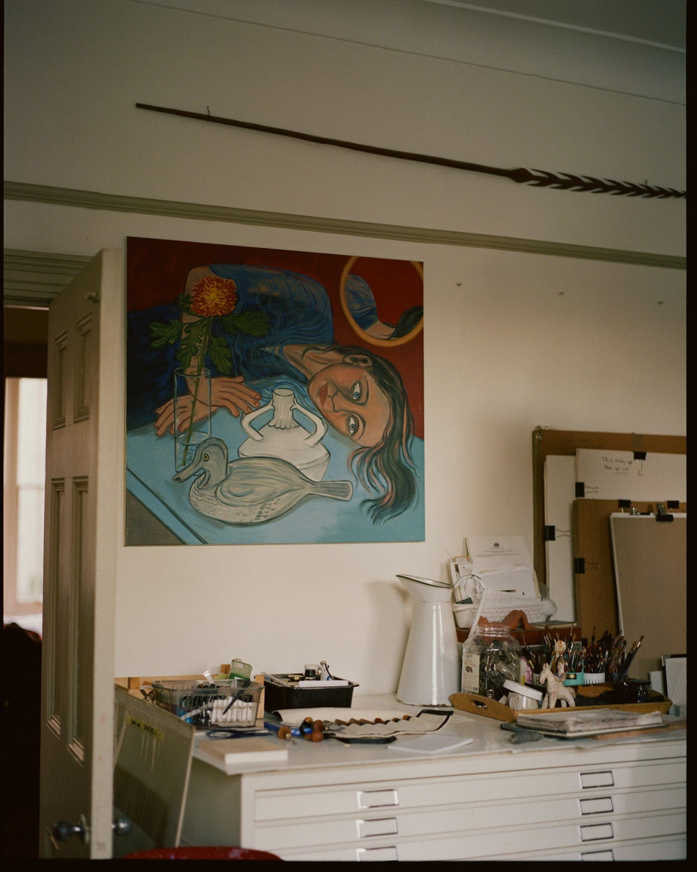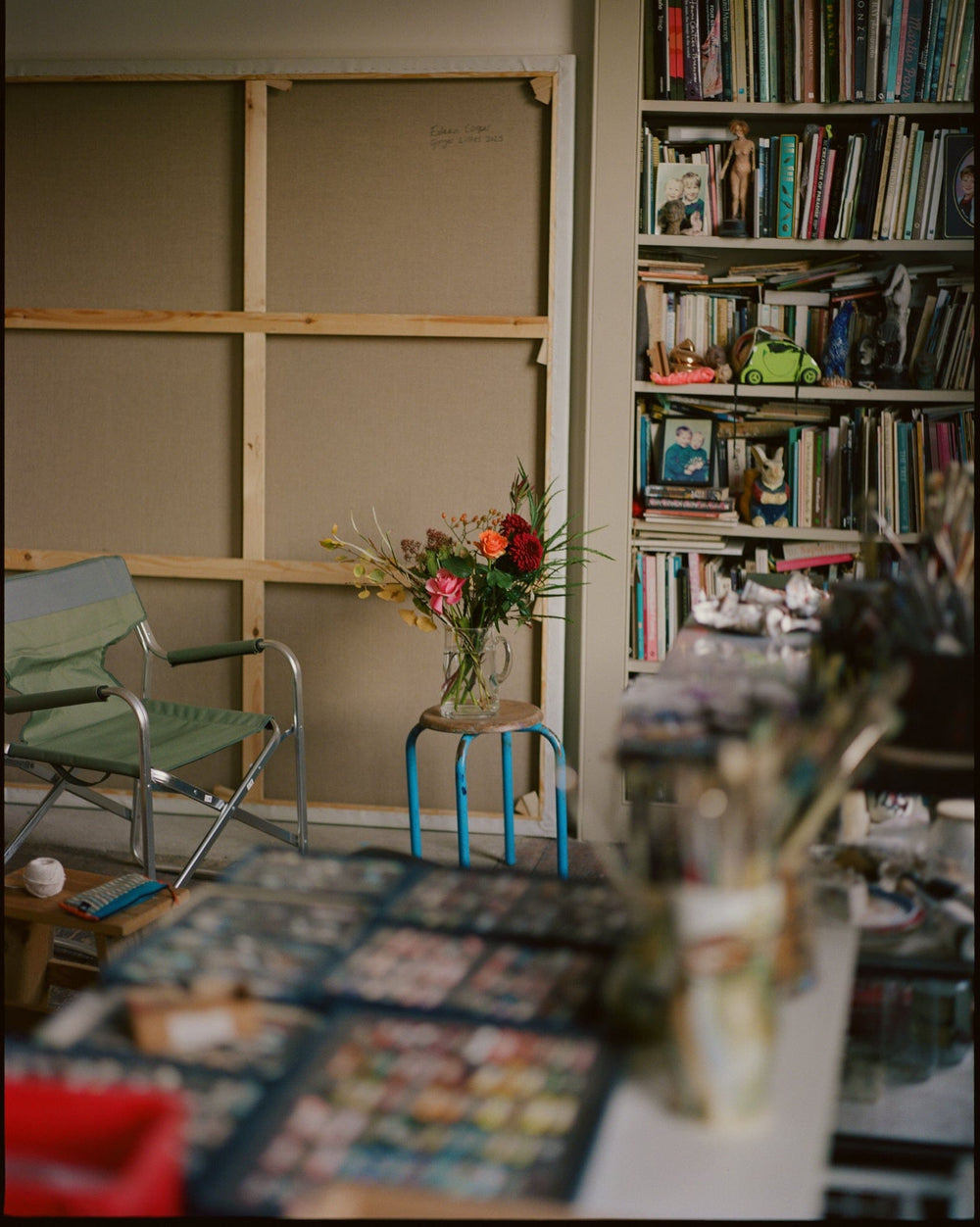 Cooper’s studio is a large room on the raised ground floor of her home, a Victorian townhouse that she has lived in since 1984. Here, she has set up an unfussy mise en scène: I sit on a camping chair in front of a large canvas that leans with its face to the wall. To my left is a blue-legged stool, on it a glass jug containing a bouquet of autumnal flowers with a single incongruous pink rose. When she’d asked me if I wanted to be pictured holding something, I had bristled, not wanting to force some symbolic statement. I’m satisfied to realise, as I sit down ready to take notes with my notebook and a gold-nibbed pen that I’m admittedly very proud of, that the decision had been made for me.