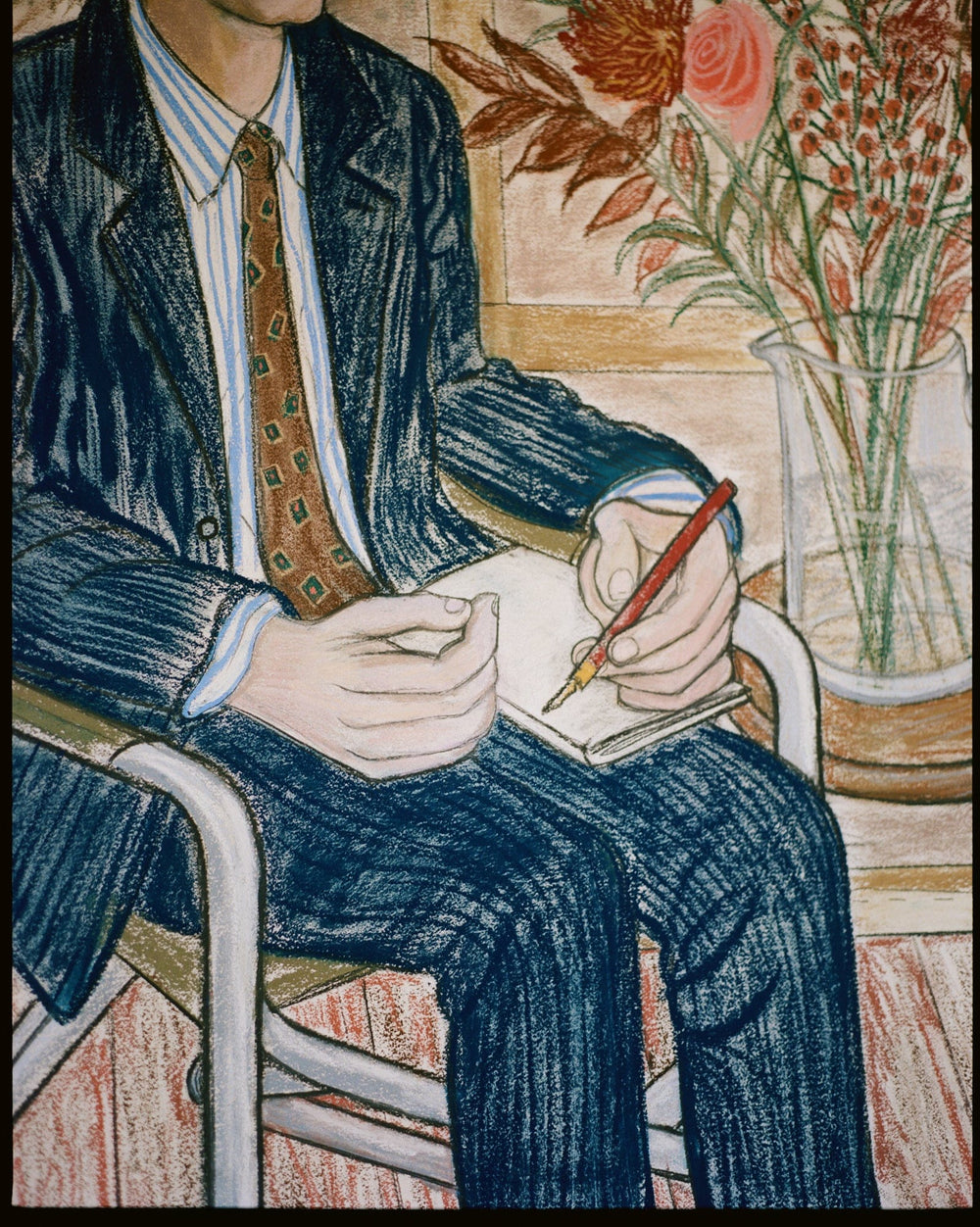 Towards the end of our session, Cooper starts referring to the portrait as “you”,like there are two of me in the room. There’s the one who will shortly walk downstairs to eat a bagel for lunch before going home and the one who will remain seated, pen in hand, for the rest of his days. I begin to feel uneasy, knowing that my pastel-rendered counterpart will go on to have an unpredictable life of his own; where will he end up? Will he be loved? Looked after?