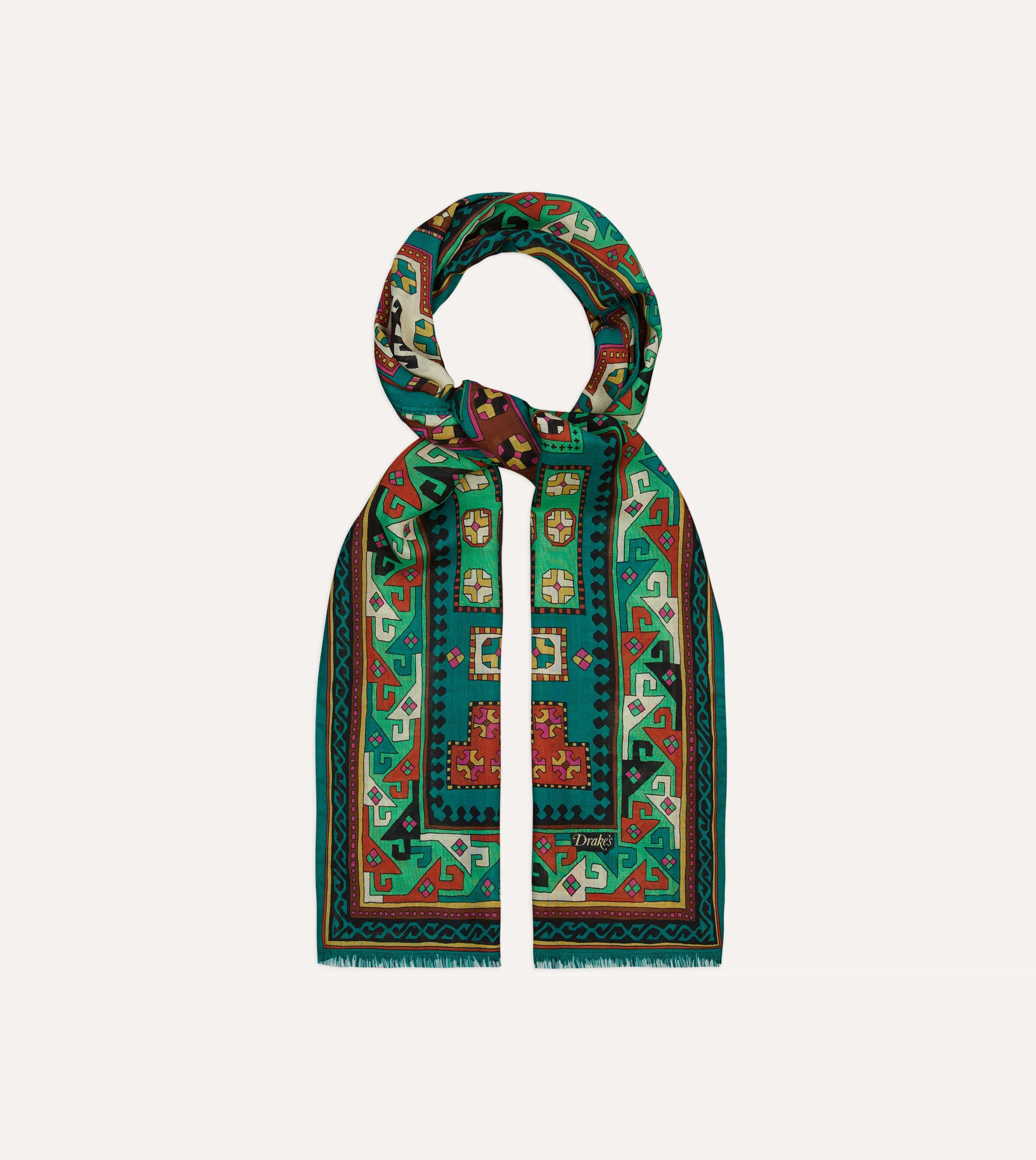 Green Kilim Print Wool-Silk Scarf