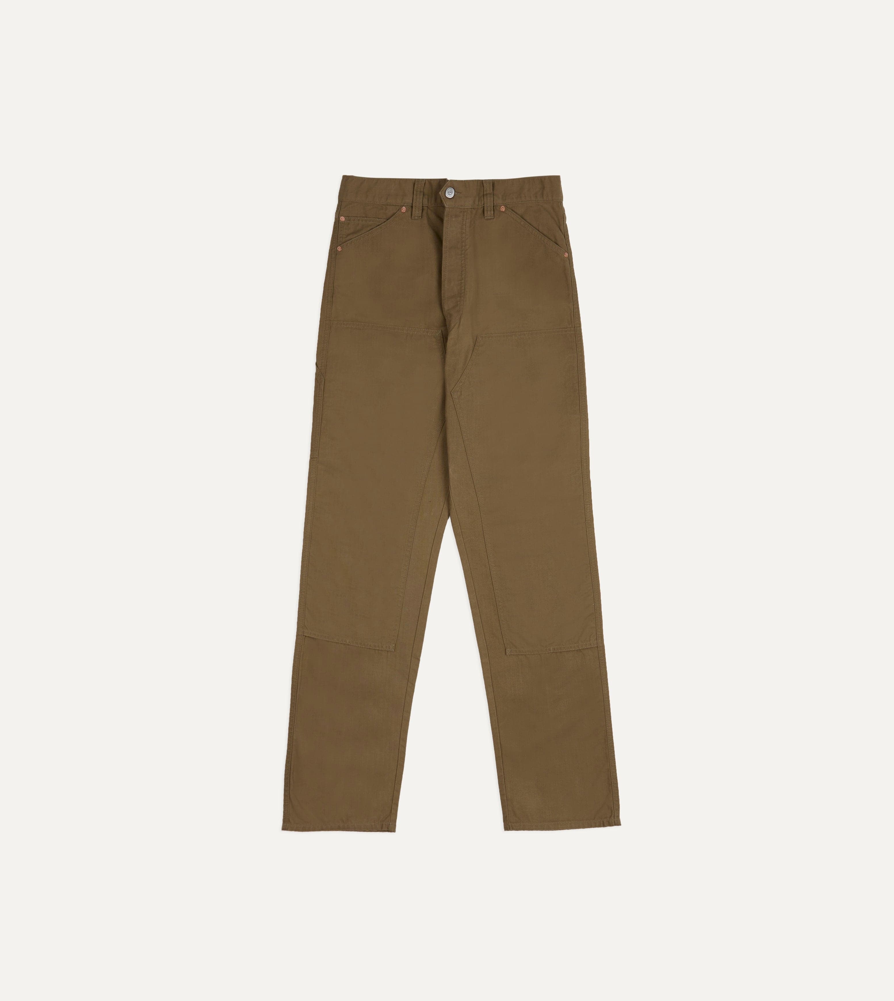 The carpenter trouser (or ‘pant’ over the pond) was originally a workwear workhorse, and this design follows suit with double-knee construction, where reinforced sections were designed to endure the demands of workshop use. Twin-needle stitching carries that same spirit of utility, while slanted side pockets, copper rivets, belt loops, and a handy utility pocket provide both practicality and ease.