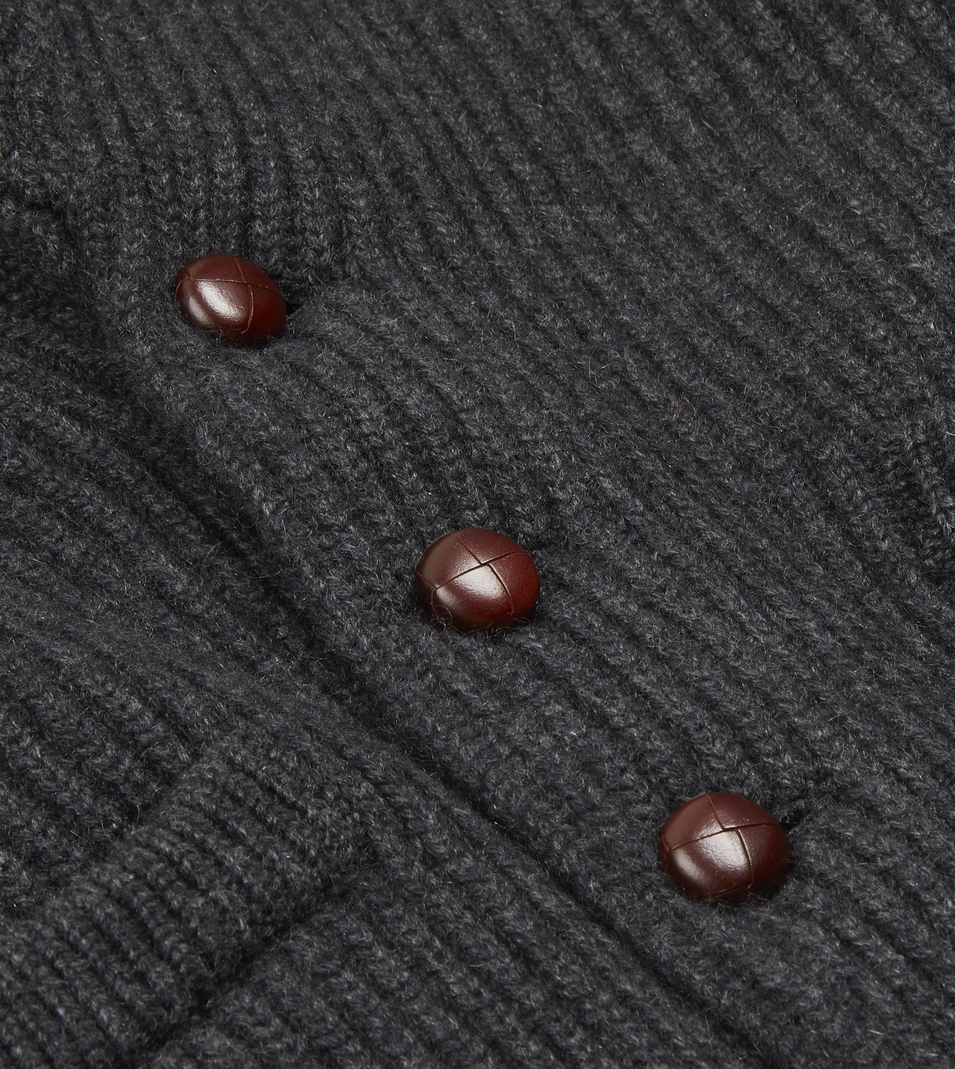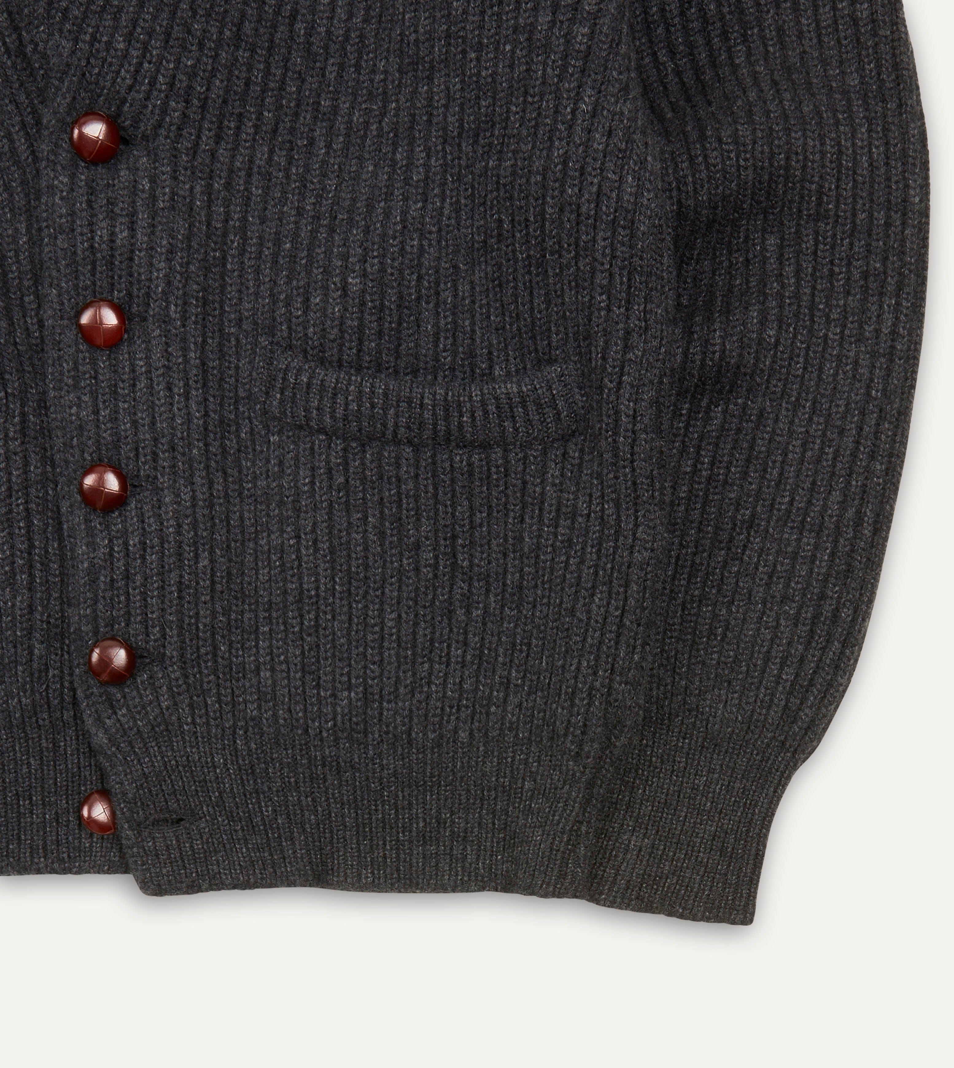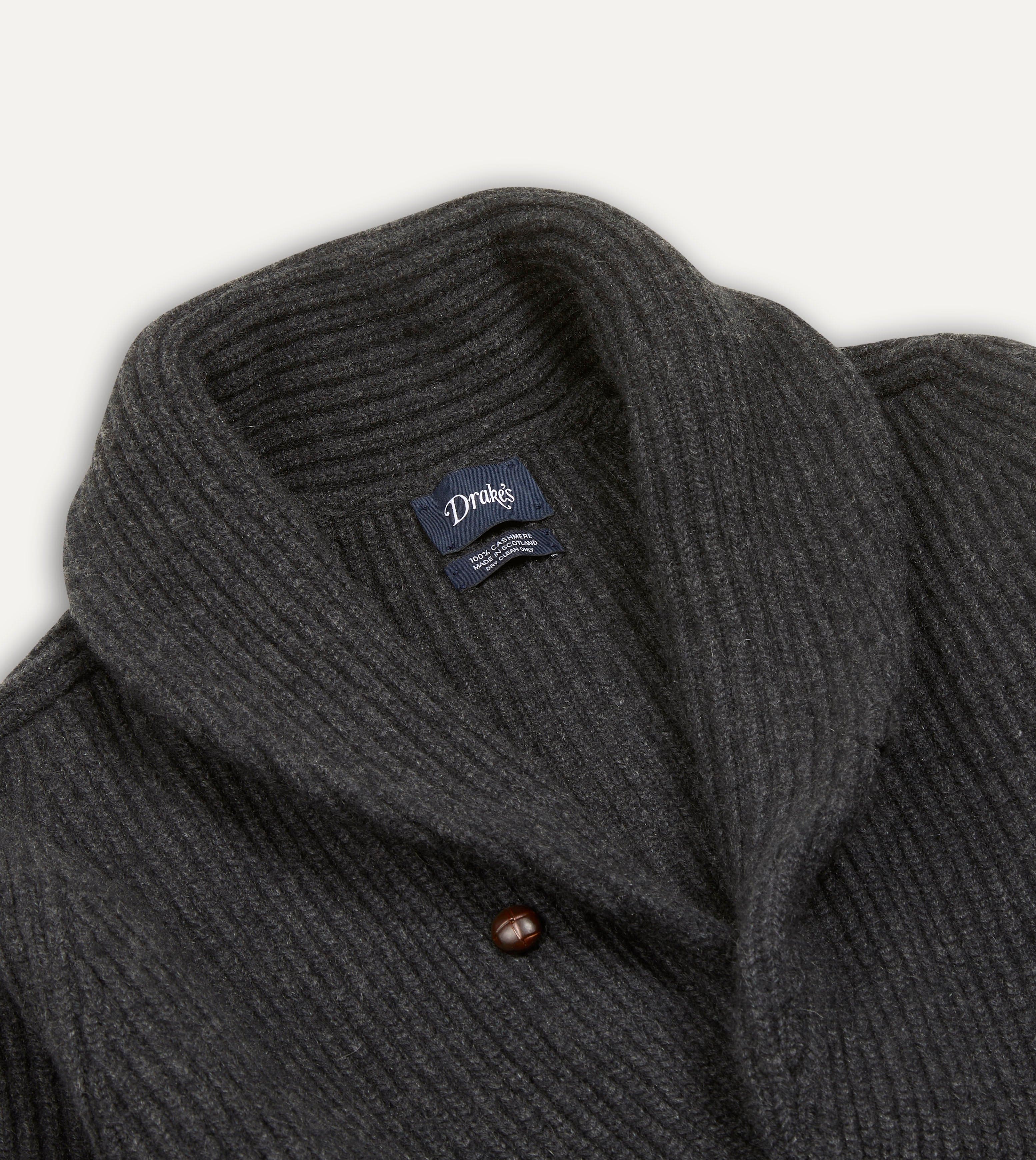 Our luxurious, iconic shawl-collared cardigan defines casual elegance. The garment is knitted from the finest ribbed four-ply ribbed cashmere, with five-braid British tan leather buttons, two front pockets, classic raglan shoulders, and a knitted cashmere throat loop closure.