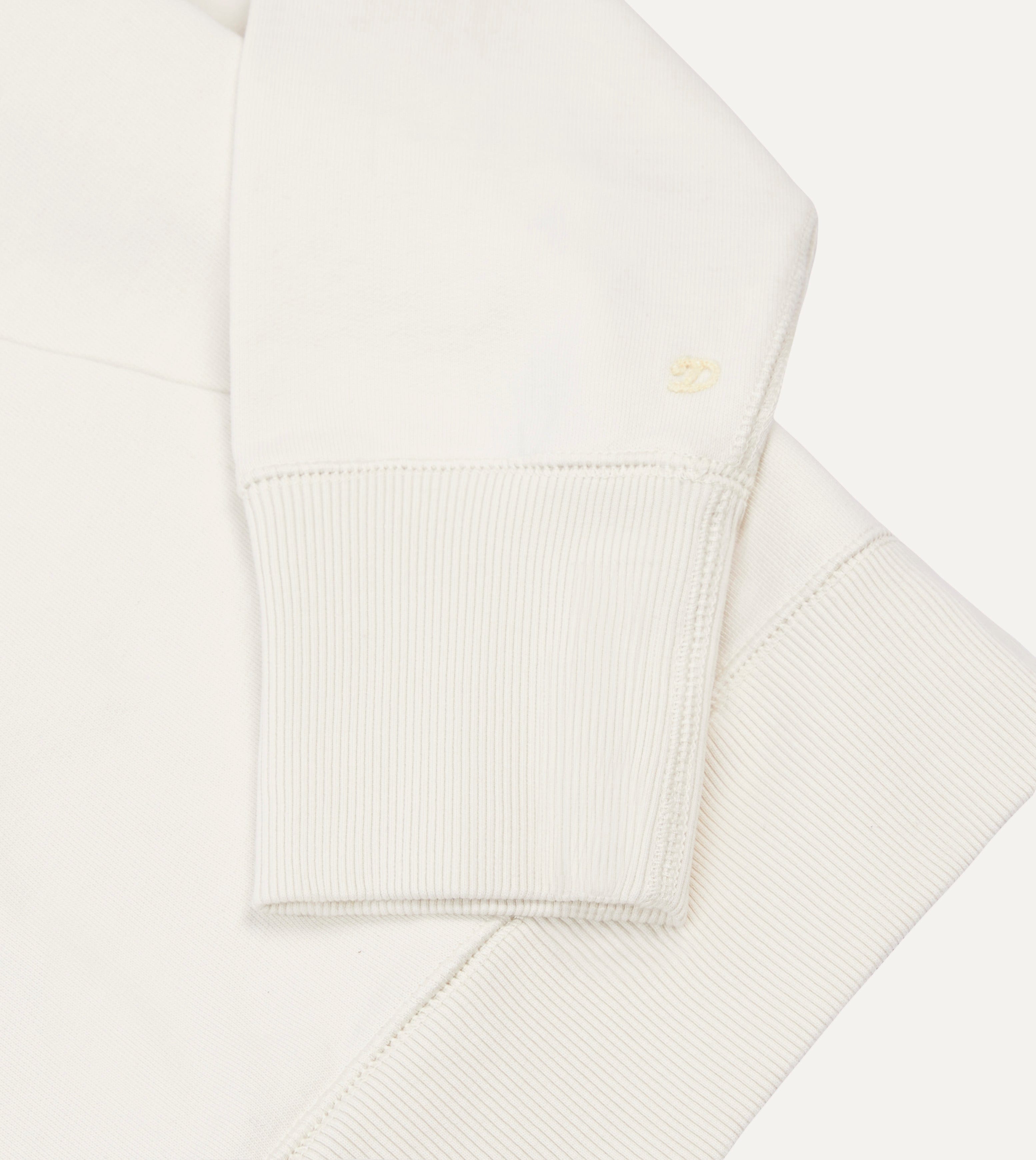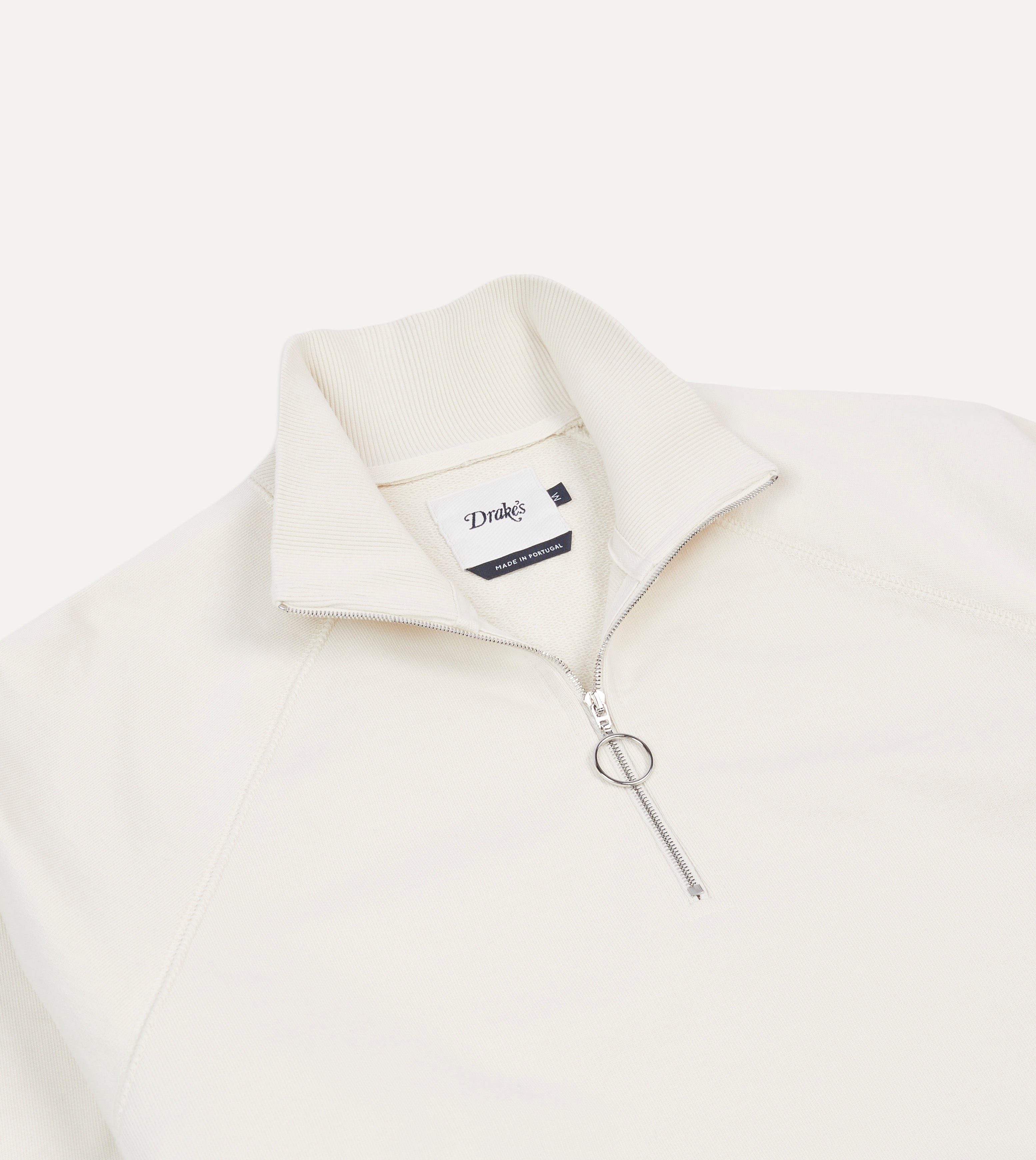 Styled after vintage examples of mid-century running gear, this quarter zip sweatshirt is made from a densely woven 16.2oz cotton jersey and features ribbed cuffs, a kangaroo pocket, raglan sleeves, and our monogram motif, chain stitched in wool on the sleeve.
