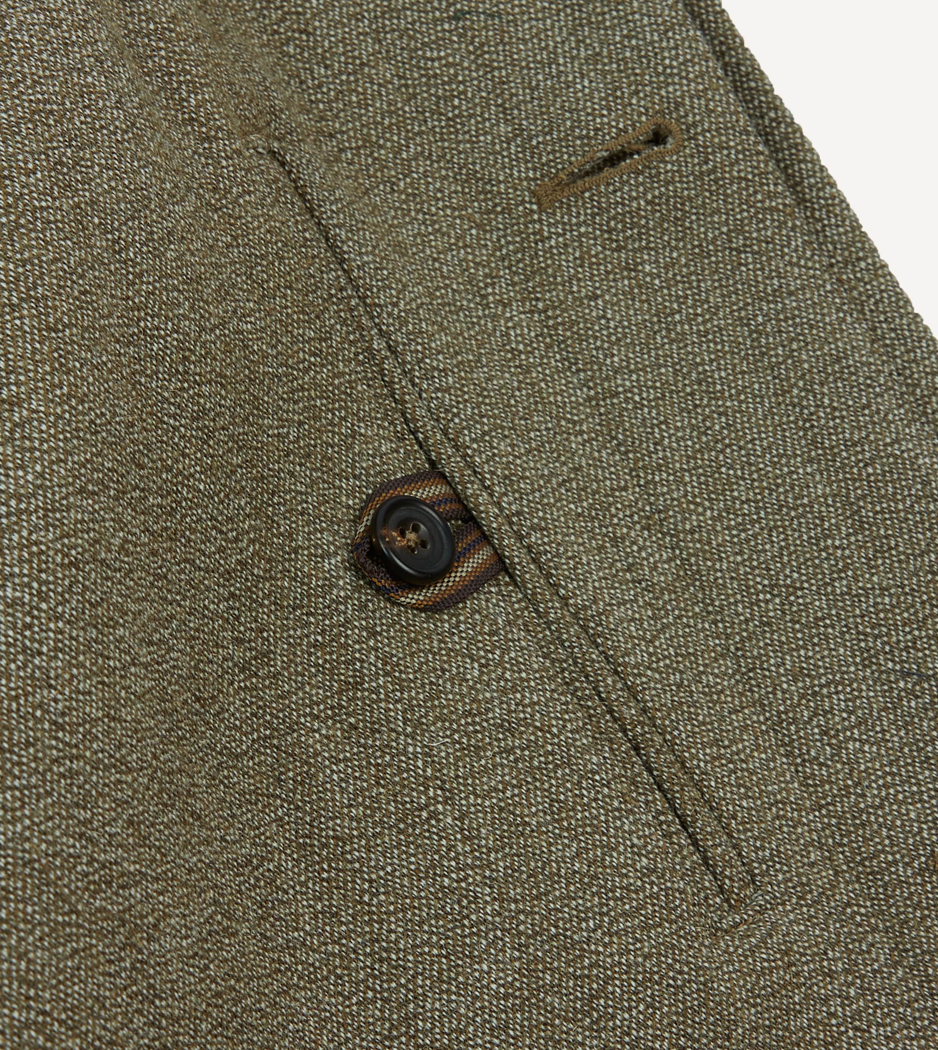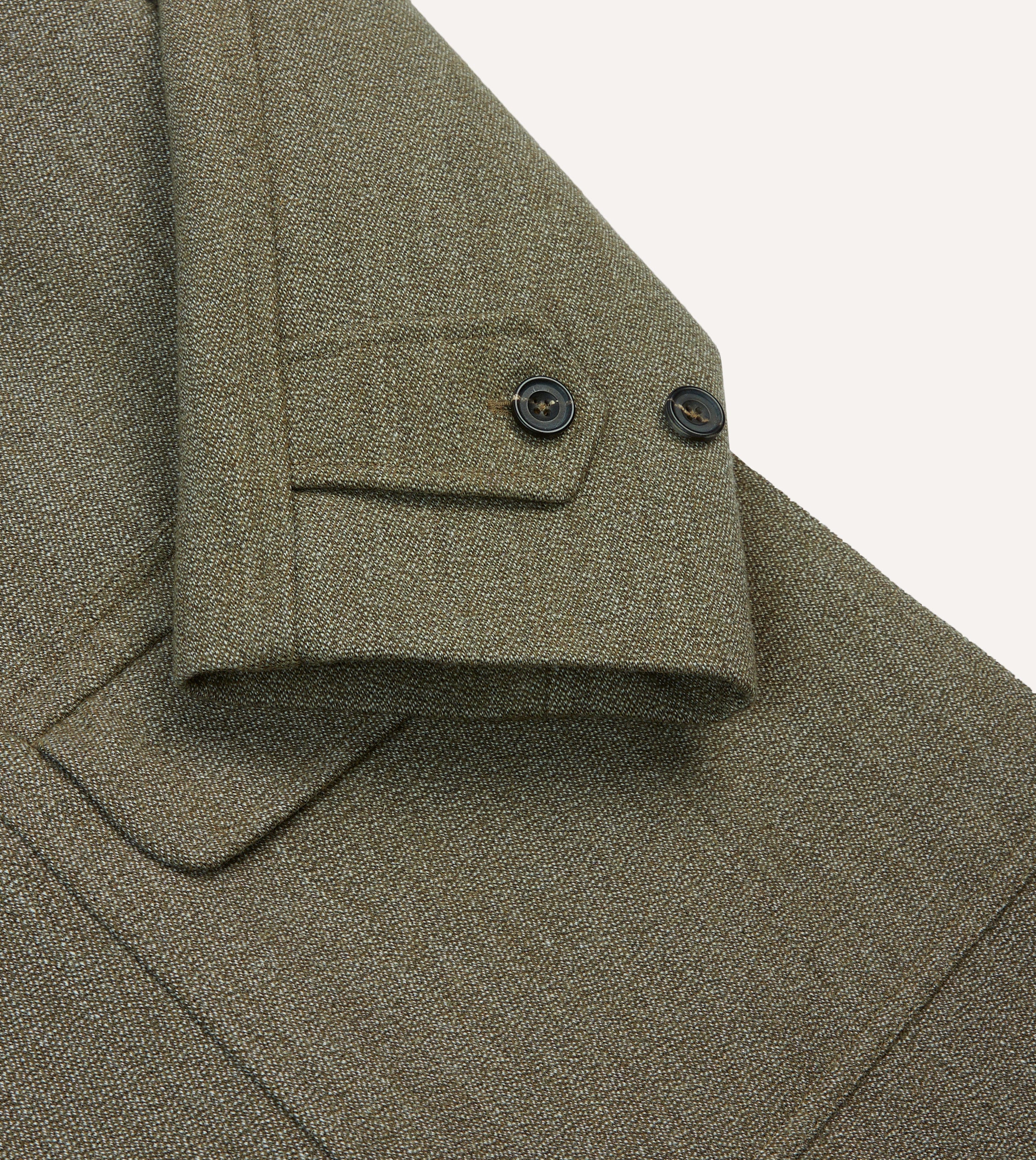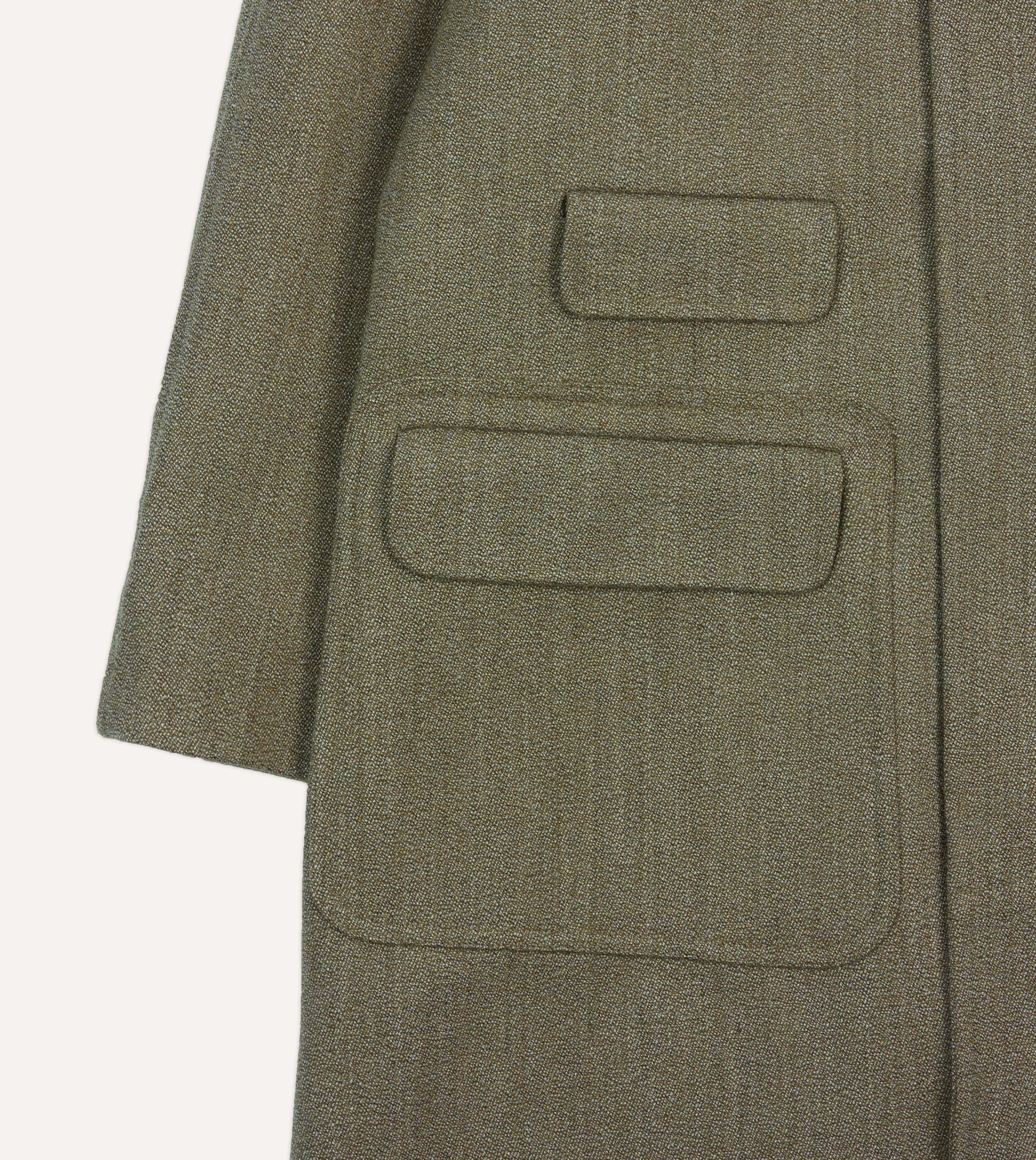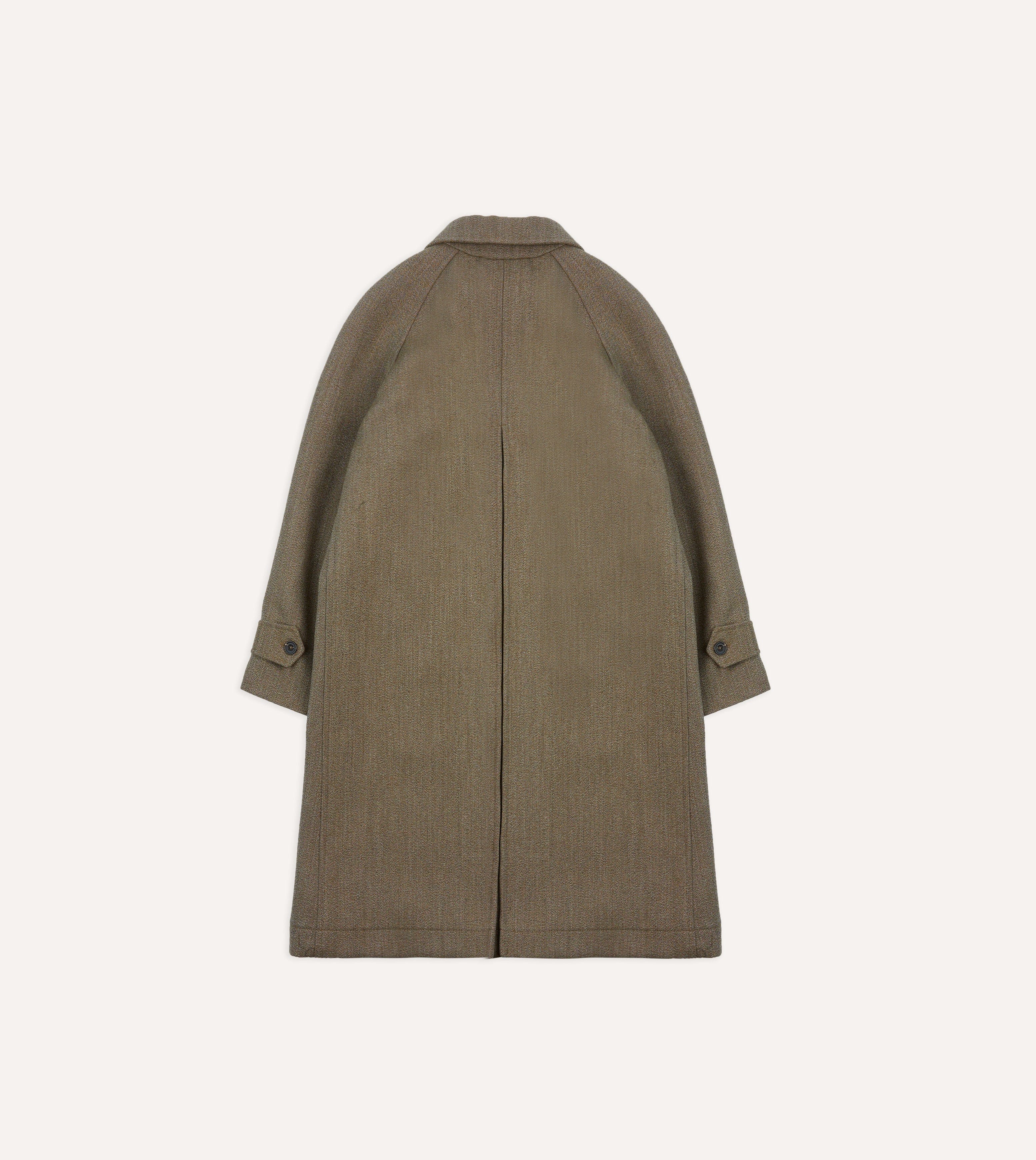 Unstructured and practical in design, the coat features a sturdy, serviceable collar and buttoned sleeve straps to defend against the elements, while split raglan shoulders, a fly front and considerable rear vent offer uninhibited manoeuvrability.