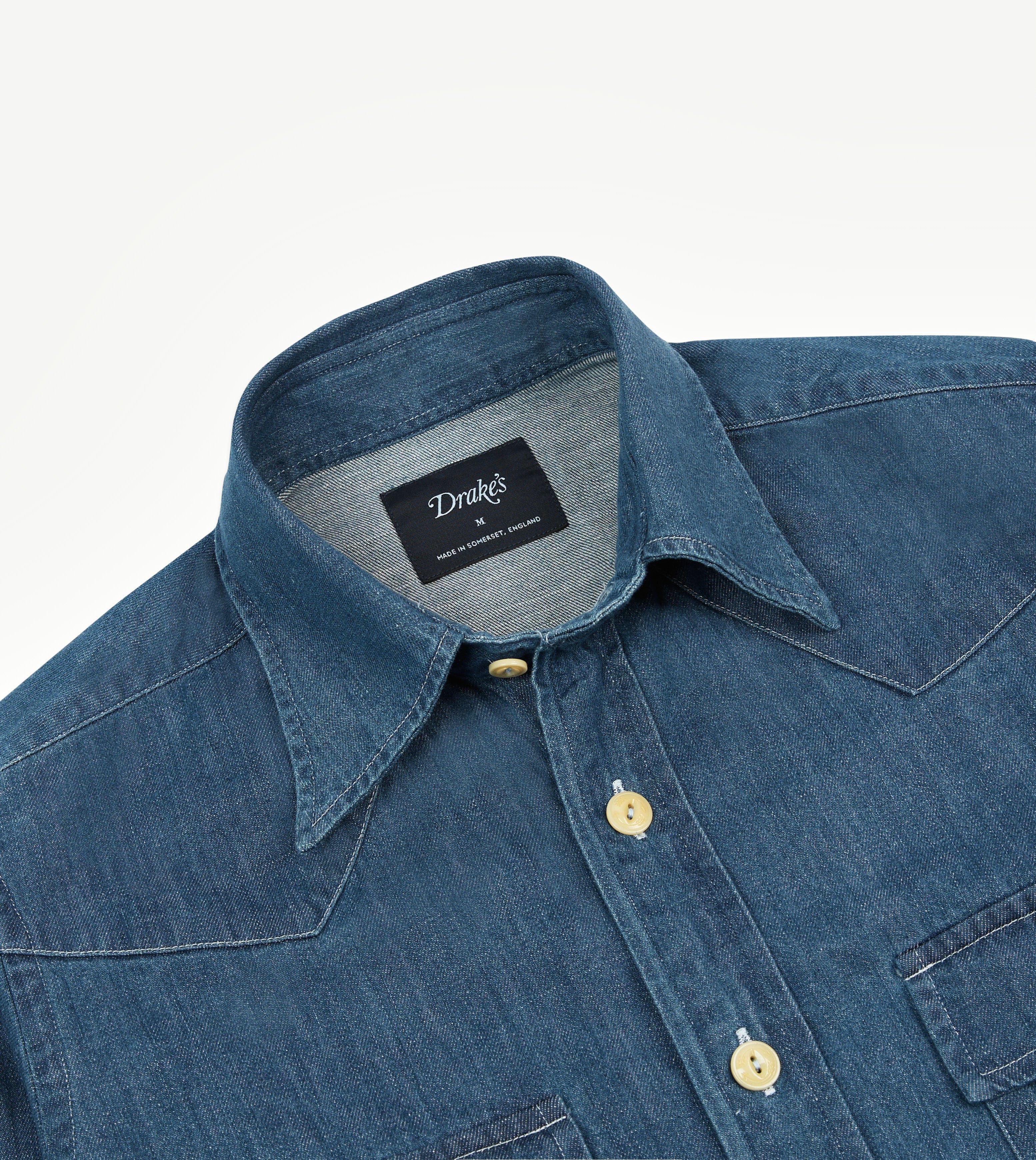 The ubiquitous Western shirt receives the Drake's treatment in the form of our usual single-needle construction and corozo buttons.
