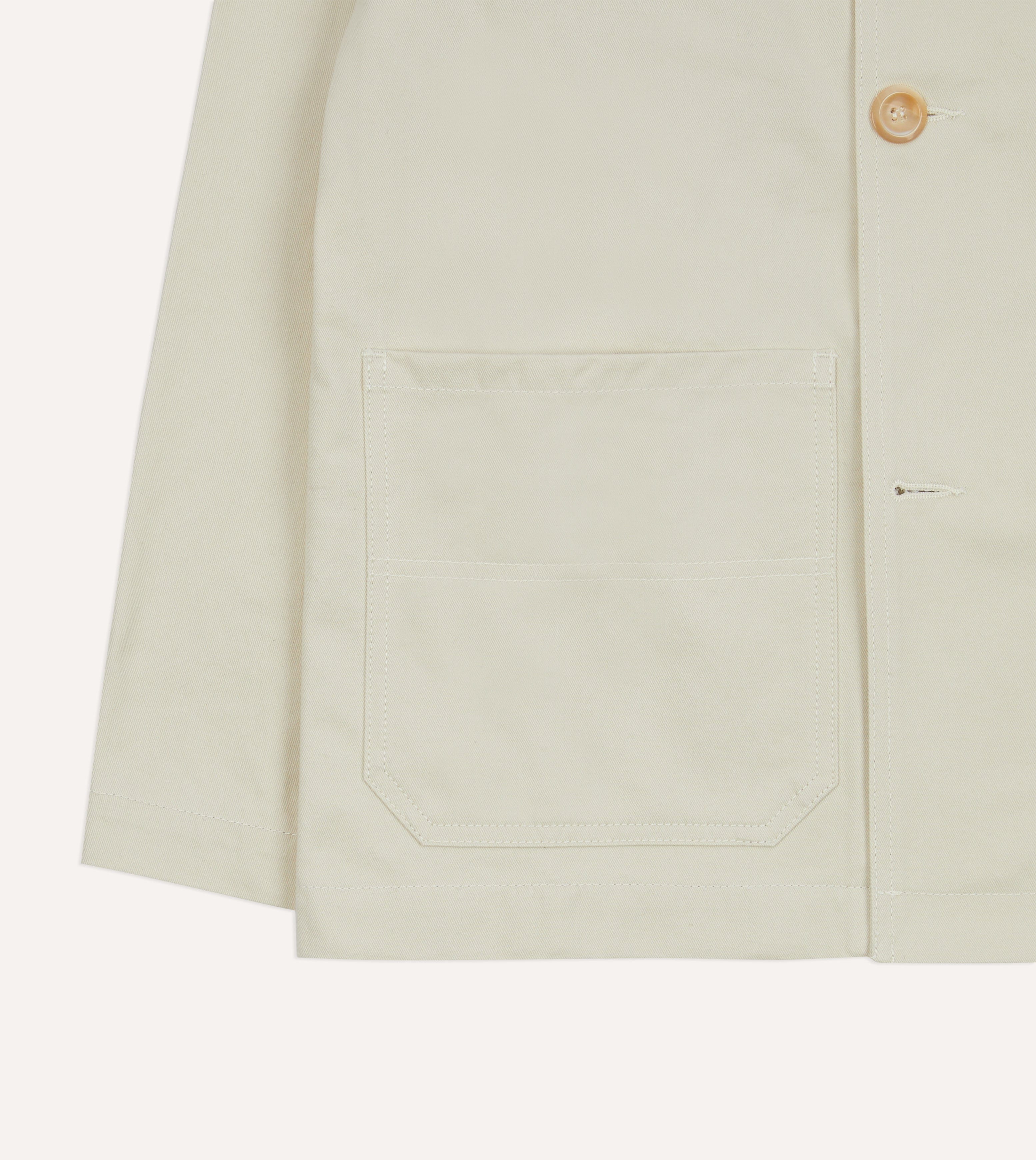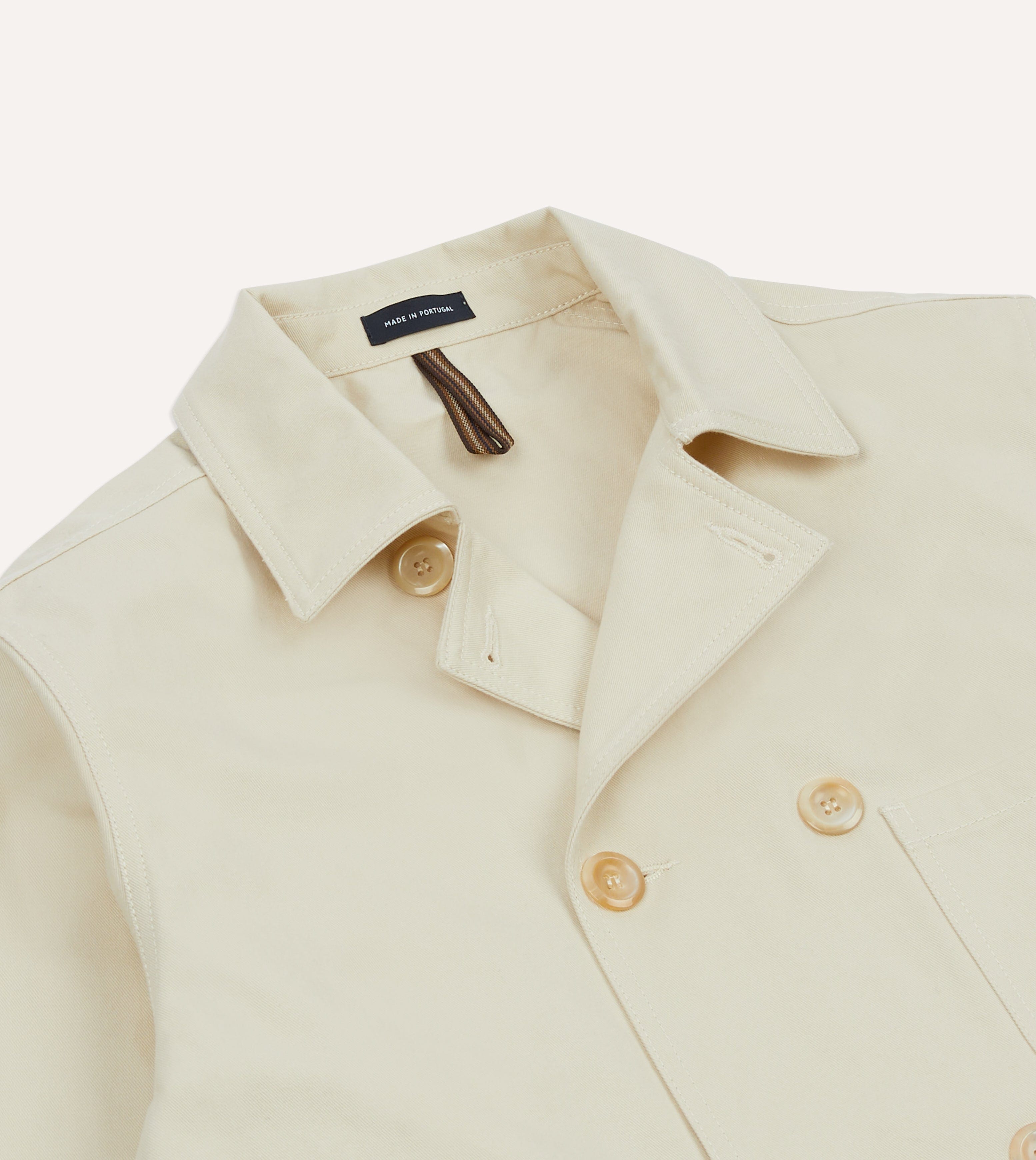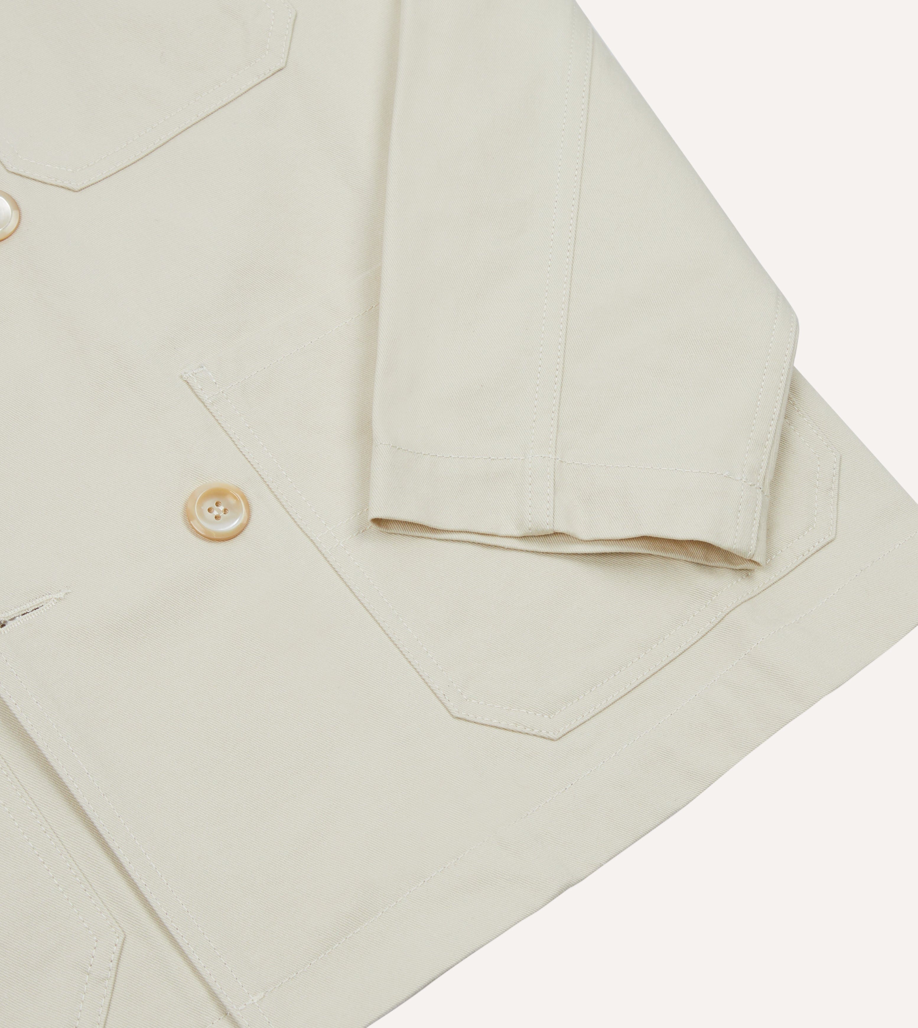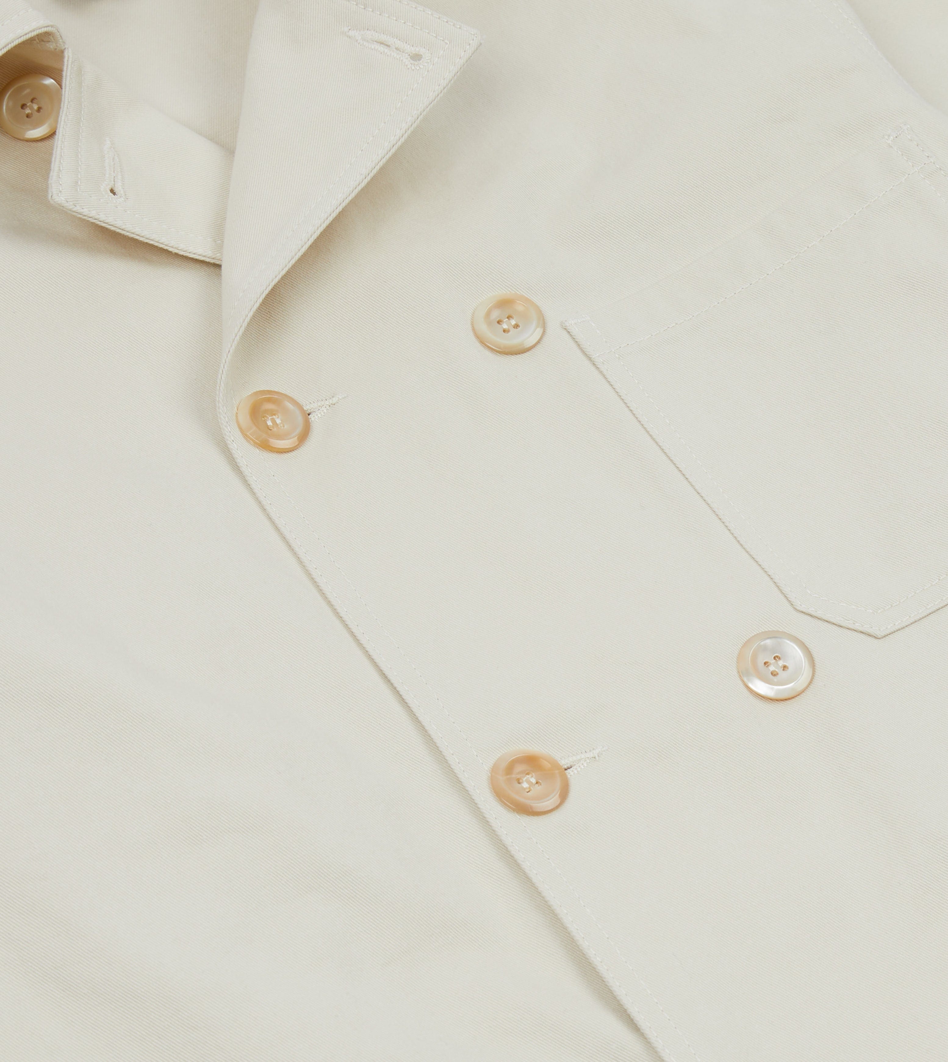 A new double-breasted style of our signature chore jacket, drawing on the hardwearing clothes worn by sculptors, painters, poets and stevedores throughout the 20th century. Made from a hardy 8.8oz Japanese vintage washed chino cloth, the jacket features 4x2 mother of pearl buttons and three ample outside pockets, along with twin internal poacher pockets.