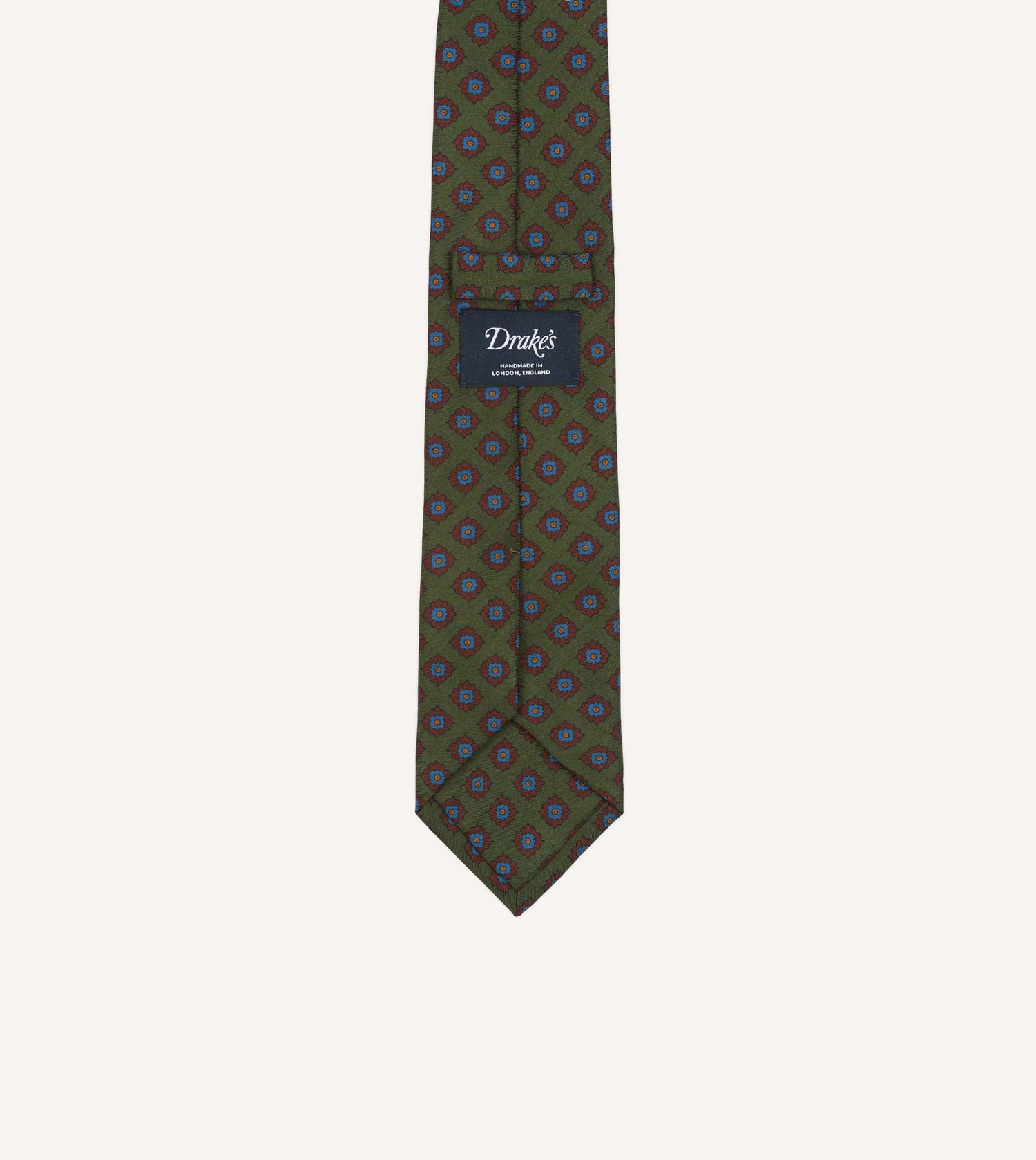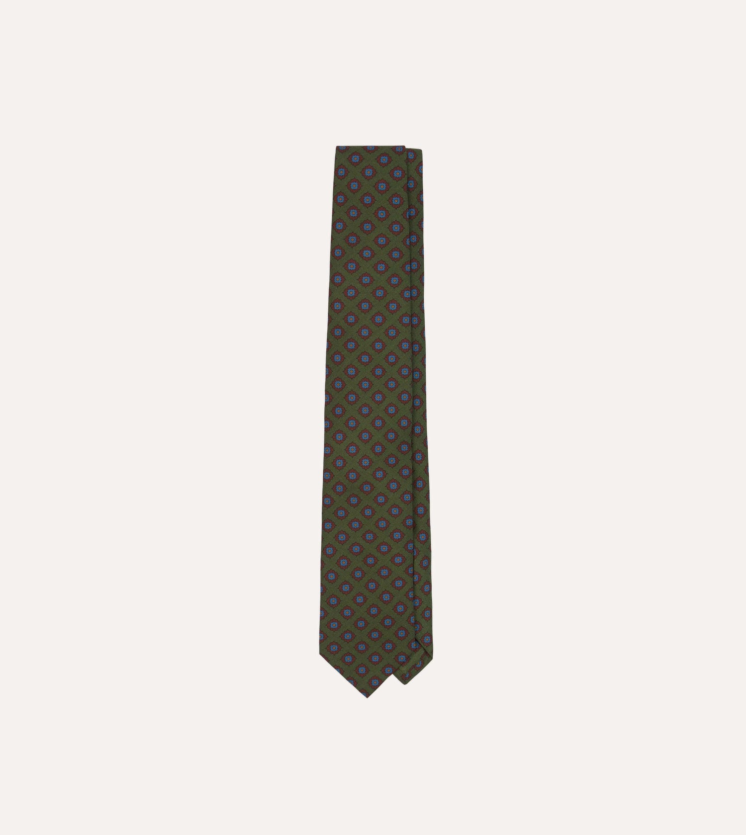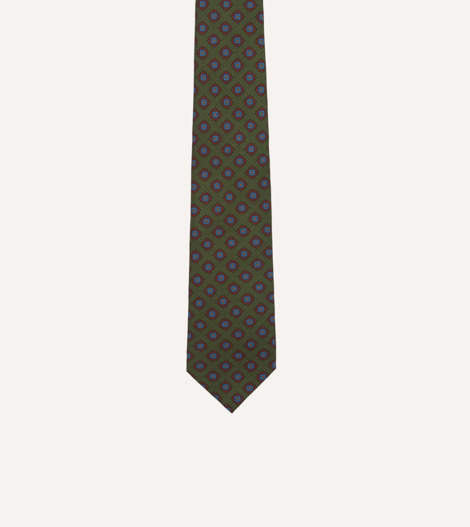 Green Square Flower Medallion Print Silk Self Tipped Tie