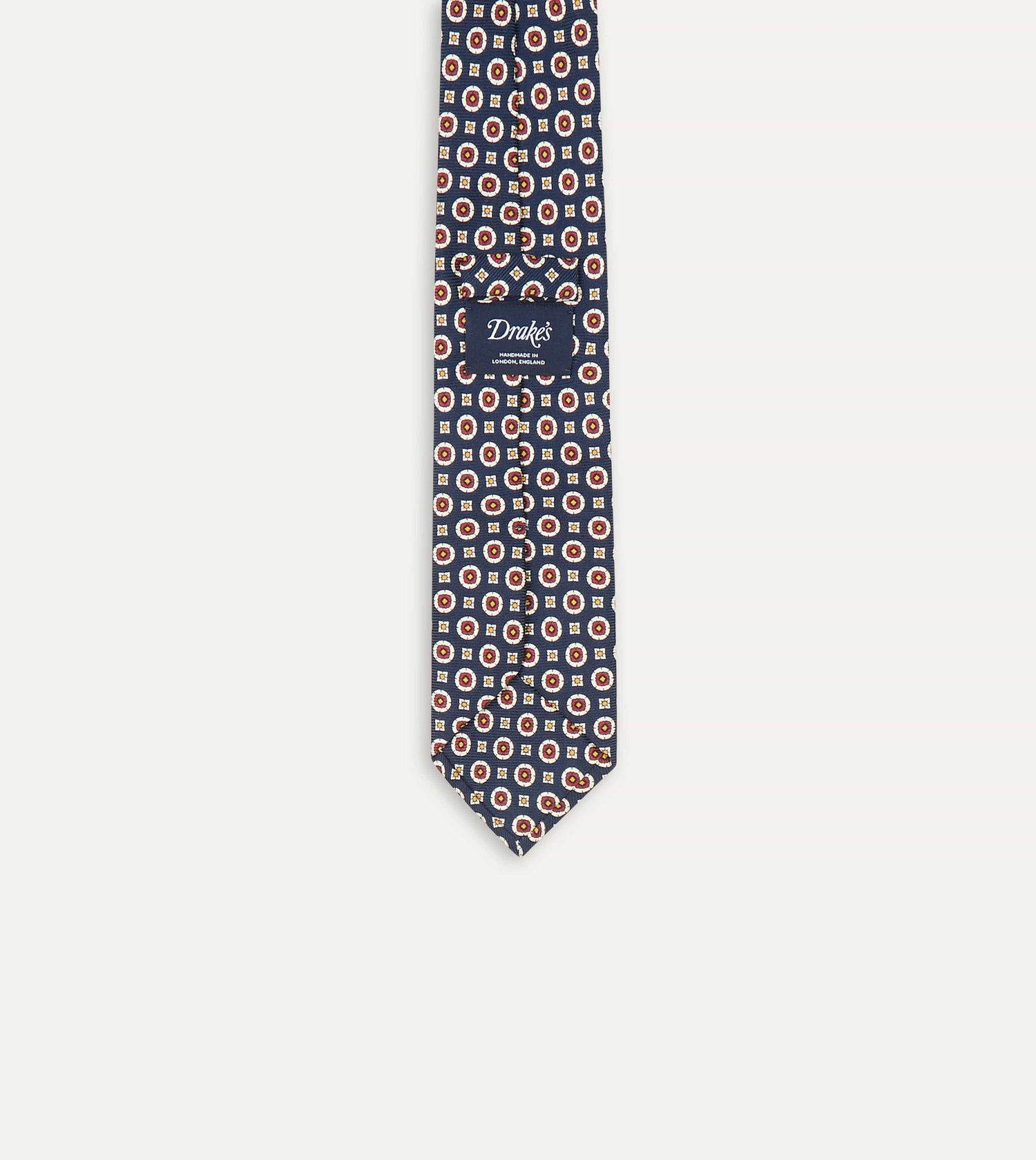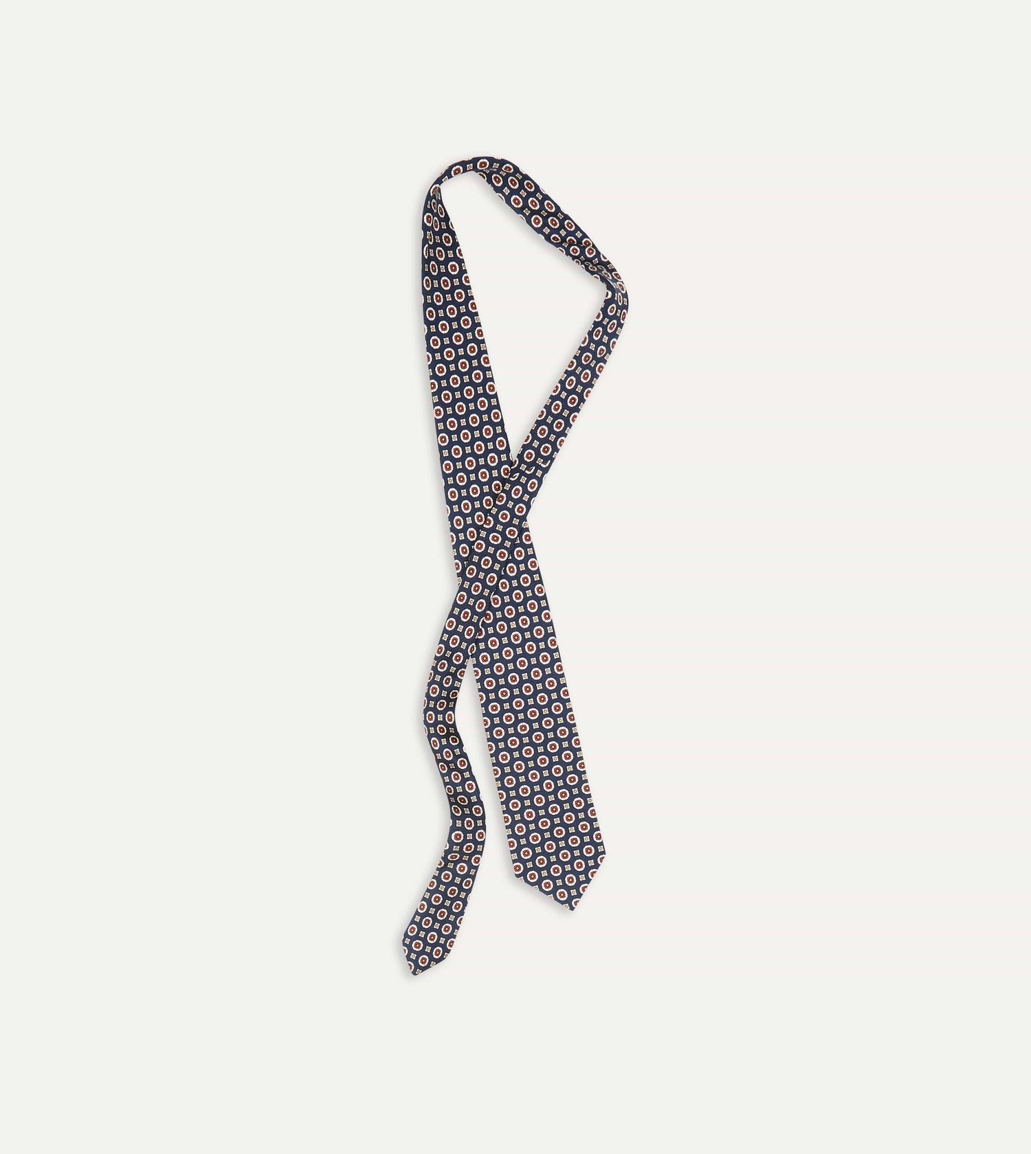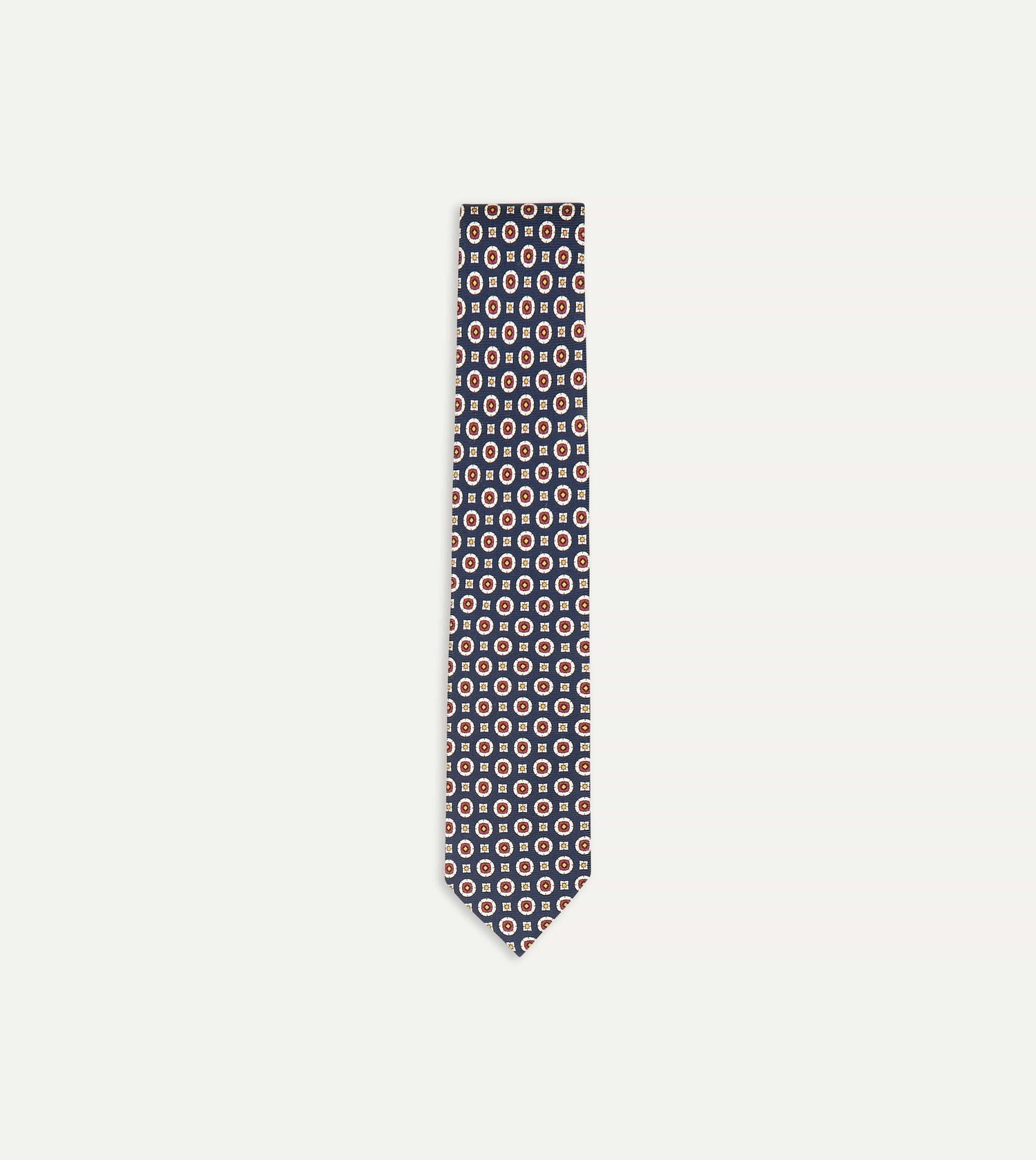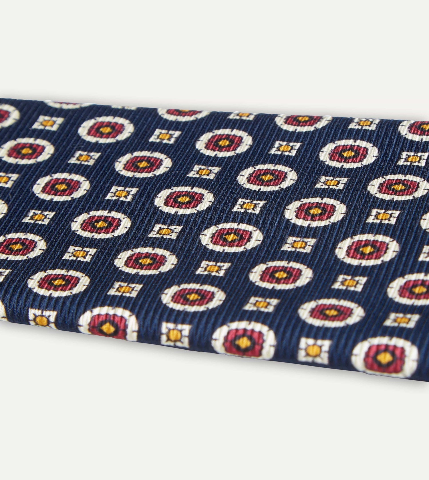 Navy and Red Geometric Medallion Print Silk Foulard Tie