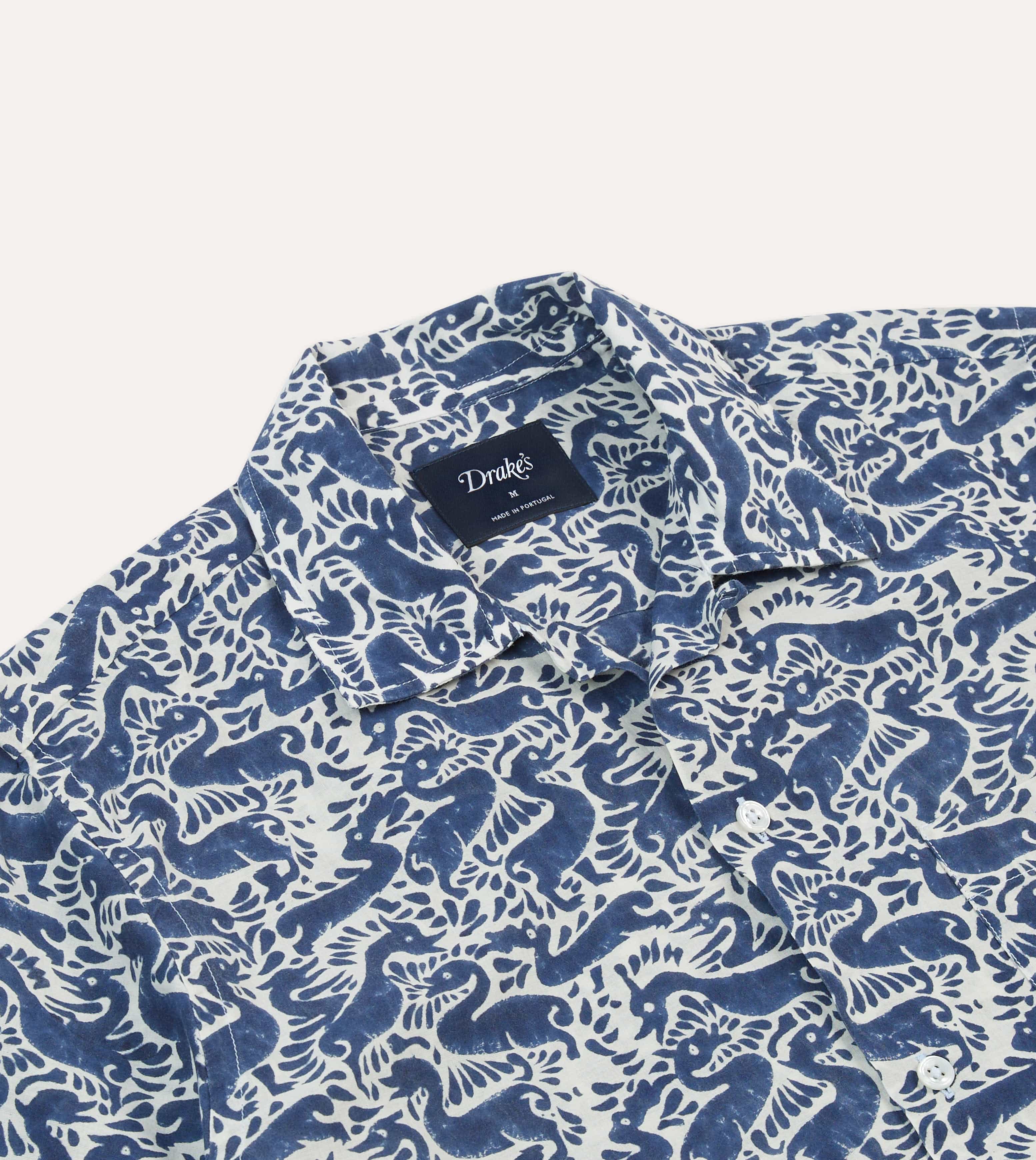 Navy Duck Block Print Cotton Camp Collar Short Sleeve Shirt