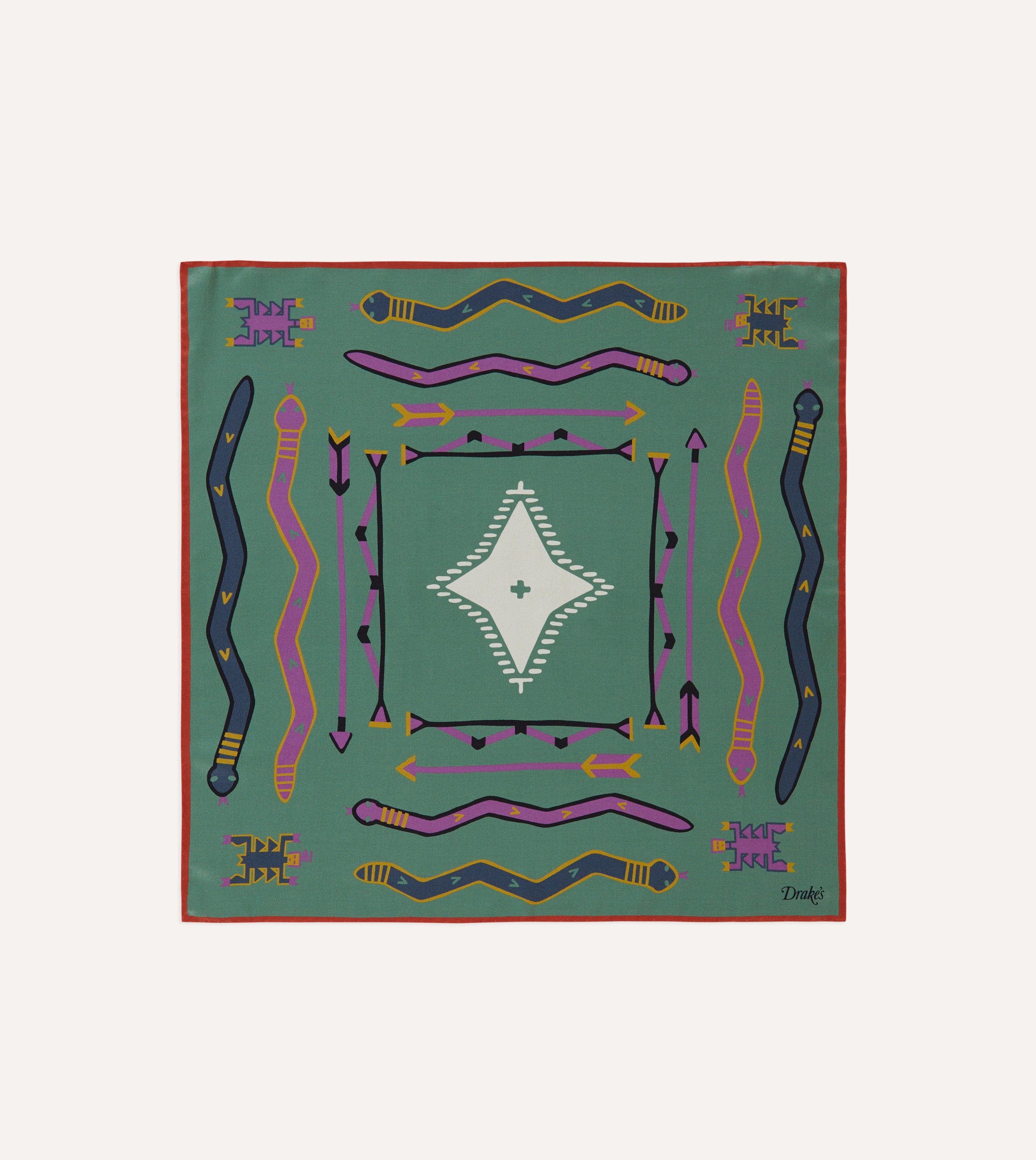 Taken from our extensive design archive, this tribal motif has been vividly applied to a pure silk, creating a dynamic visual contrast however it is folded (or stuffed) in one's pocket.