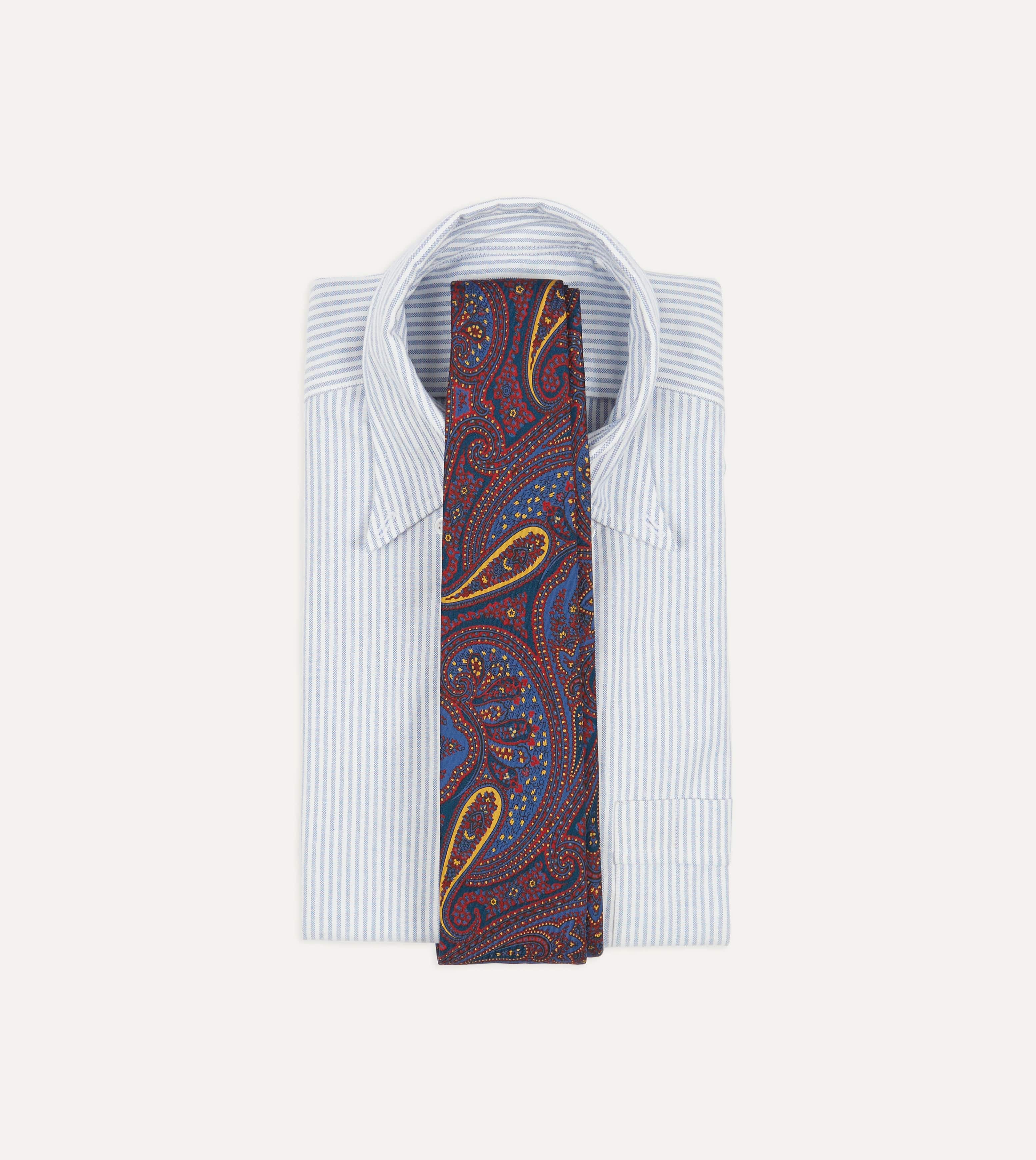This design, direct from our extensive archive and printed on a substantial madder twill silk, features a classic paisley, and is reminiscent of the elegant late 1960s neckwear favoured by rockstars and royalty alike. The tie is pure silk with hand-rolled blades, made by hand in London.
