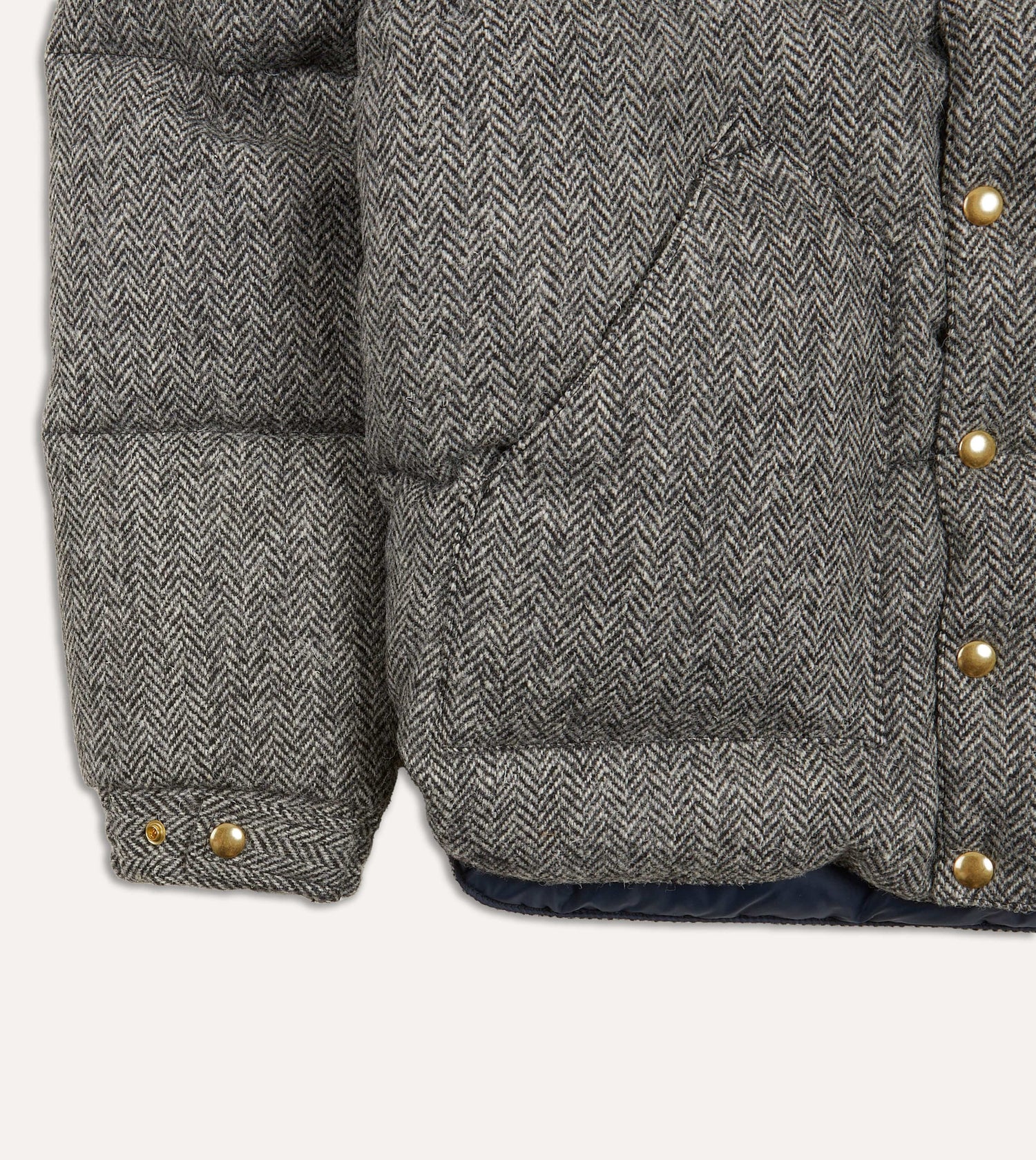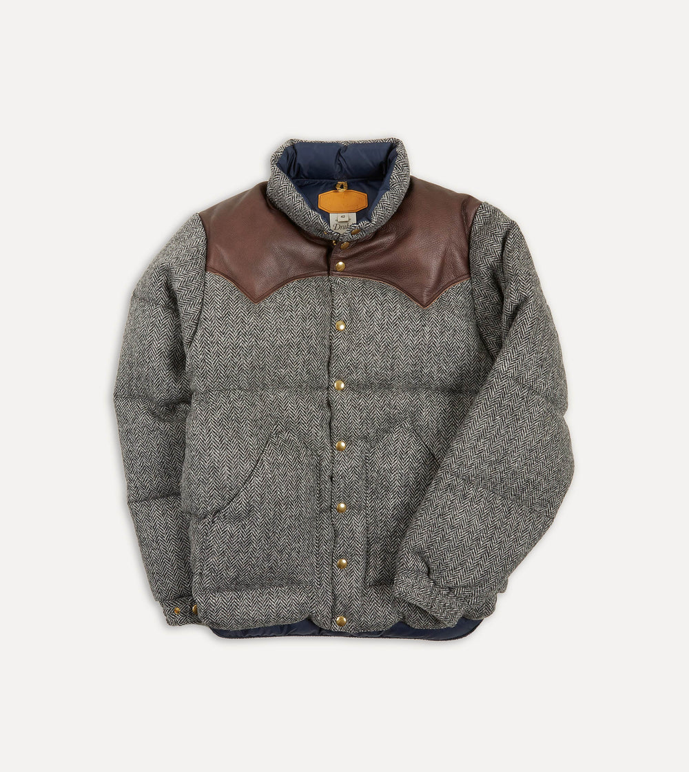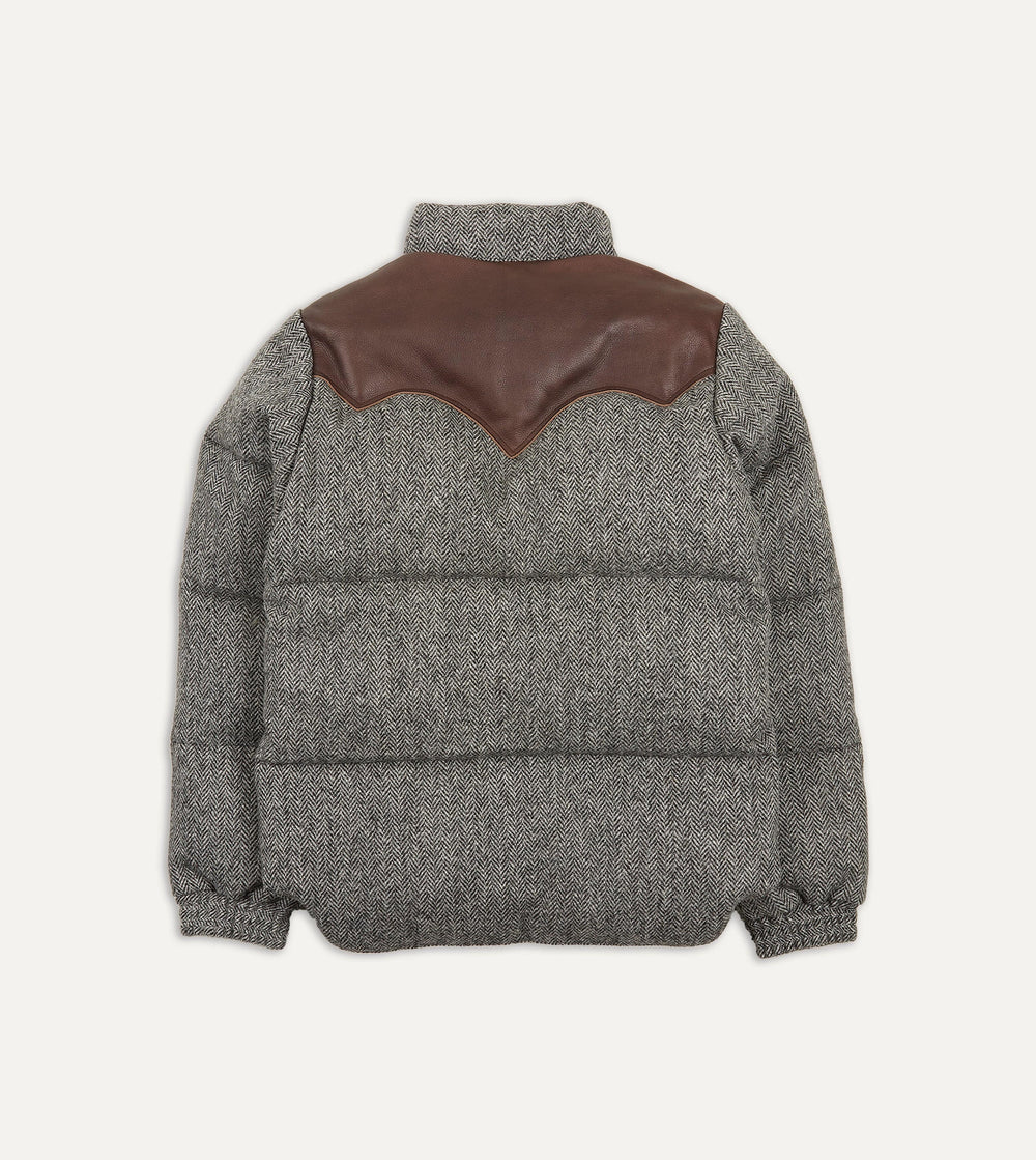 Rocky Mountain Featherbed for Drake's Herringbone Harris Tweed Leather Christy Down Jacket