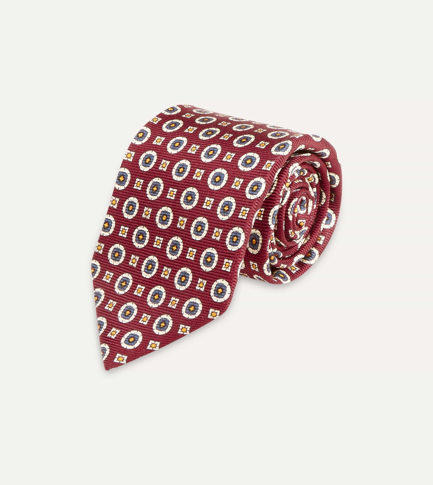Red and Blue Geometric Medallion Print Silk Foulard Tie