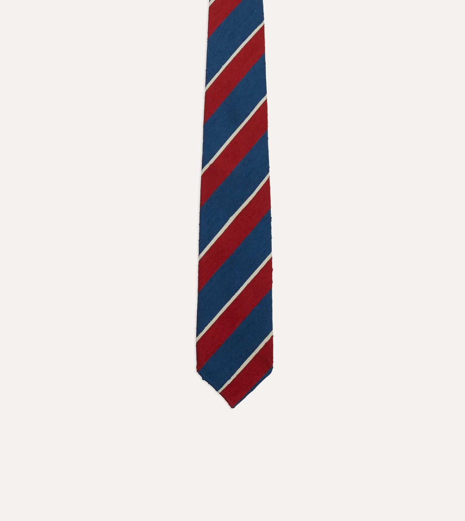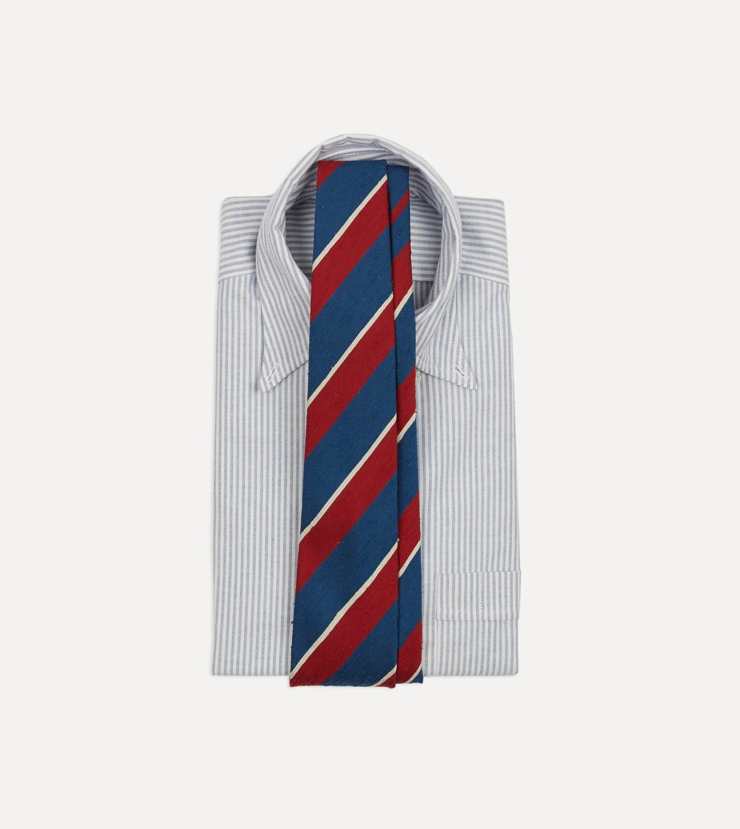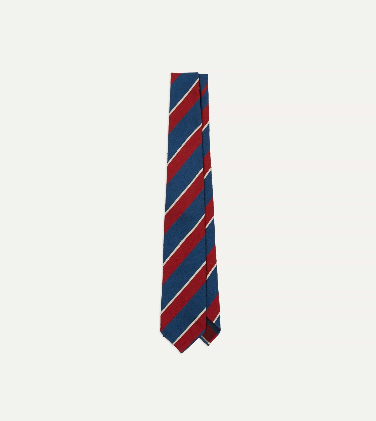 An elegant necktie, handmade in London from Shantung silk, known for its natural slub, featuring a stripe redolent of earlier periods of style, while retaining a distinctly modern feel.