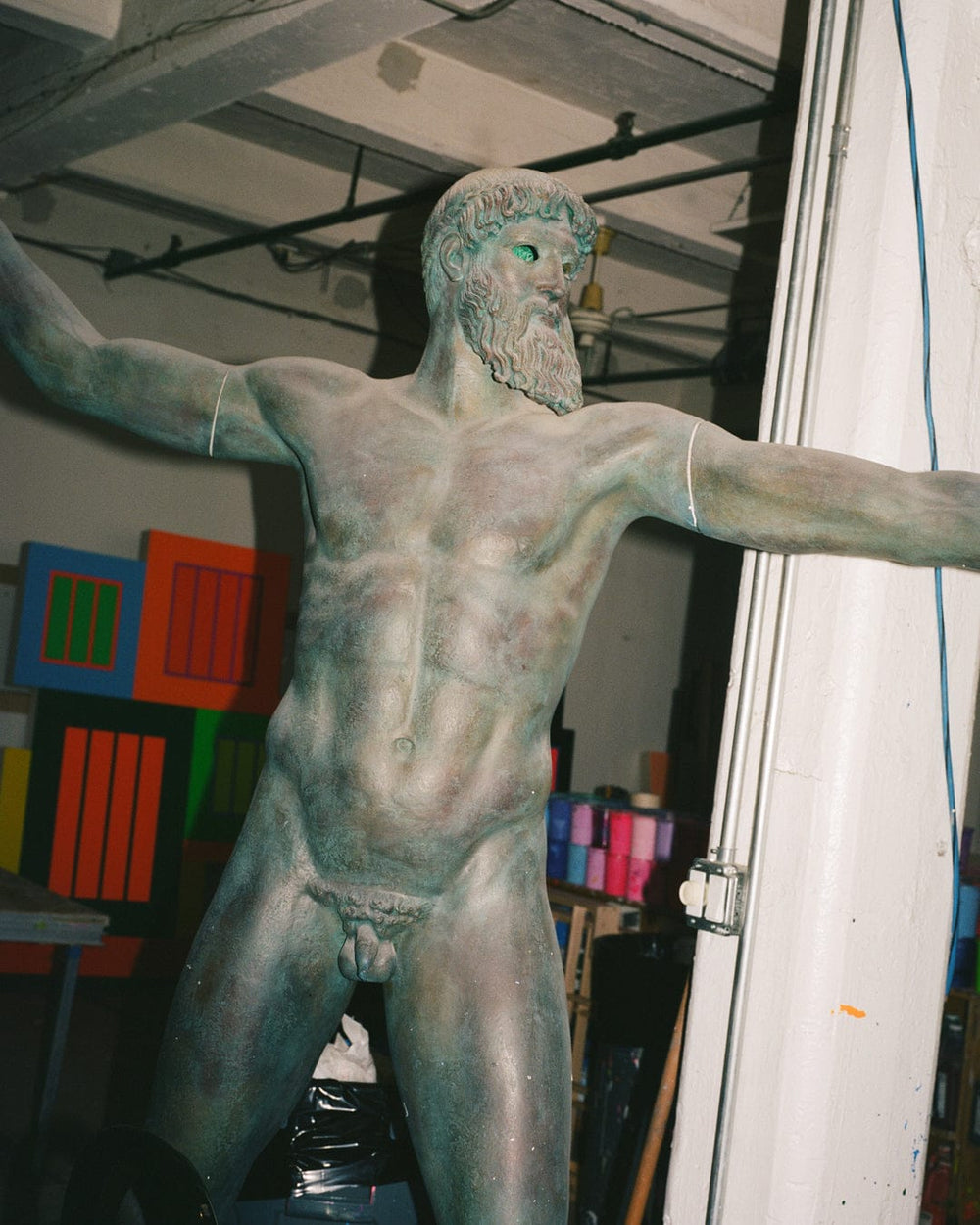 Peter’s been installed here since the mid-90s. His studio gazing out over the Hudson River. In the centre of the studio, pride of place and incongruous among his fluorescent-coloured geometric paintings, is a reproduction of a statue of Zeus, often referred to as The Artemision Bronze, and which is immediately recognisable to anyone who's been to Athens and seen the cheap copies in tourist shops that line the base of the Acropolis. Peter’s is a full-scale reproduction, shipped back to New York from a trip 25 years ago.