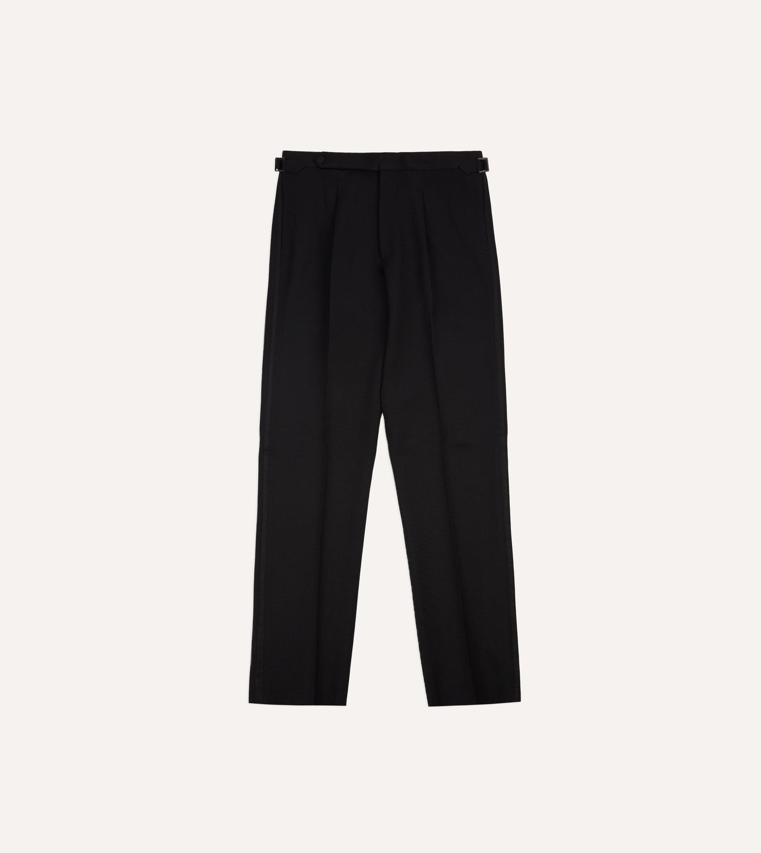 Crafted from a textured barathea wool cloth, the half-lined trousers feature understated details such as an extended tab front, French bearer buttoning with interior waistband curtaining, an after-dinner split to the rear, and six buttons for braces.