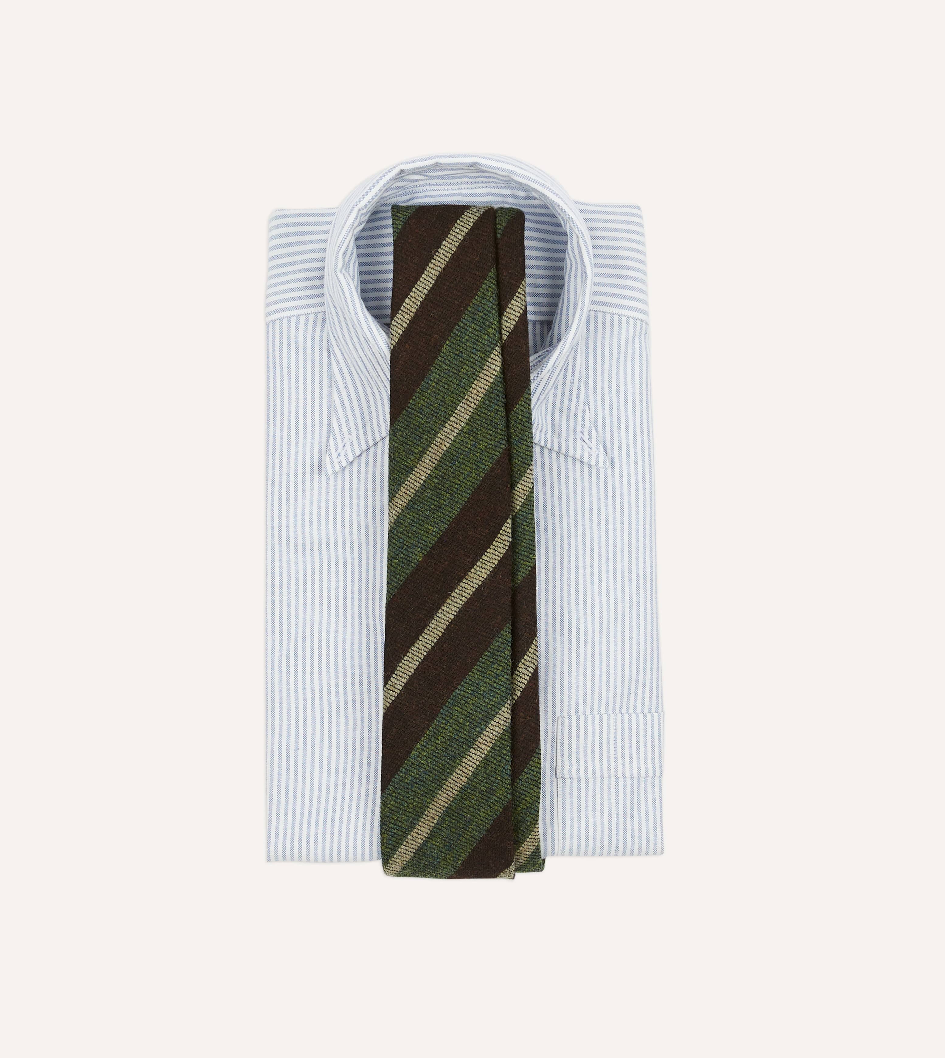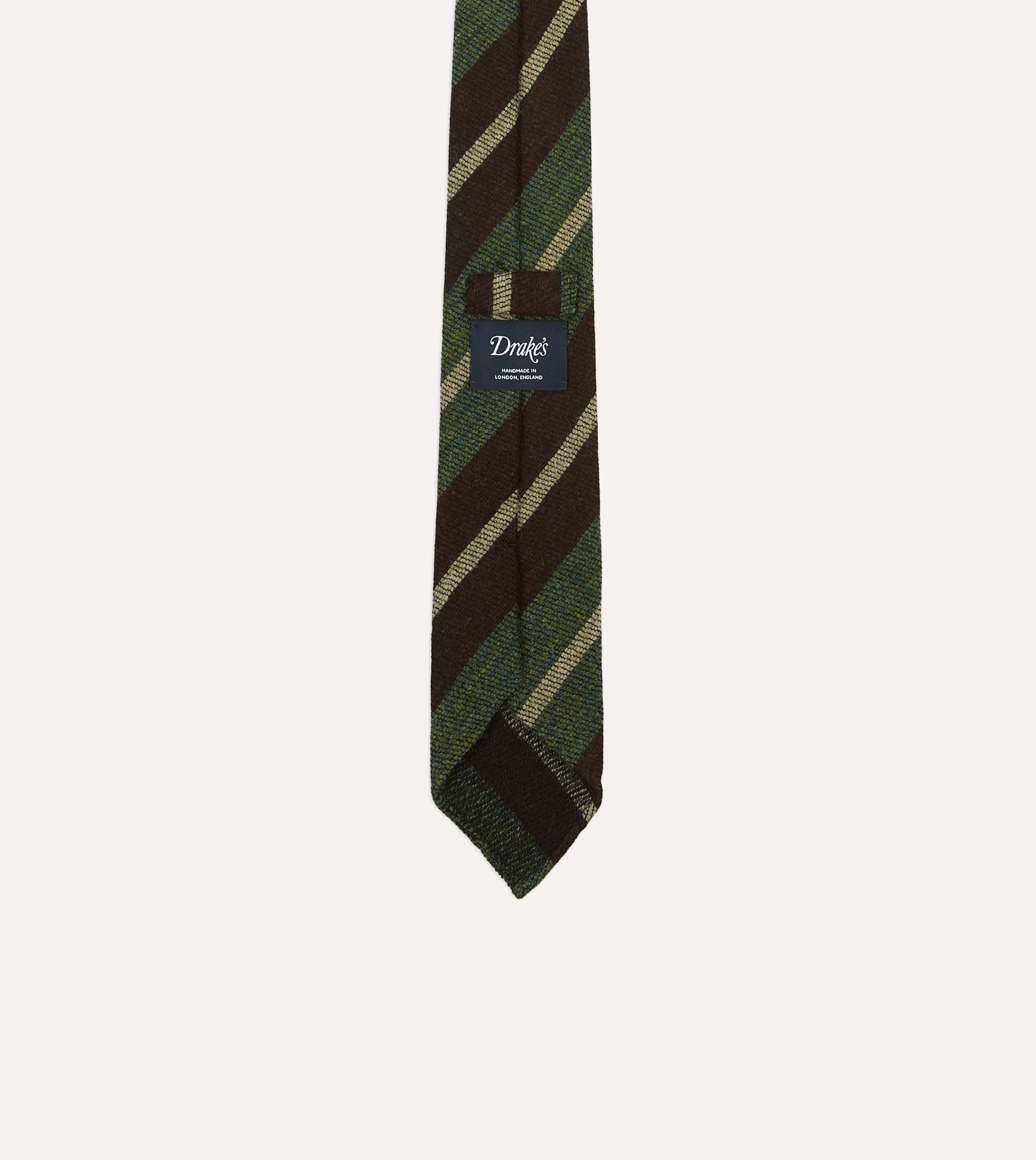 Brown and Green Block Stripe Herringbone Hand Rolled Shetland Wool Tie