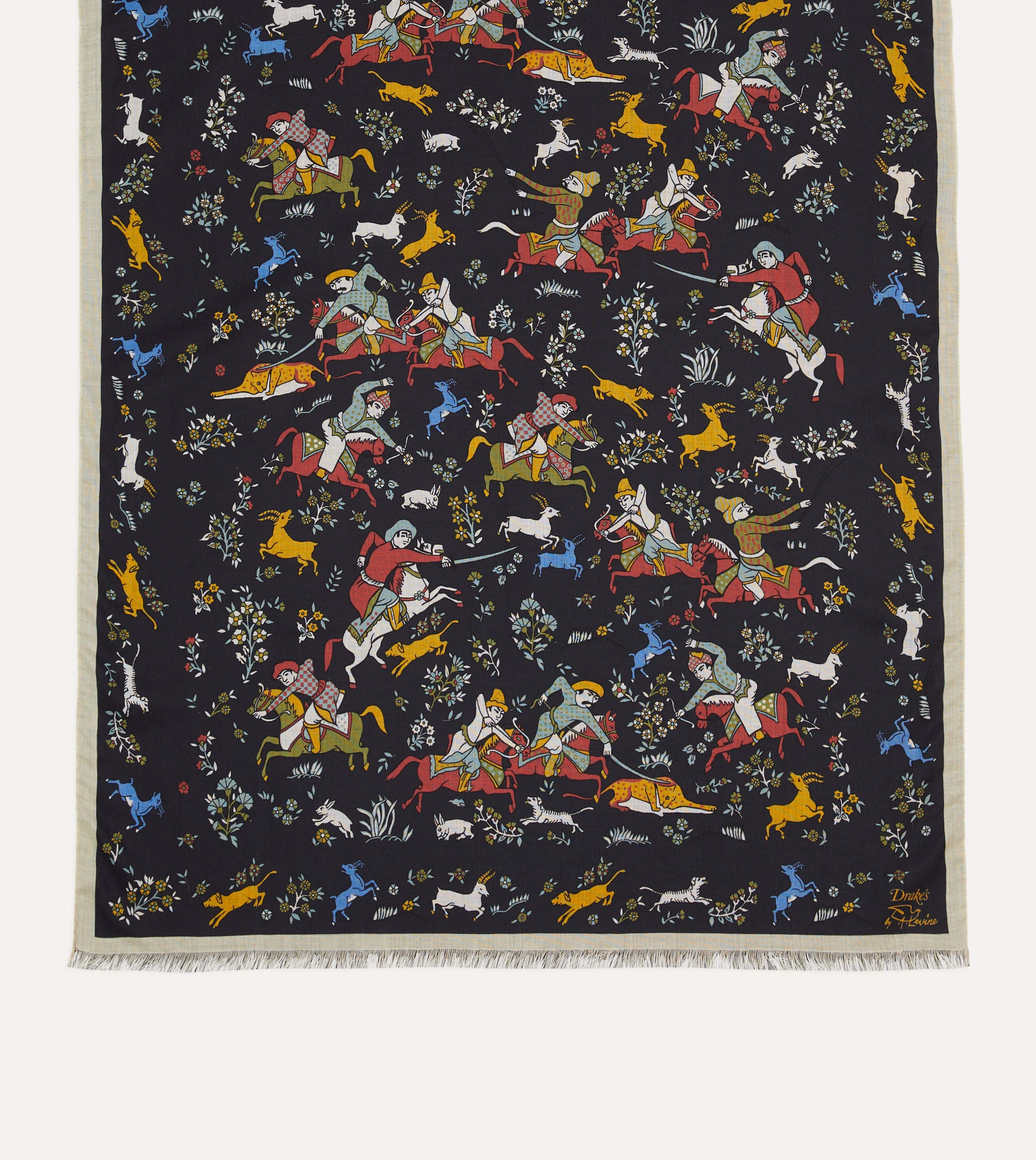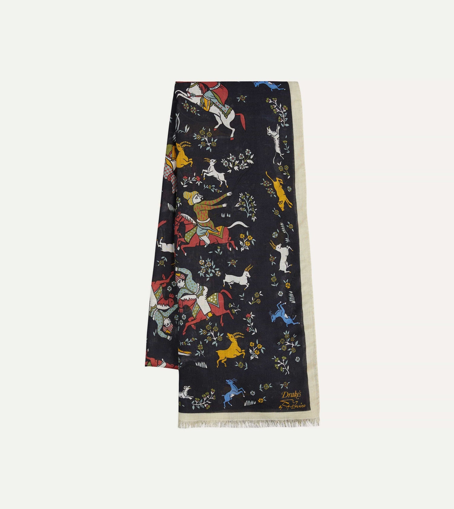 Drake's by A. Levine Black Mughal Print Wool-Silk Scarf