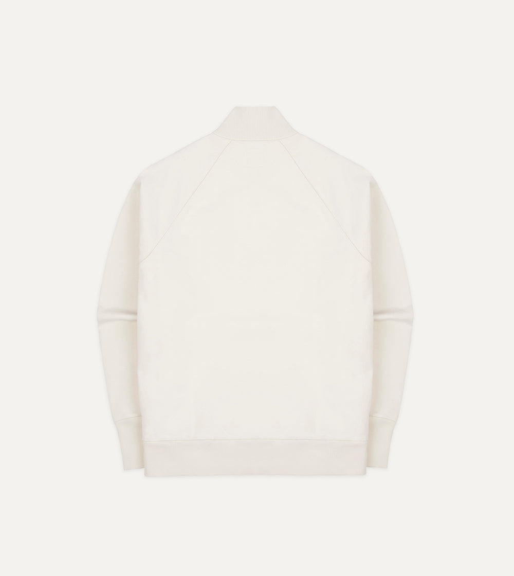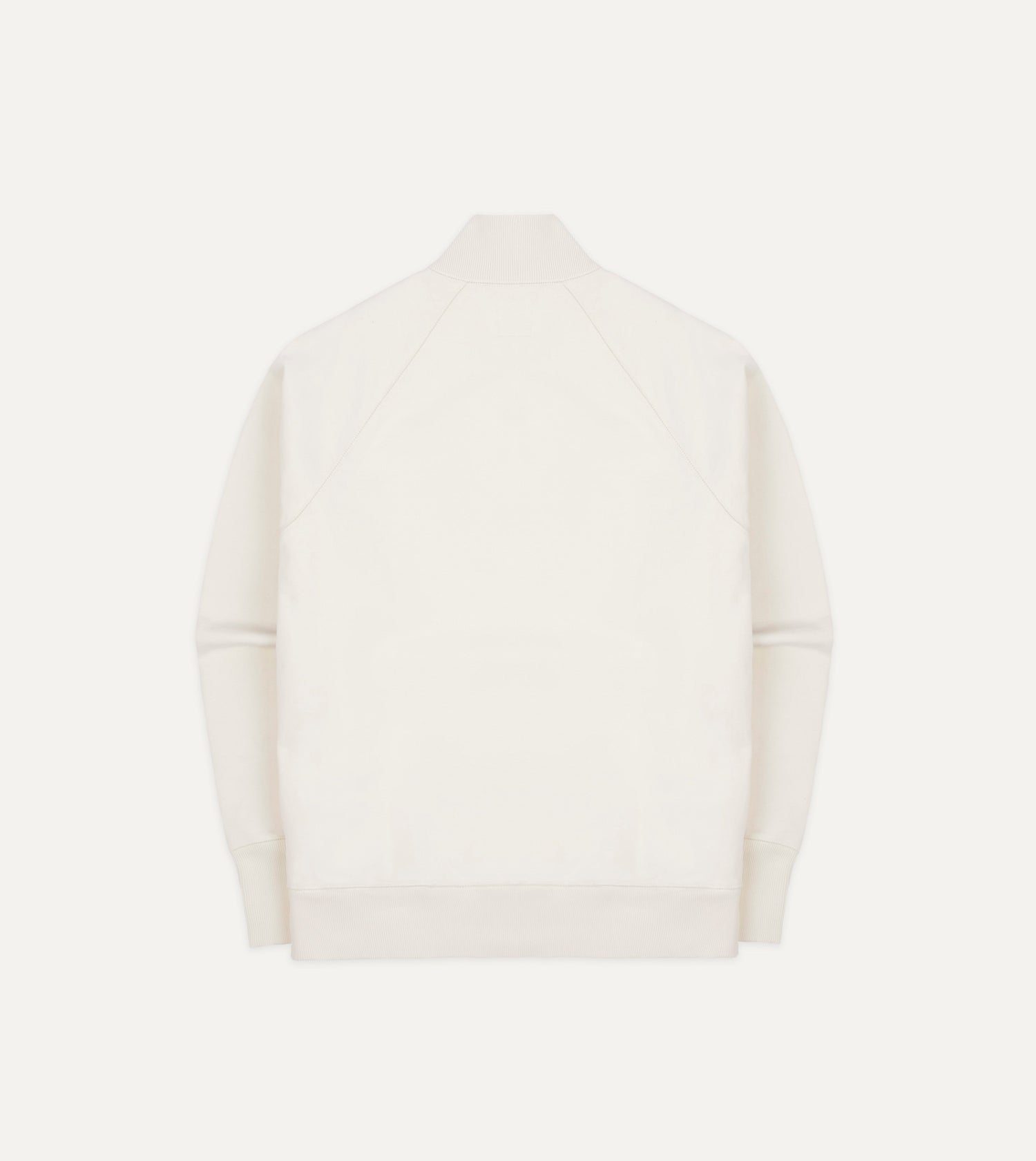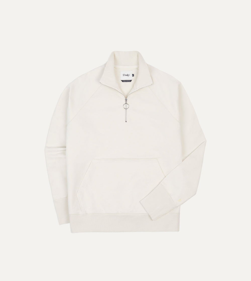 Styled after vintage examples of mid-century running gear, this quarter zip sweatshirt is made from a densely woven 16.2oz cotton jersey and features ribbed cuffs, a kangaroo pocket, raglan sleeves, and our monogram motif, chain stitched in wool on the sleeve.