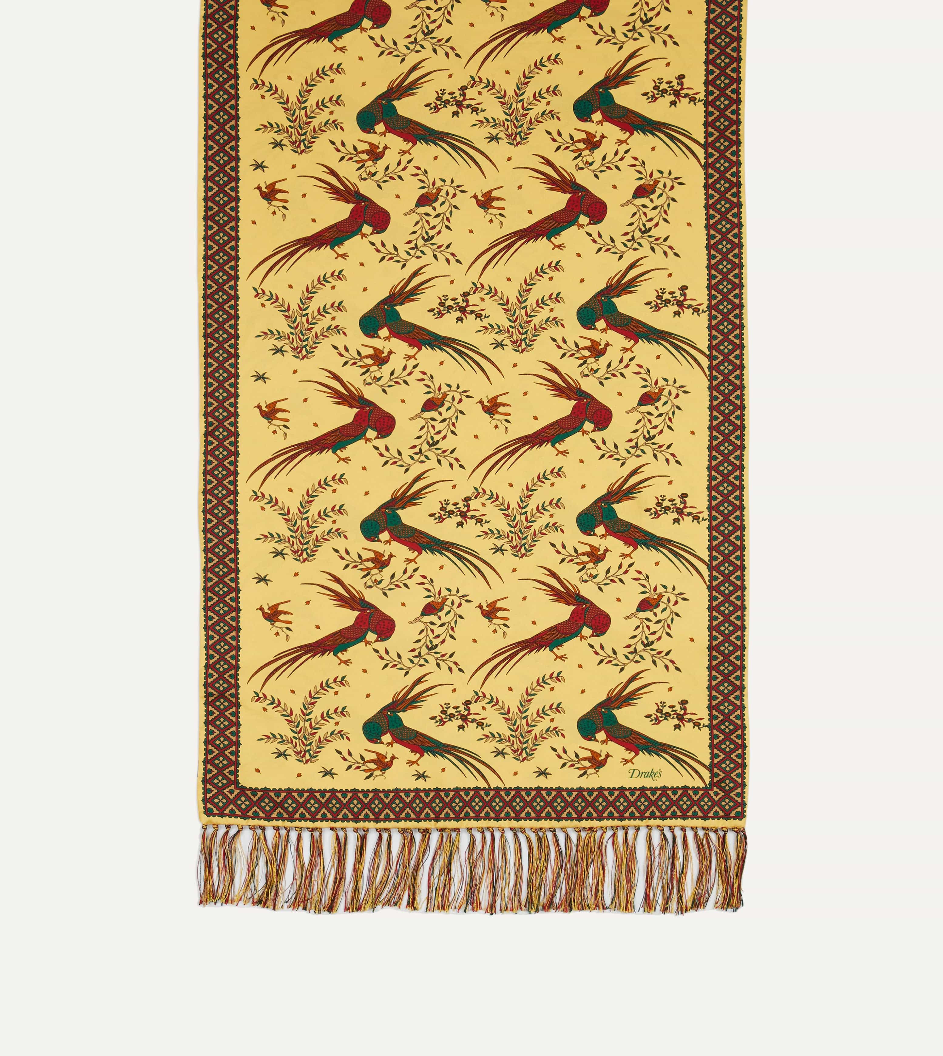 Gold Birds of Paradise Print Tubular Silk Tasselled Scarf