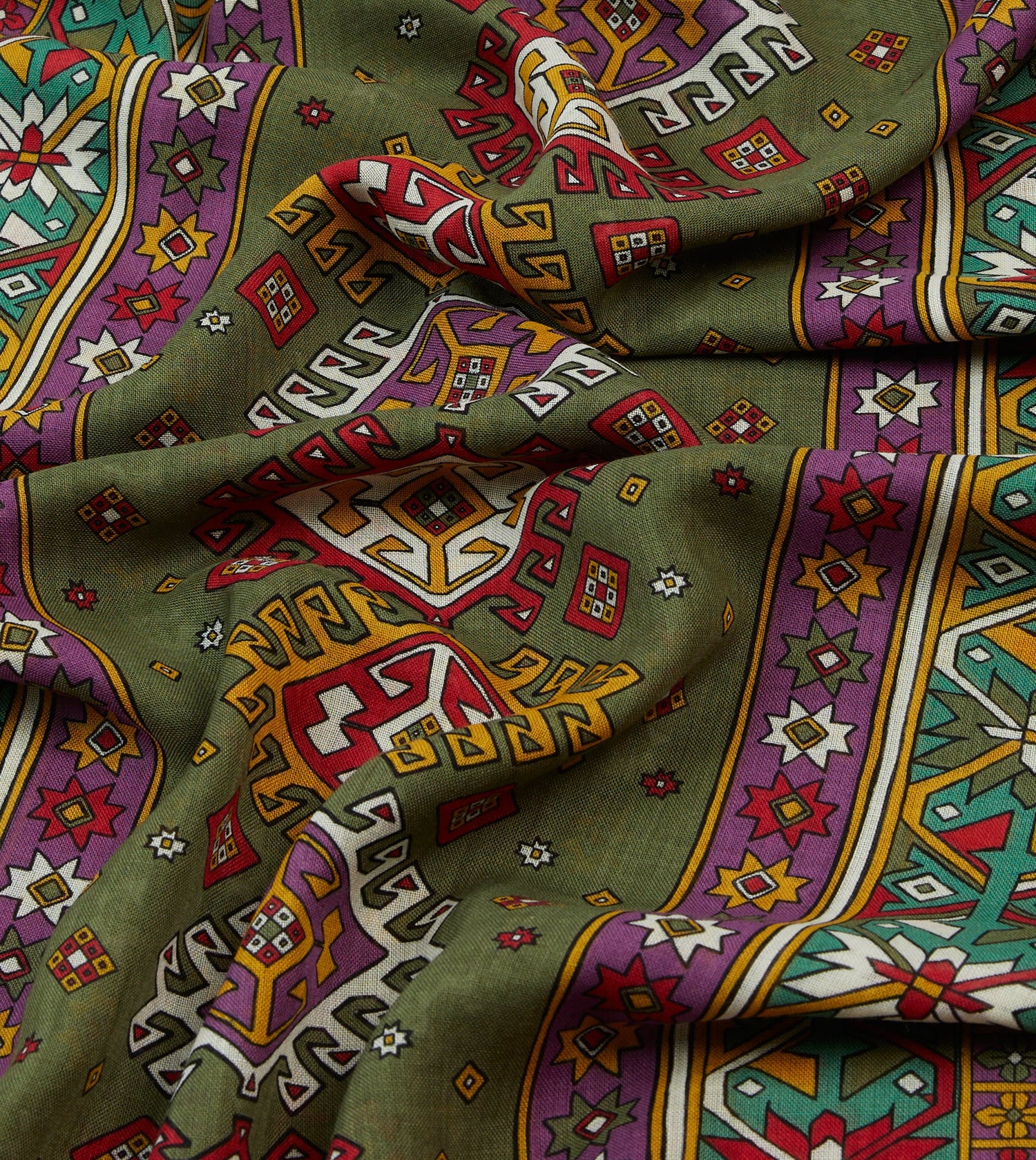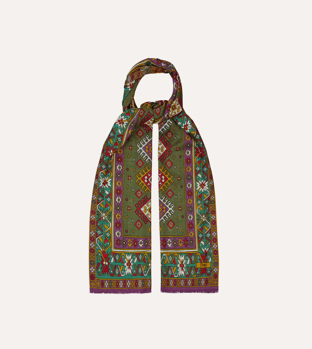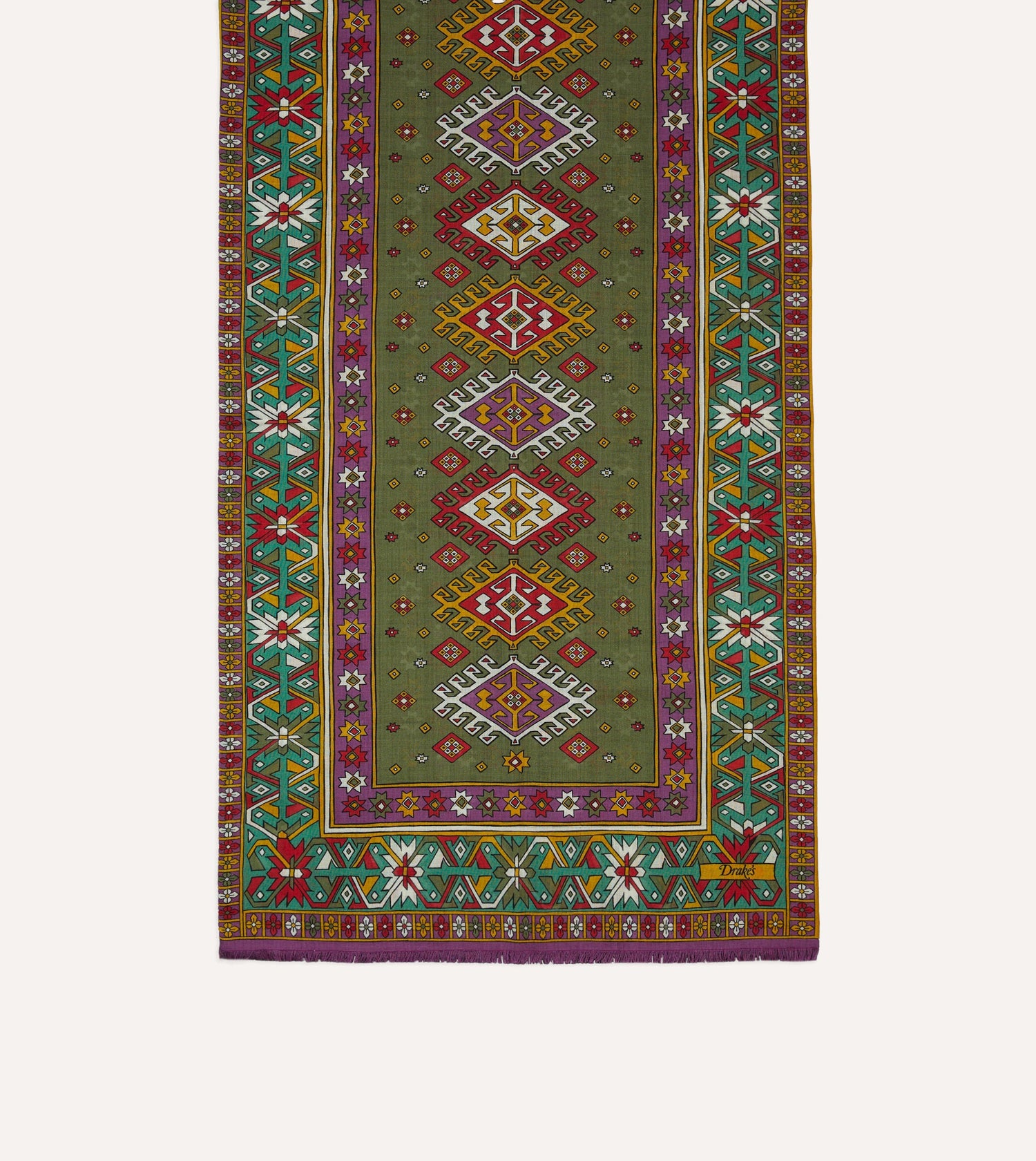 Green and Purple Kilim Print Tubular Wool Silk Scarf