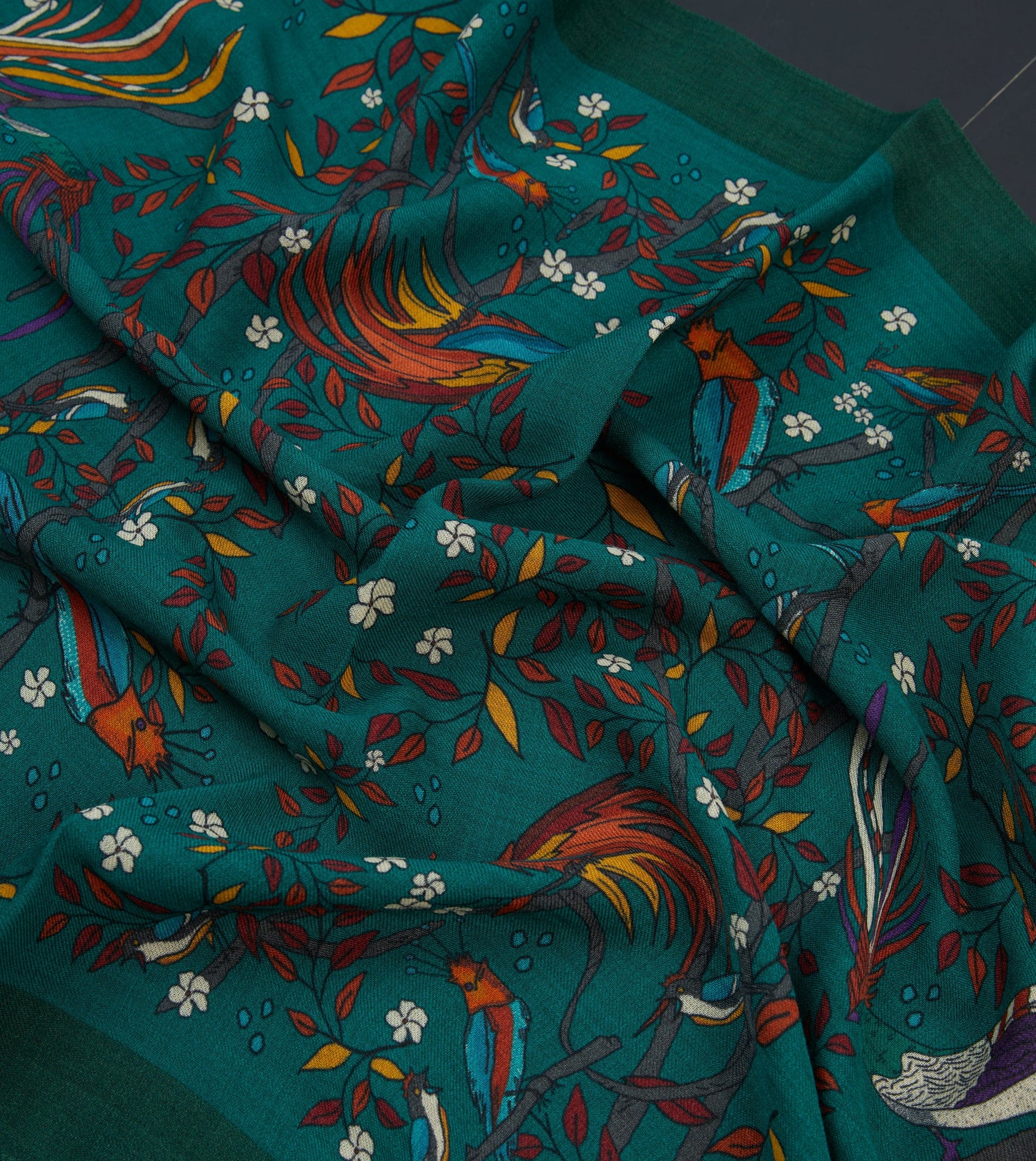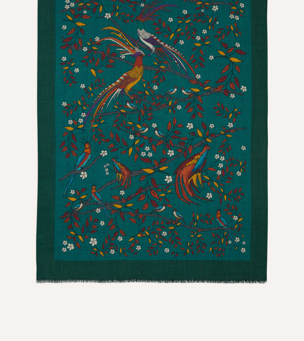 Woven from a lightweight wool, this scarf is printed with an archival birds and flowers print design and features eyelash fringing at both ends for an airy addition to your cold-weather arsenal.