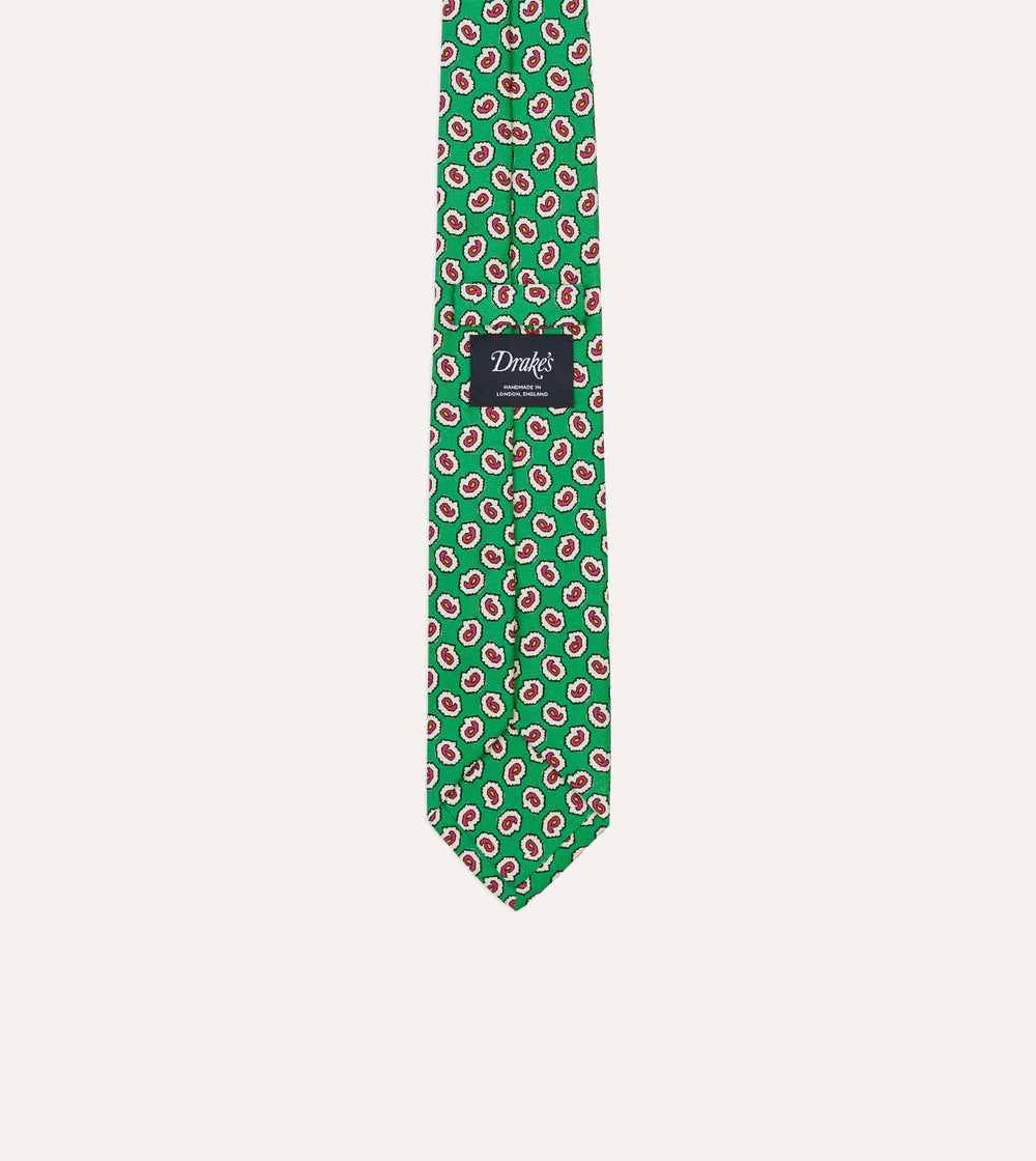 Green Small Paisley Leaf Print Silk Self Tipped Tie
