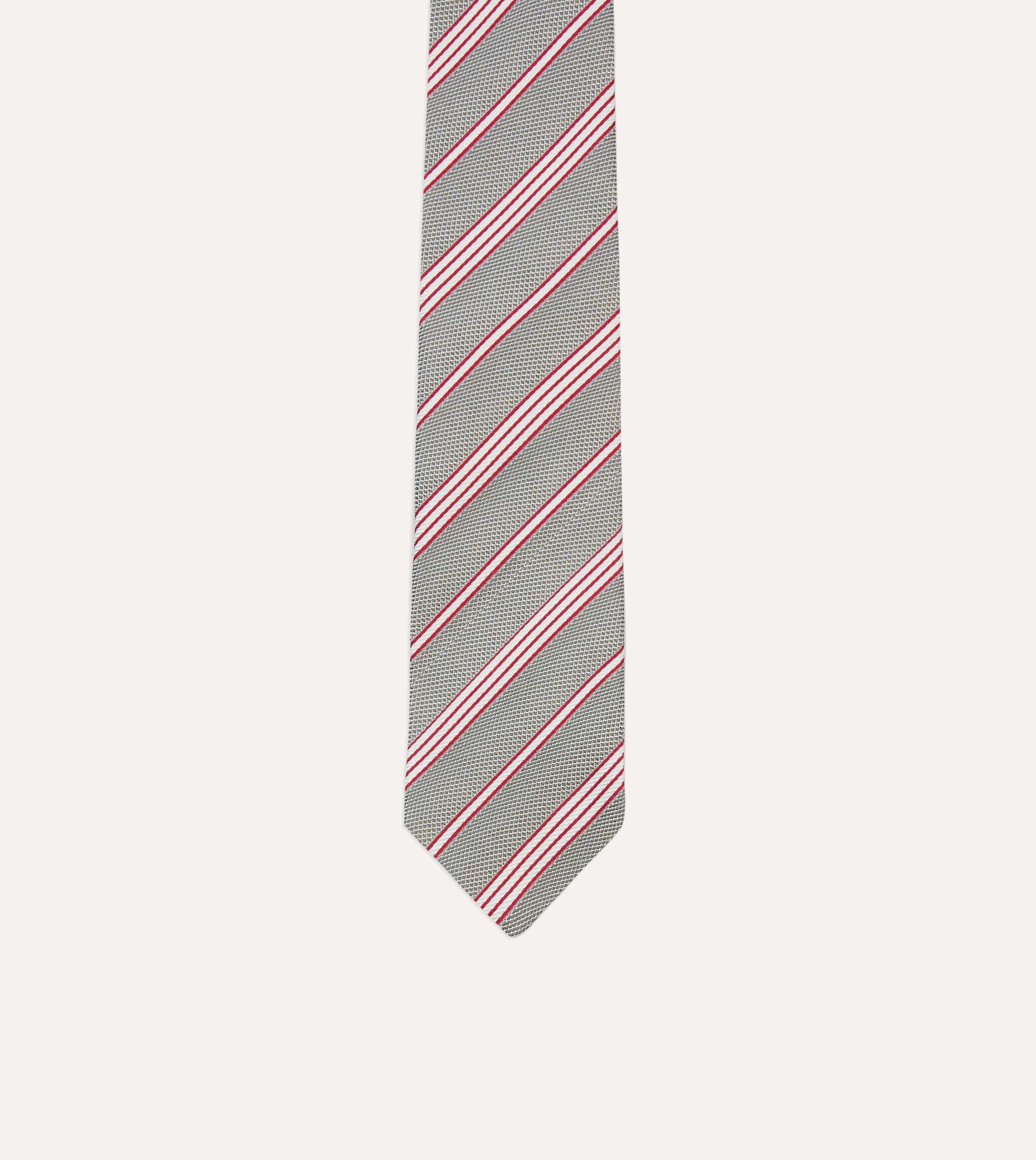 Grey, Red and Ecru Twill Stripe Tipped Silk Grenadine Tie