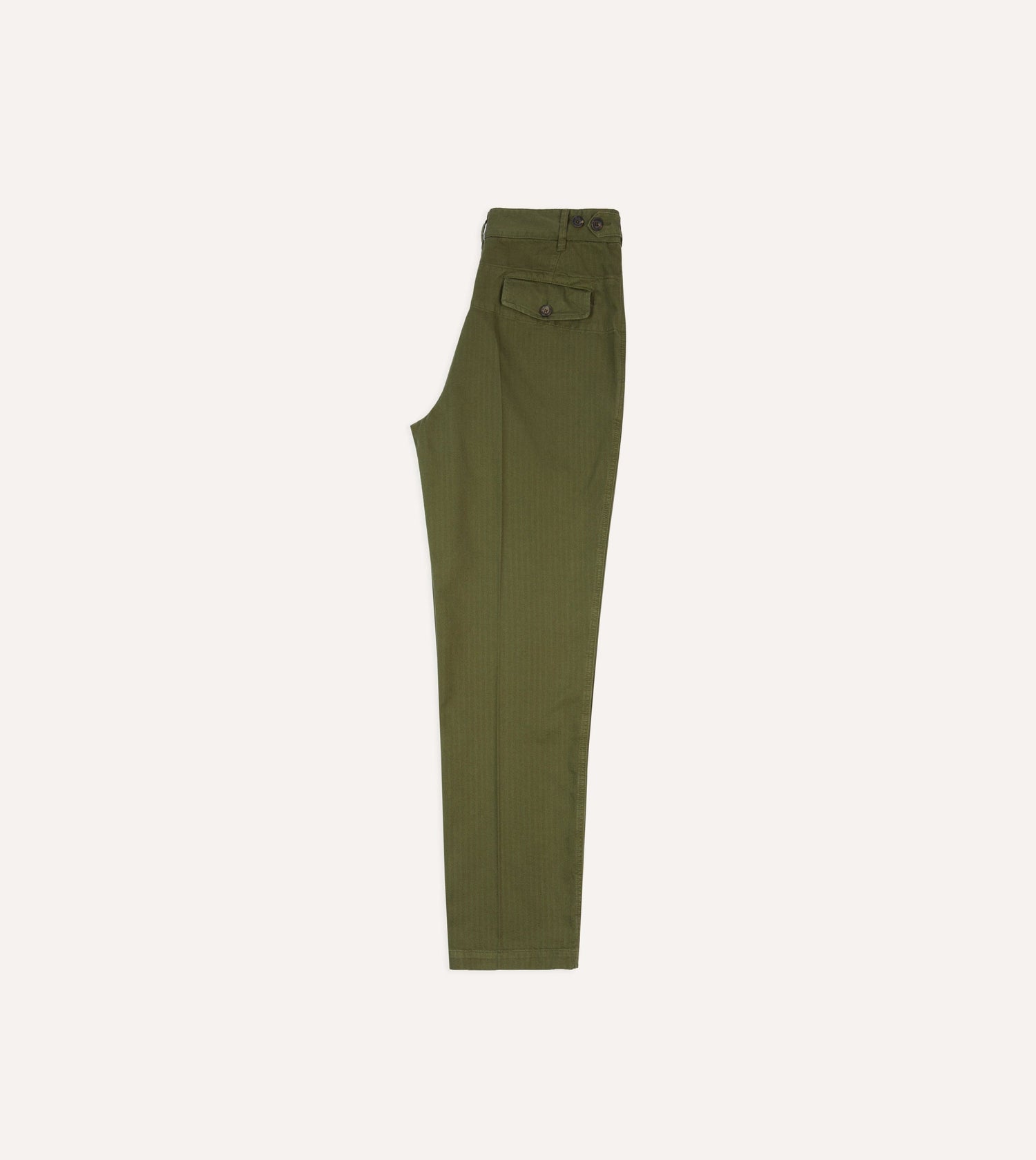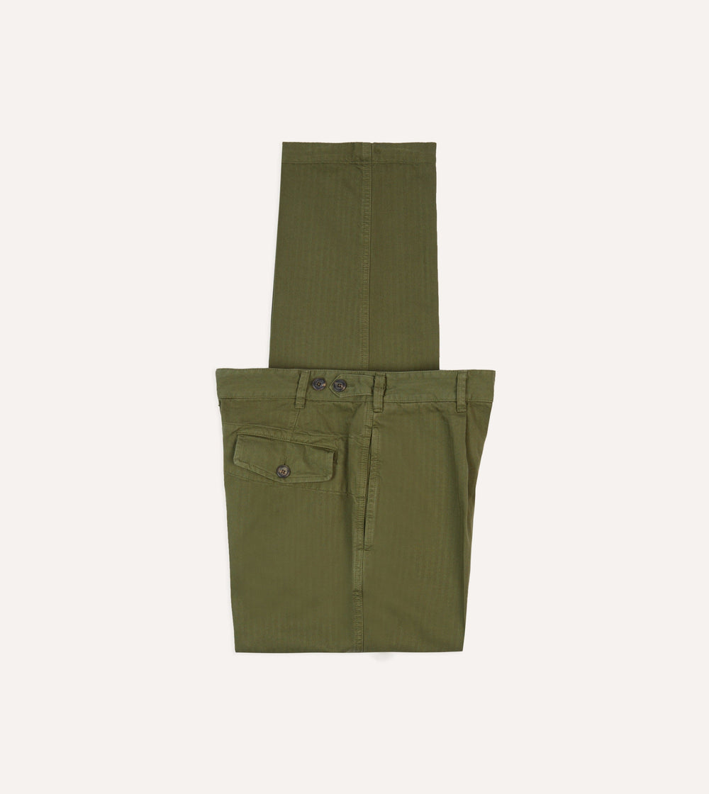 Side adjusters alongside belt loops and a concealed fob pocket keep up the utilitarian nature of these trousers, while a full leg and high rise for a more tailored waist that sits just above the hip creates a classic, mid-century shape.