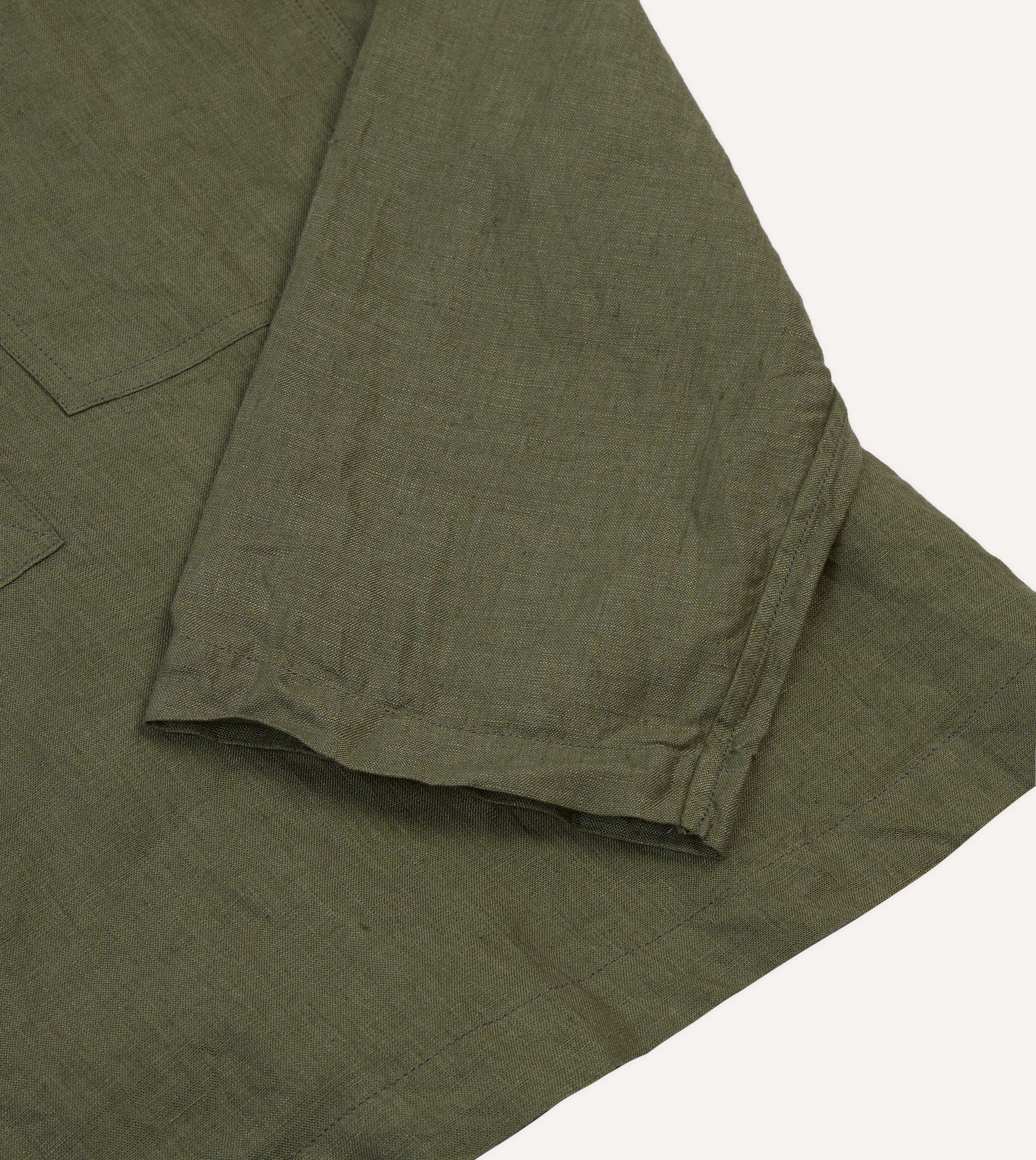 This lightweight linen piece features a Mandarin (or Grandad) collar and a handy map pocket on the chest.