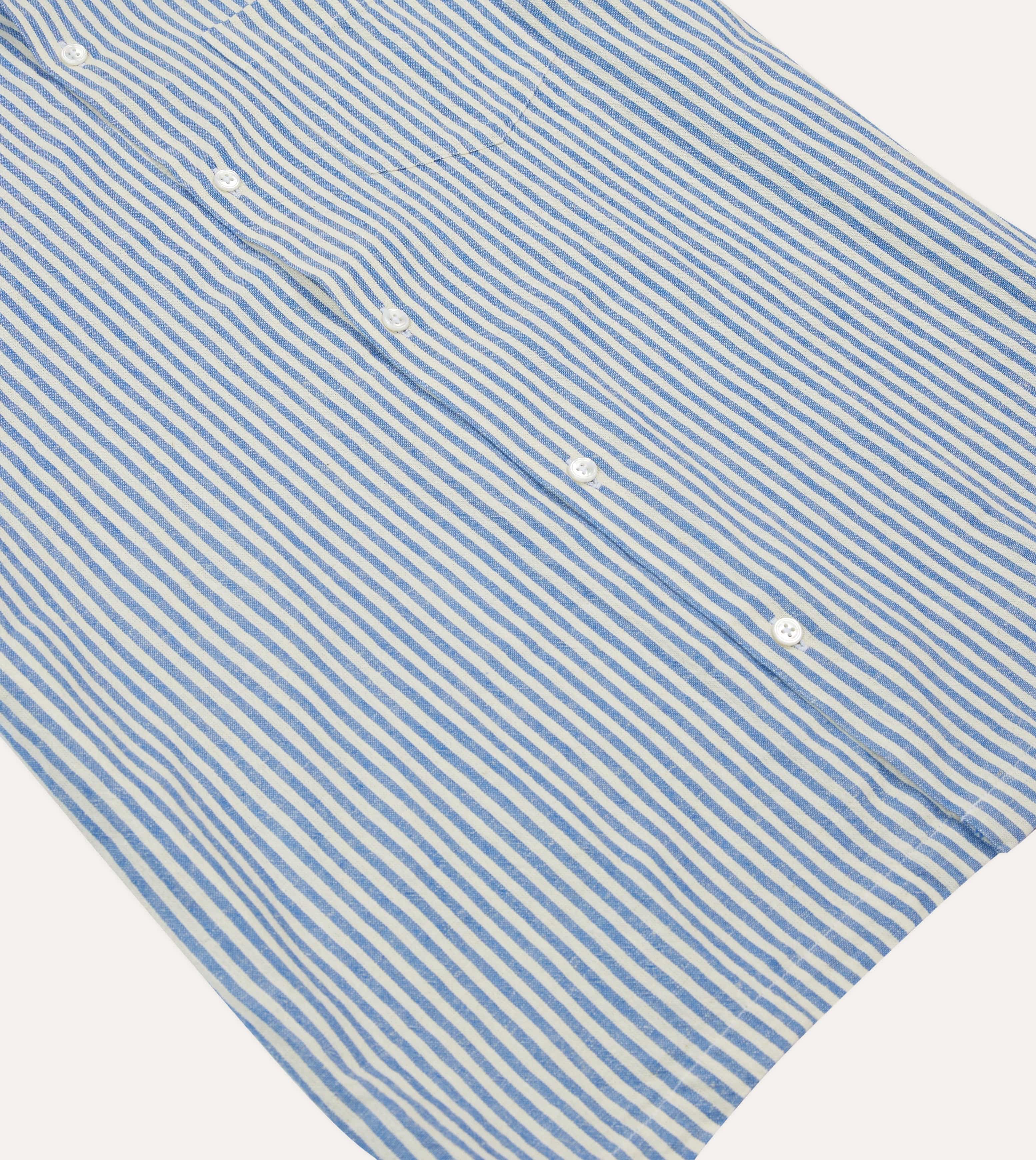 Blue and White Stripe Cotton-Linen Camp Collar Short Sleeve Shirt
