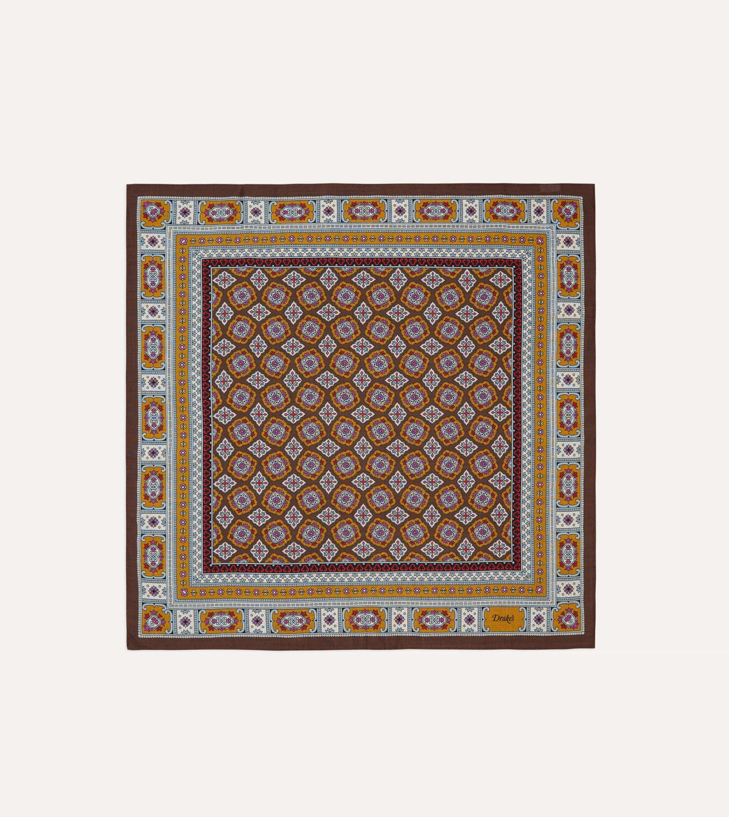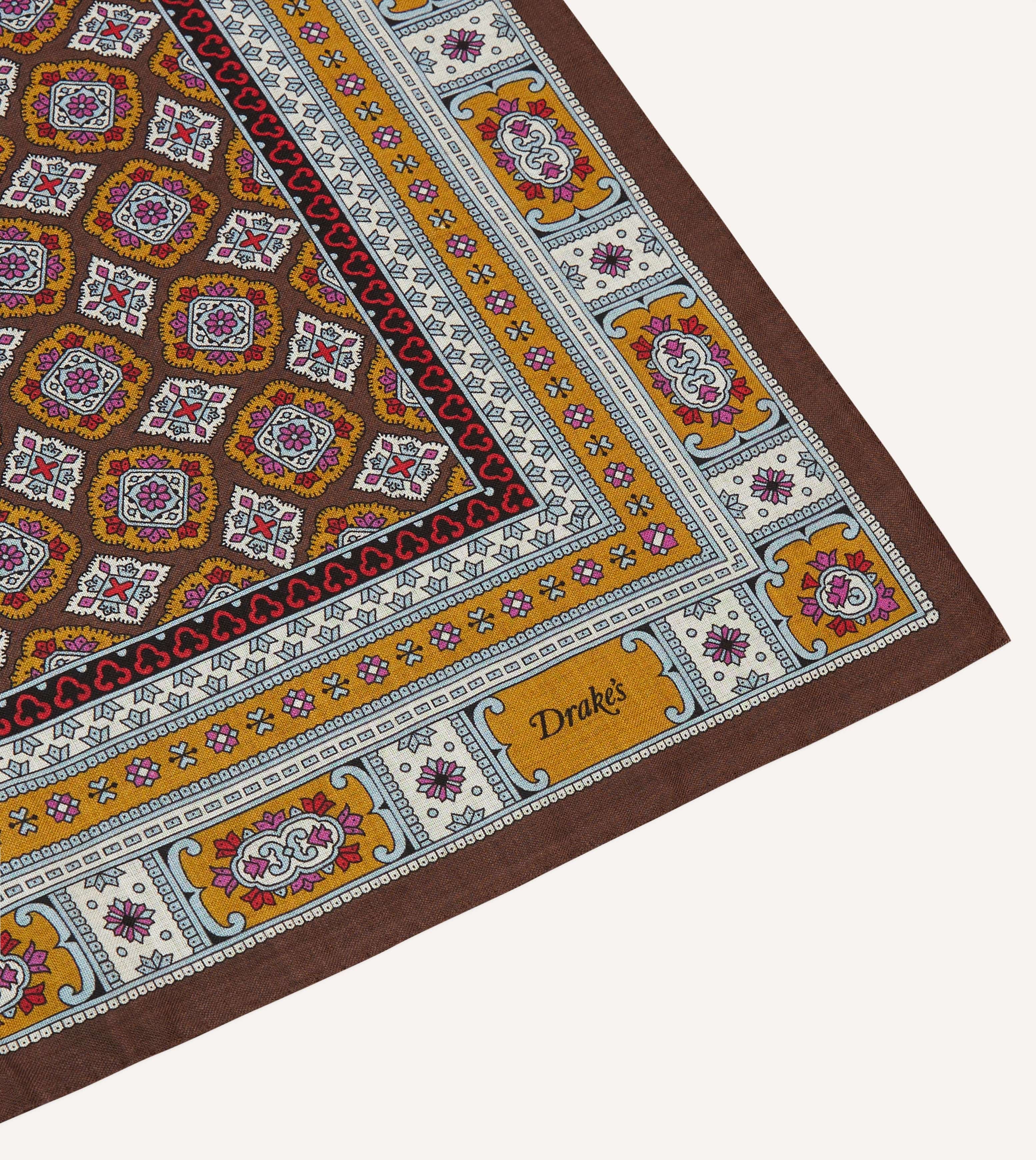 Brown, Blue and Gold Floral Medallion Print Wool-Silk Bandana