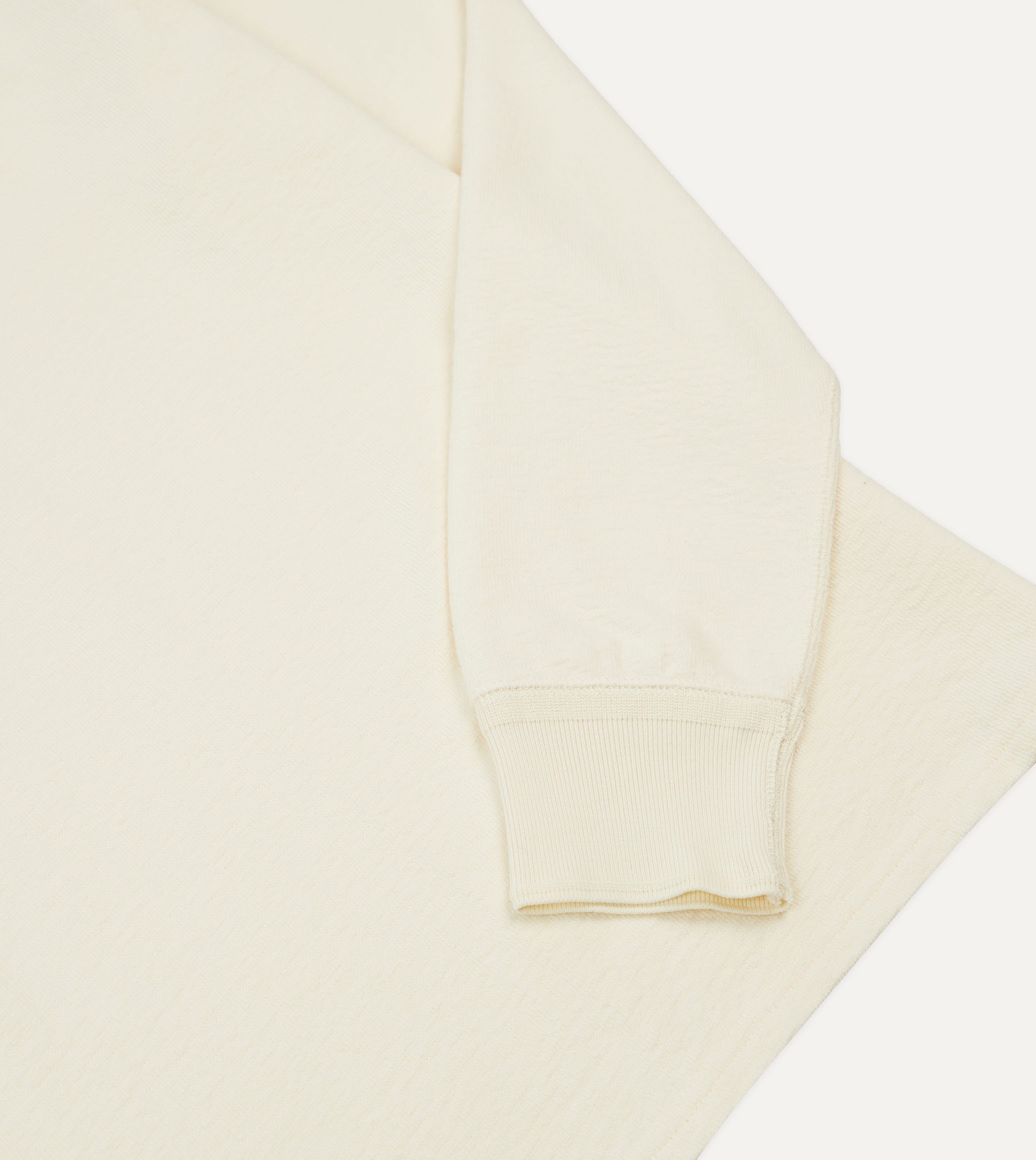 Cut from a dense cotton jersey with a reassuring weight, it’s relaxed without being loose, making it just as at home under a flannel shirt as it is worn on its own. The mock neck and ribbed cuffs bring a touch of vintage sporting charm, while the length is perfect for tucking into well-worn strides.
