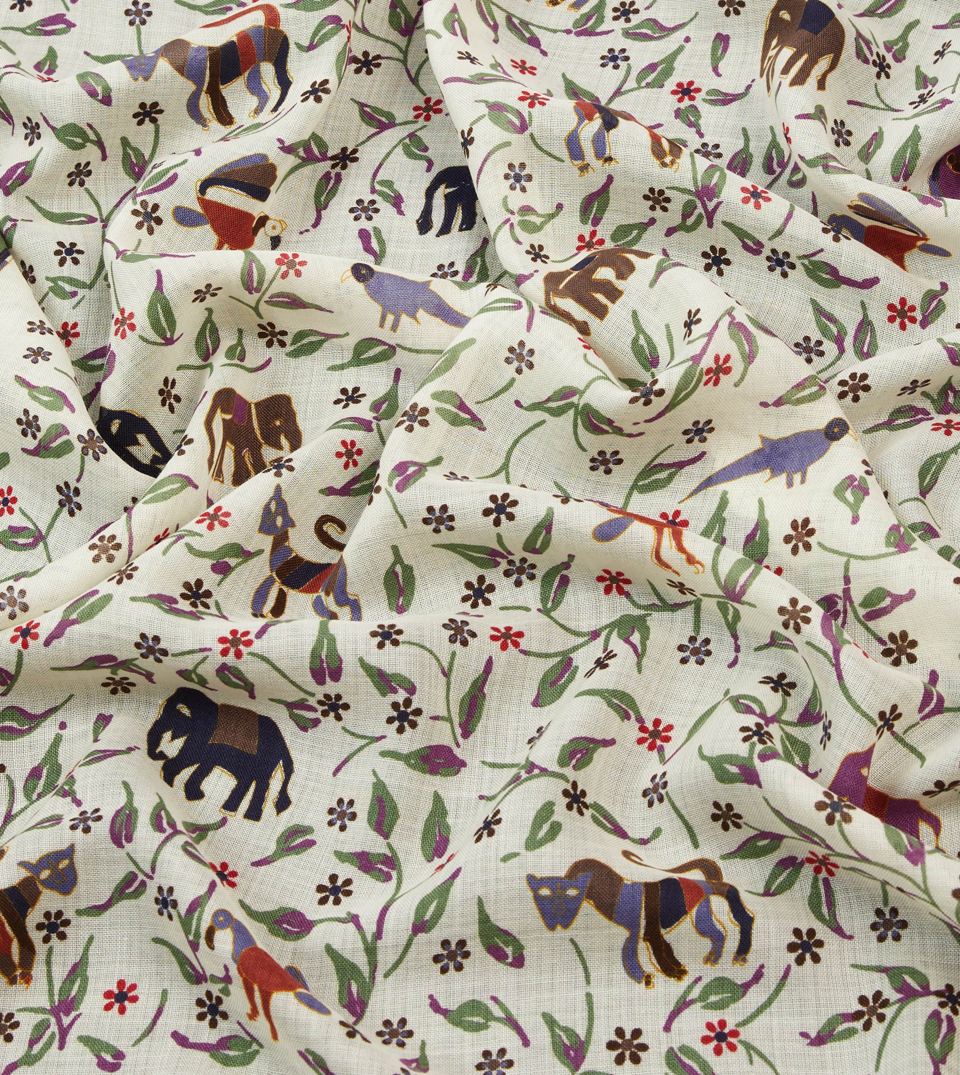 Taken from our extensive design archive, this elephants and flowers motif has been vividly applied to a blend of pure wool and silk, perfect for introducing a subtle and sophisticated dash of pattern to one's ensemble.