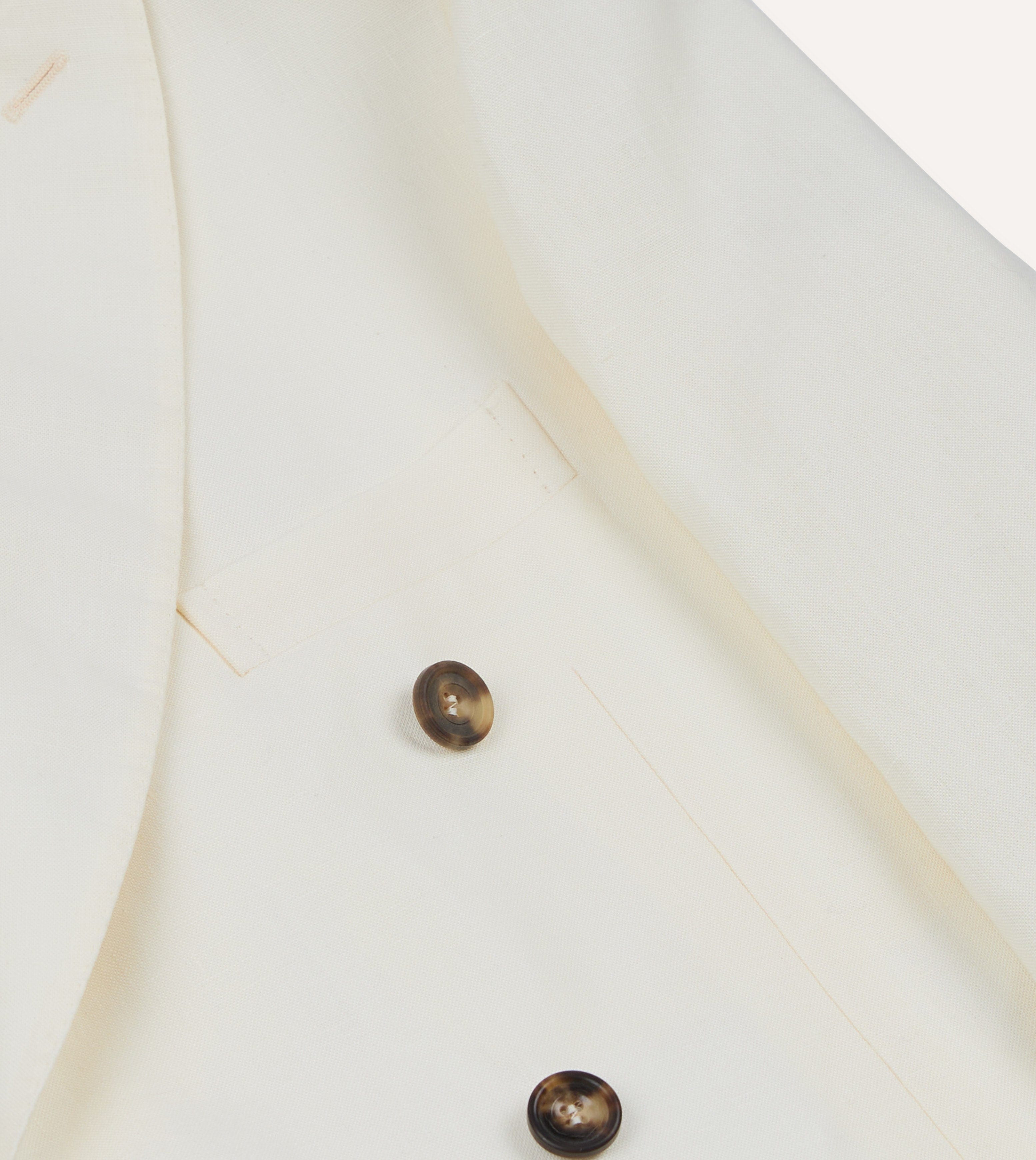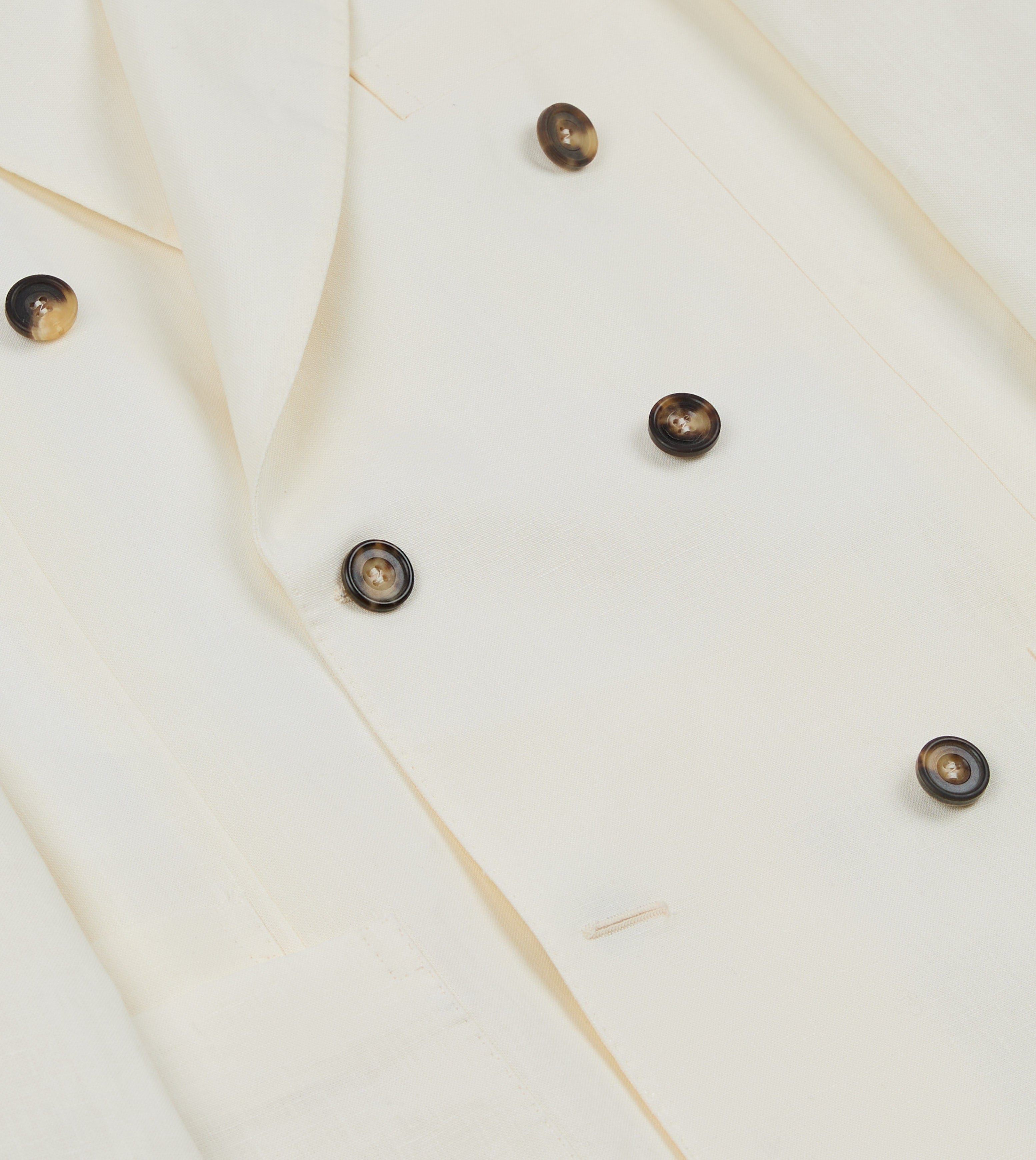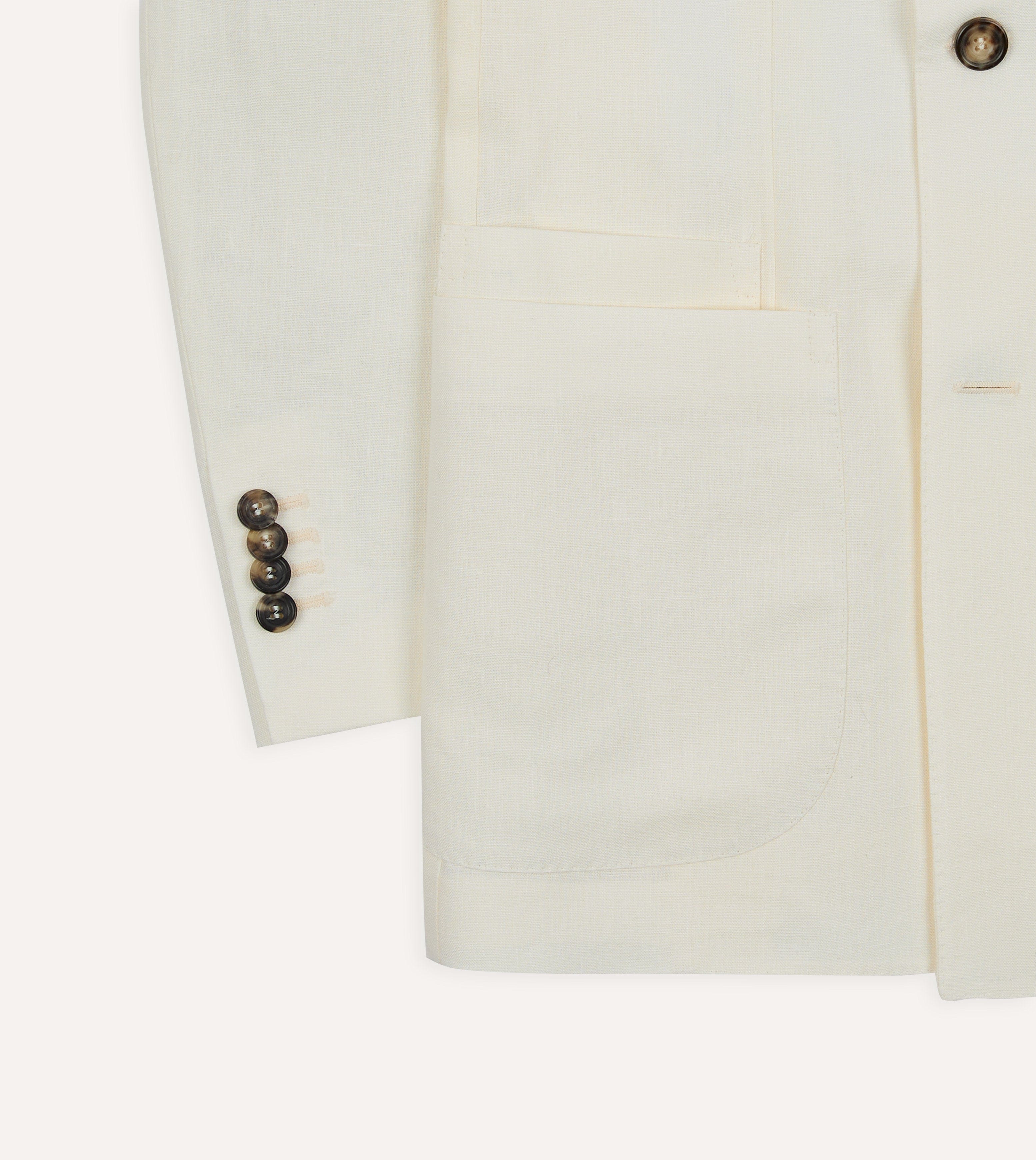 Ours is softly tailored in our house cut from a textured linen cloth, with a four-button fastening, a slightly bellied lapel, patch hip pockets with our signature patch ticket pocket, and our signature soft shoulder ensuring a highly versatile piece.