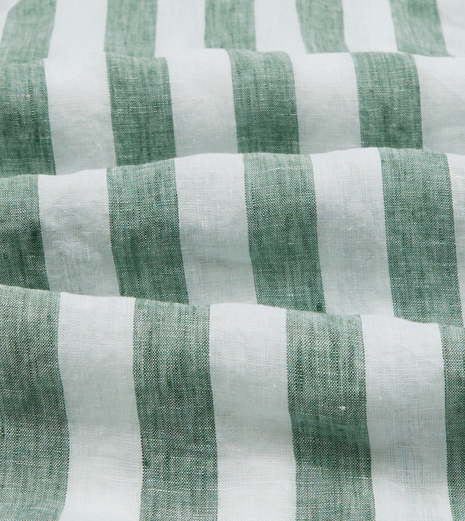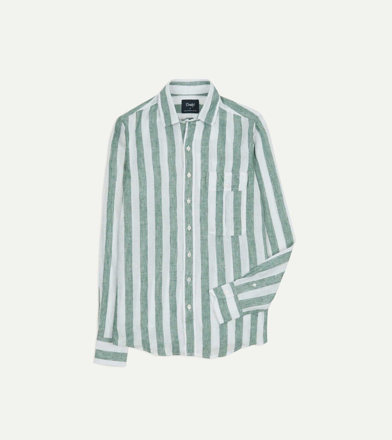 Green and White Broad Stripe Linen Spread Collar Shirt