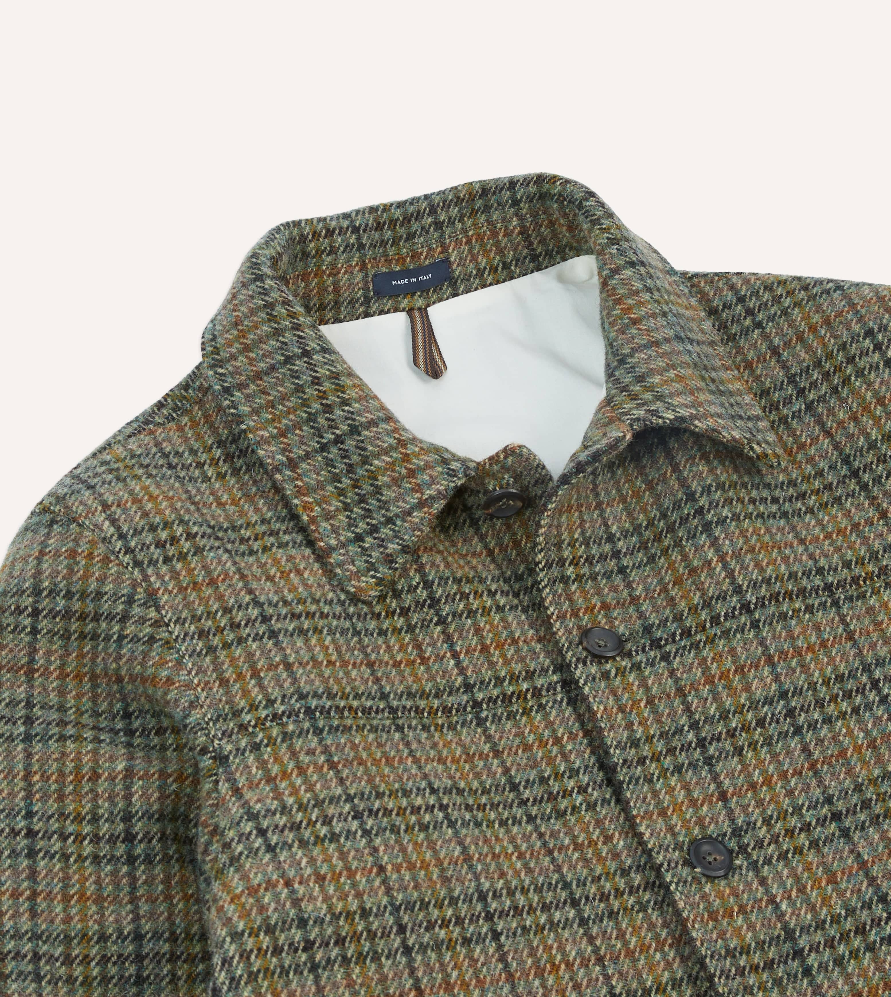 Crafted from Italian virgin wool tweed, it features genuine horn buttons, a reinforced shoulder, patch and flap bellows pockets, adjustable cuffs, and internal poacher pockets for ample utility, while the broad, structured collar and clean, straight silhouette make it a perfect study in functional elegance.