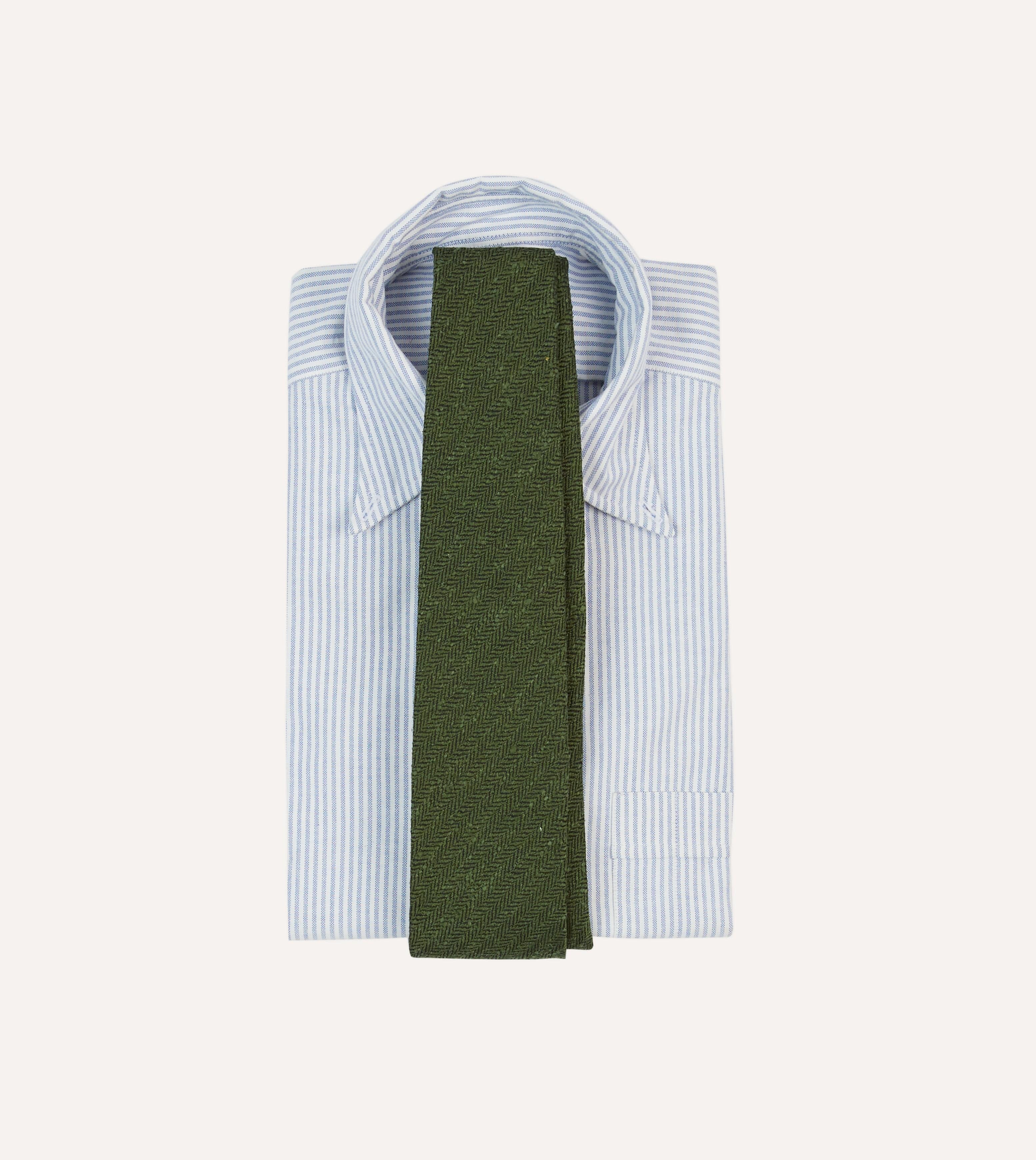 Tipping is the fabric sewn on the back of the tip and tail of a tie. Our trademark tipping is present in the form of a pure silk in Drake’s Navy.