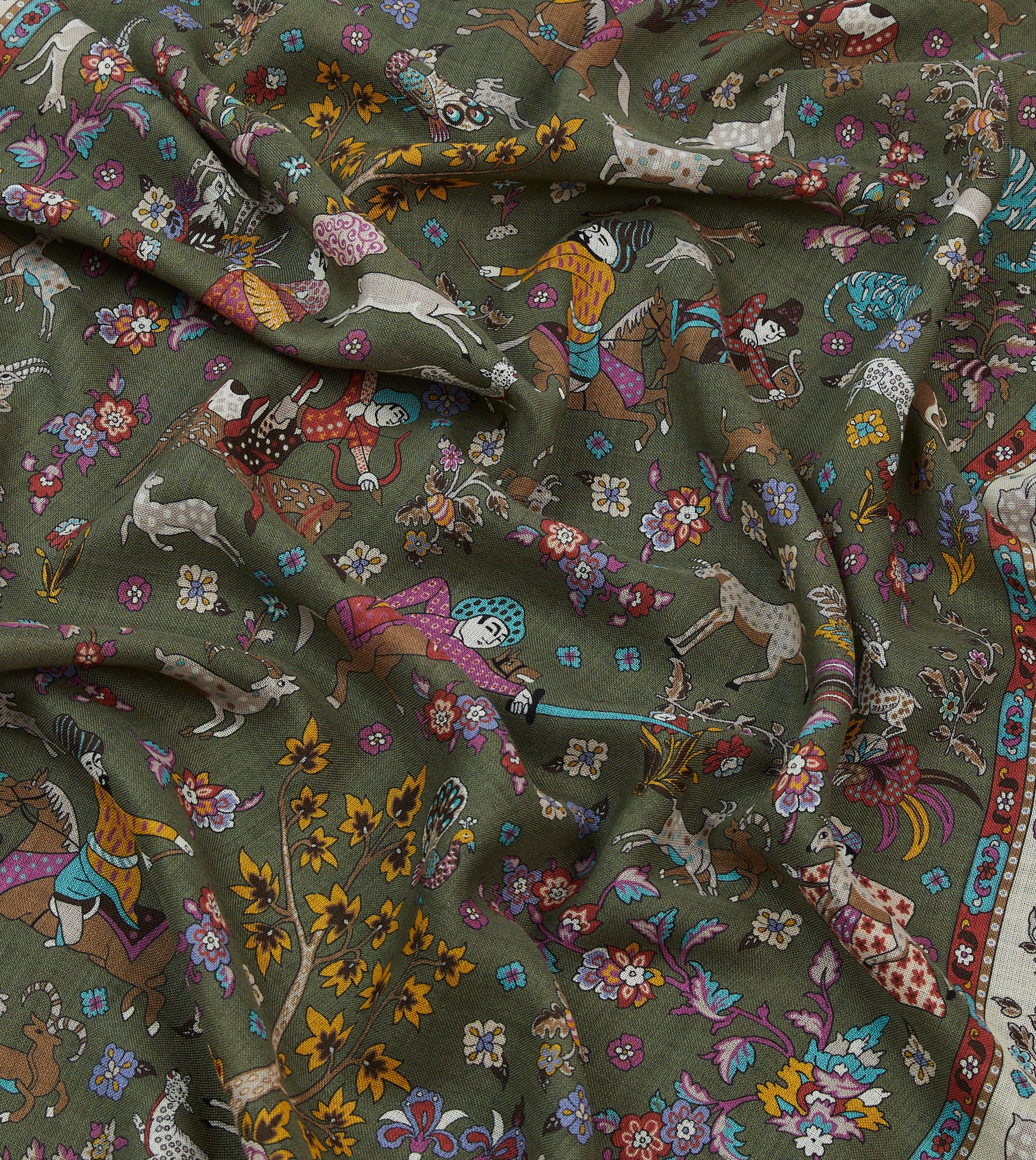Woven from a lightweight blend of wool and silk, this scarf is printed with a summery Mughal print design and features eyelash fringing at both ends for an airy addition to your arsenal.