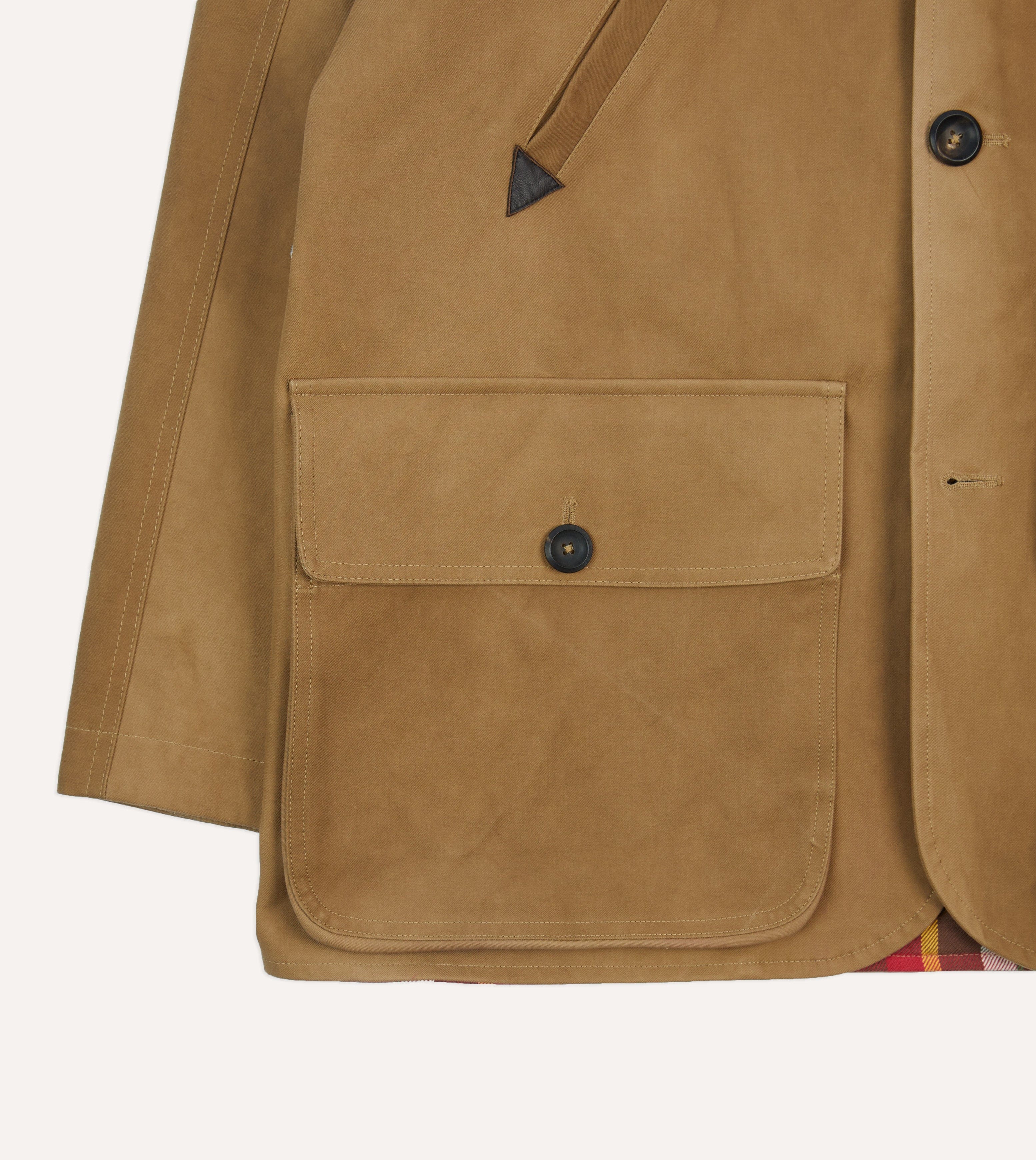Every detail has been carefully considered. A corduroy collar and leather-welted handwarmer pockets, lined in matching corduroy, provide both comfort and durability, while the body is lined in our soft checked cotton shirting cloth. Large gusseted front pockets, horn buttons, and adjustable cuffs ensure practicality for everyday wear, and inside, twin poacher’s pockets offer generous storage. A half-belt at the back and reinforced shoulders lend quiet structure, while a locker loop allows the jacket to be hung to dry after service in a downpour.
