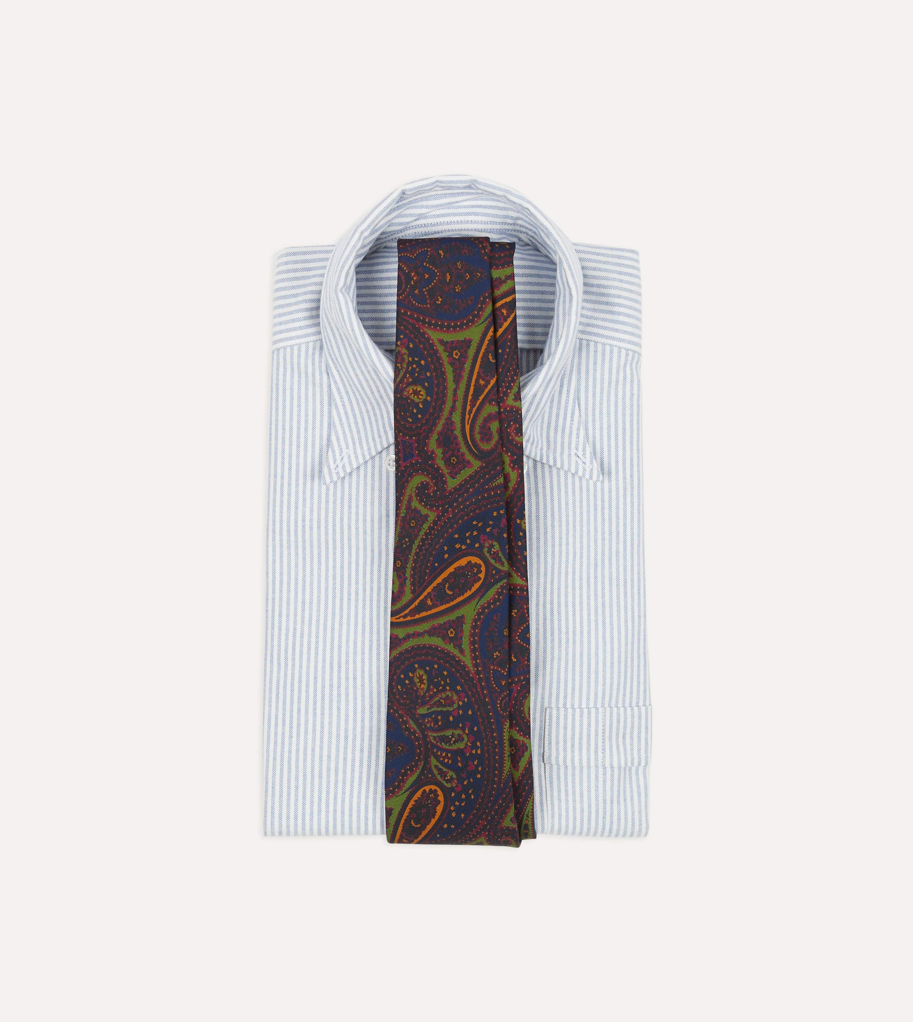 This design, direct from our extensive archive and printed on a substantial madder twill silk, features a classic paisley, and is reminiscent of the elegant late 1960s neckwear favoured by rockstars and royalty alike. The tie is pure silk with hand-rolled blades, made by hand in London.
