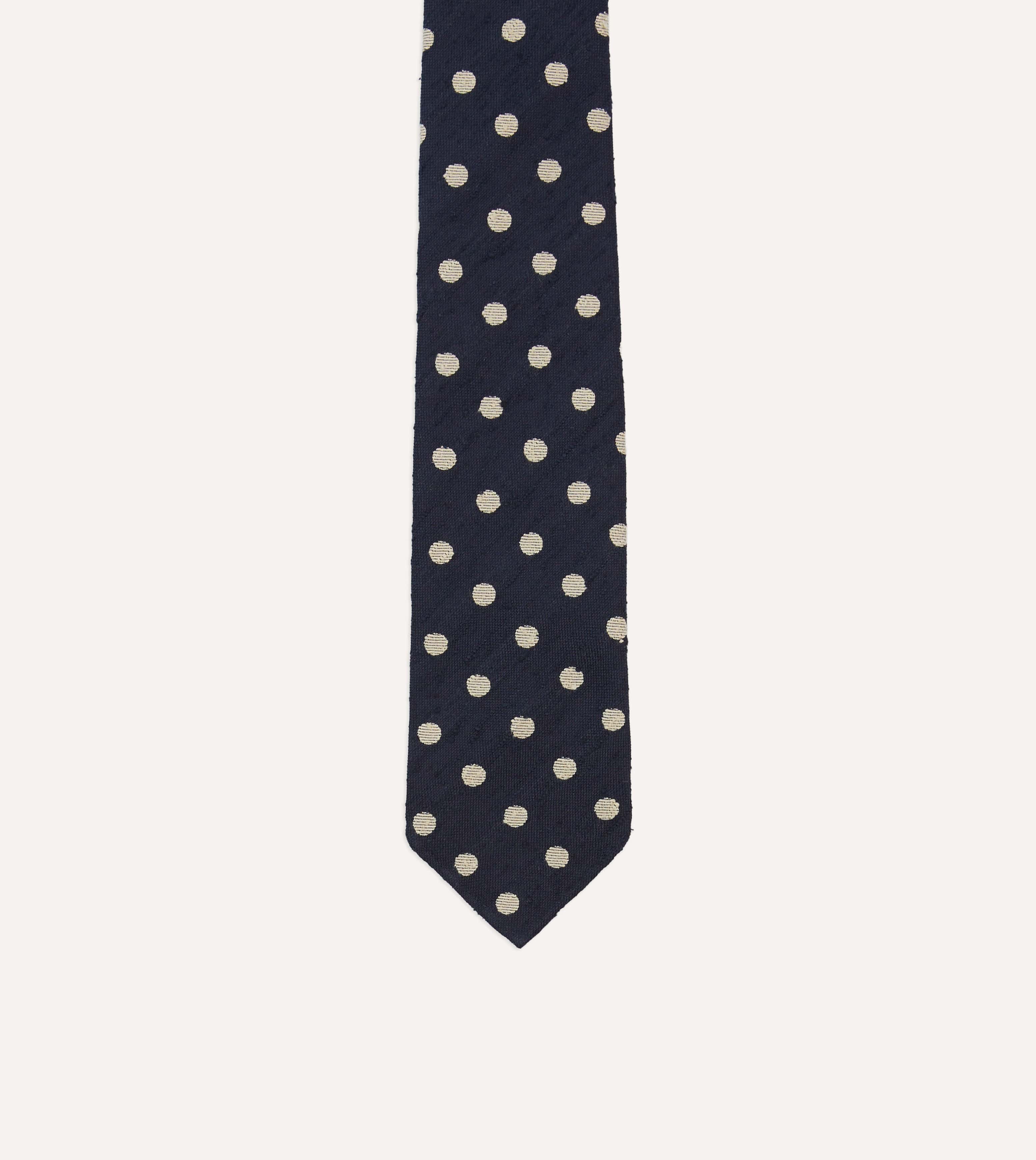 An elegant necktie, handmade in London from Shantung silk, known for its natural slub, featuring a spot pattern redolent of earlier periods of style, while retaining a distinctly modern feel.