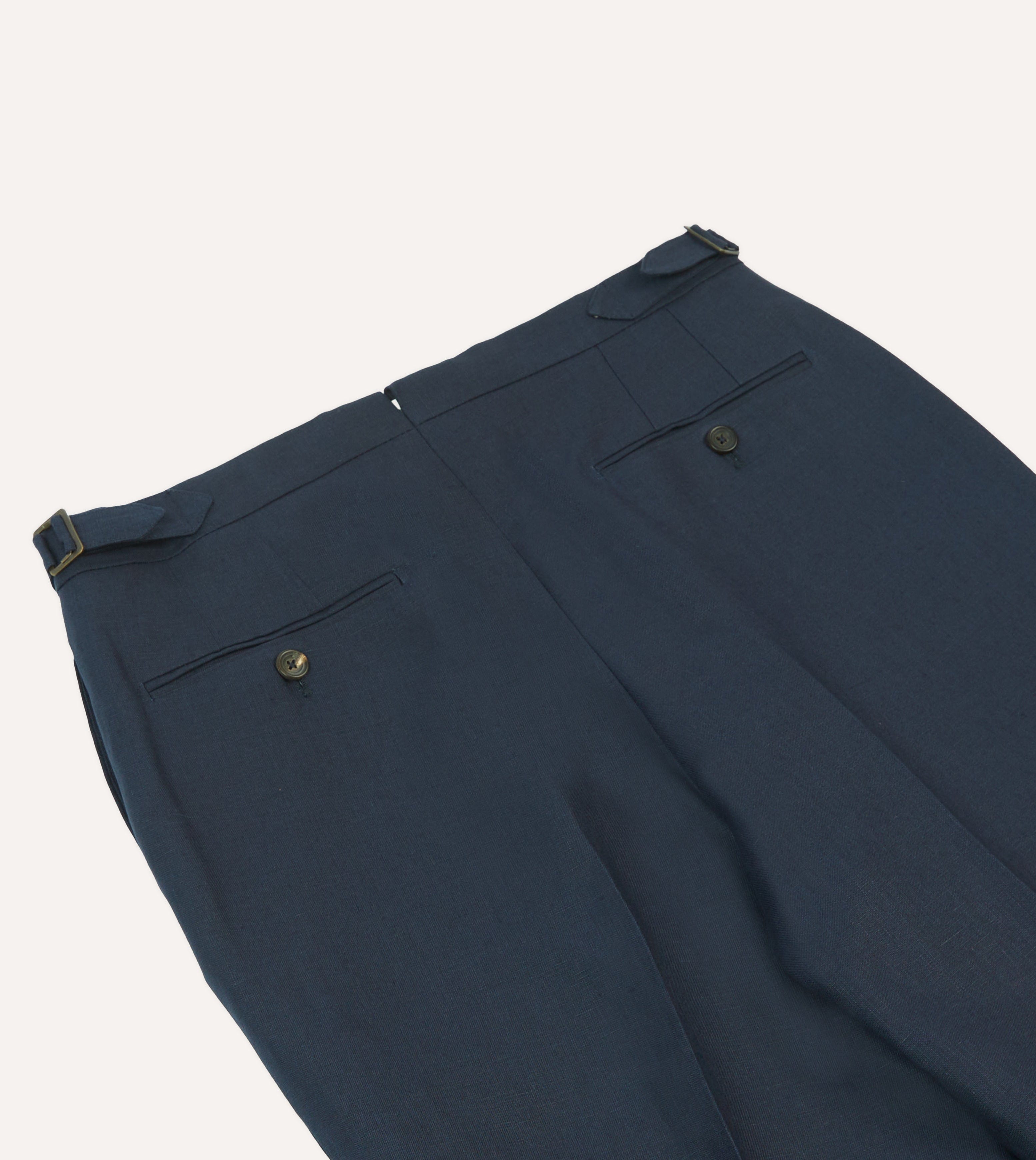 Crafted from a breezy Irish linen, the half-lined trousers feature understated details such as an extended tab front, French bearer buttoning with interior waistband curtaining, an after-dinner split to the rear, and side adjusters in lieu of belt loops.