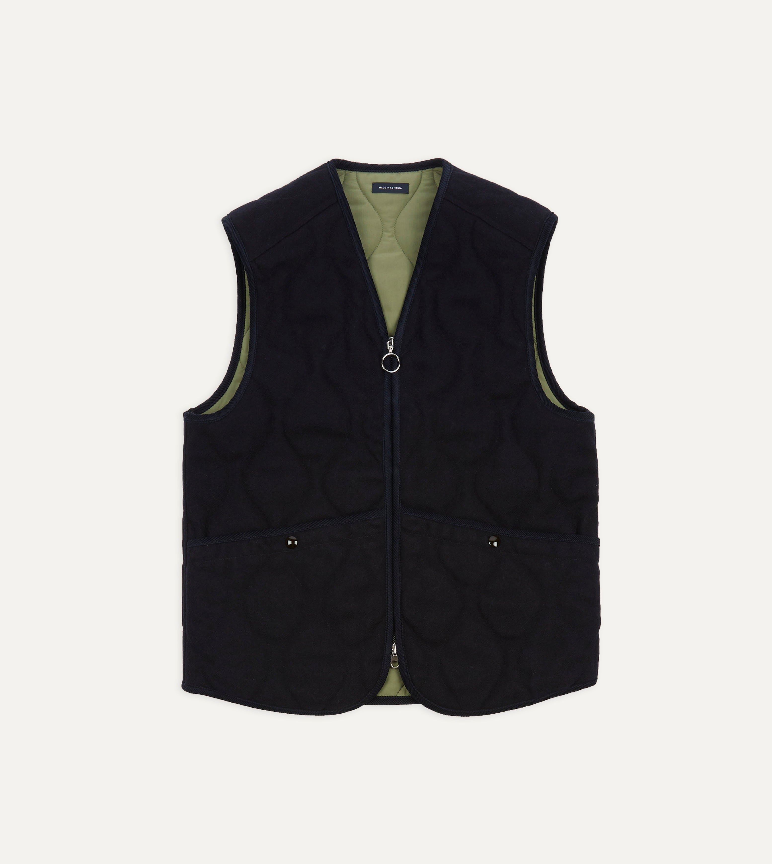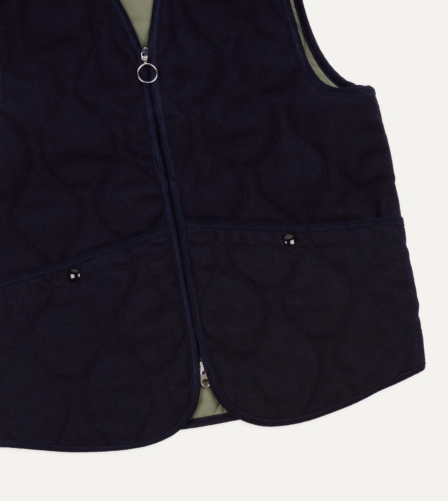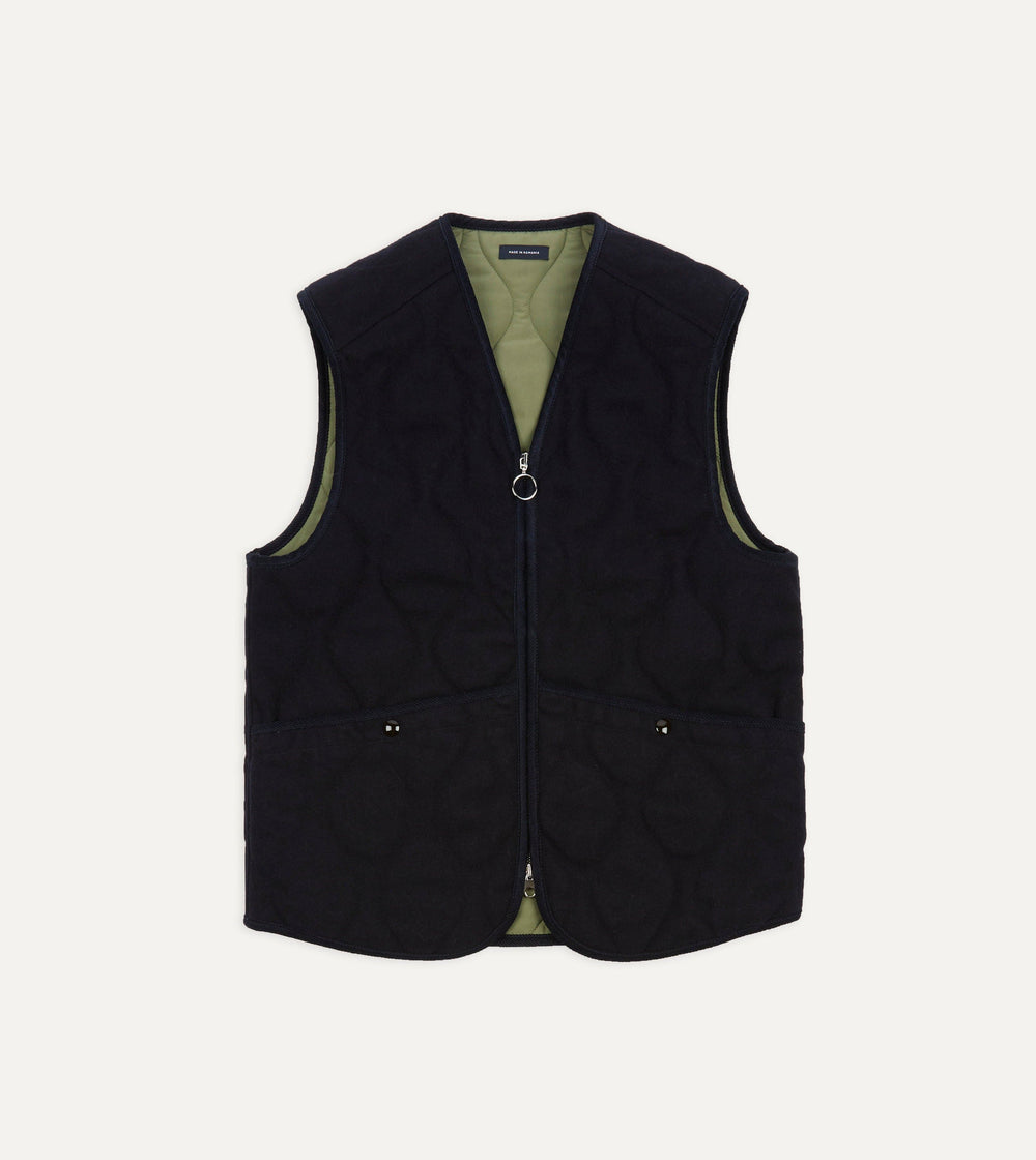 A sporty piece of outerwear with an undeniably rugged charm, this quilted gilet takes its cues from hiking and mountaineering clothing. Cut from a rugged melton wool and generously wadded with recycled wool to create a pleasingly voluminous effect, the gilet is finished with a two-way zip, wide snap button pockets, and 14 wale corduroy piping.