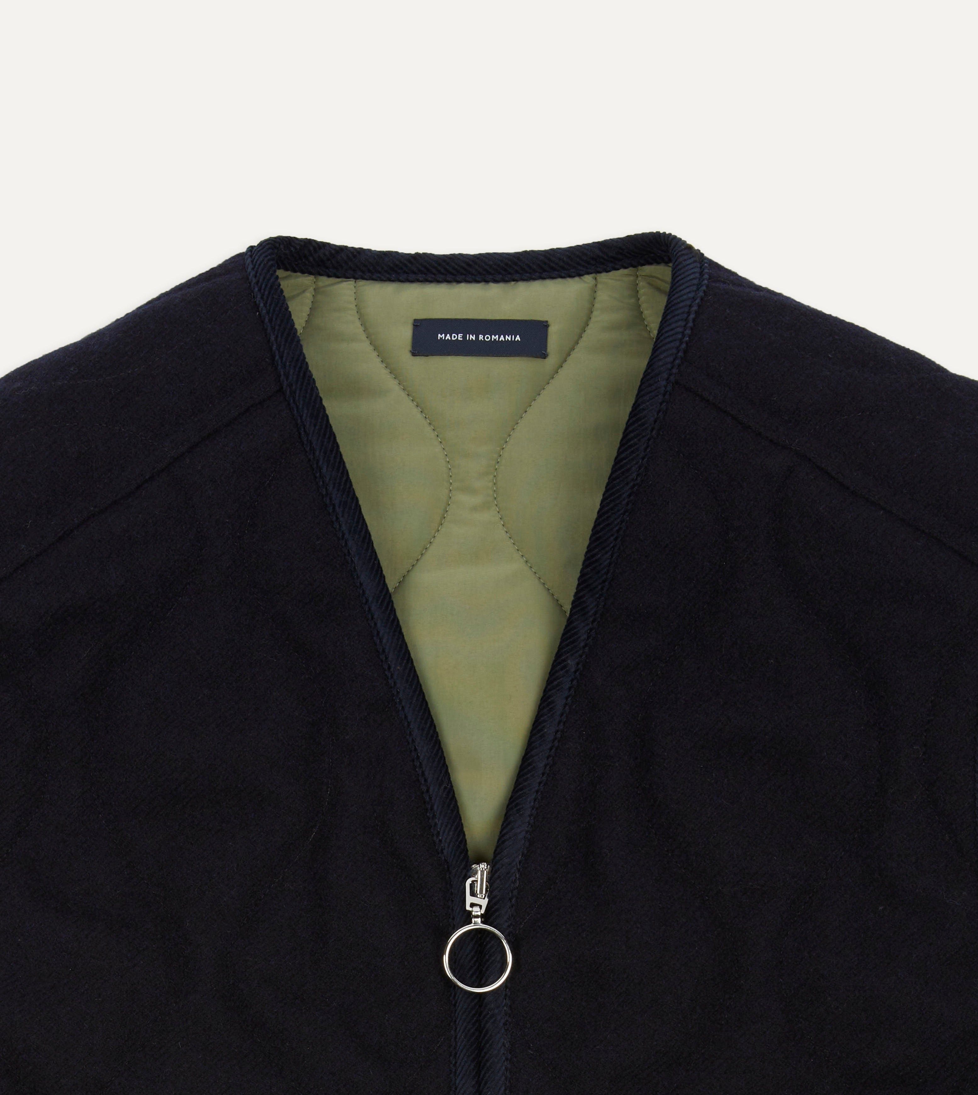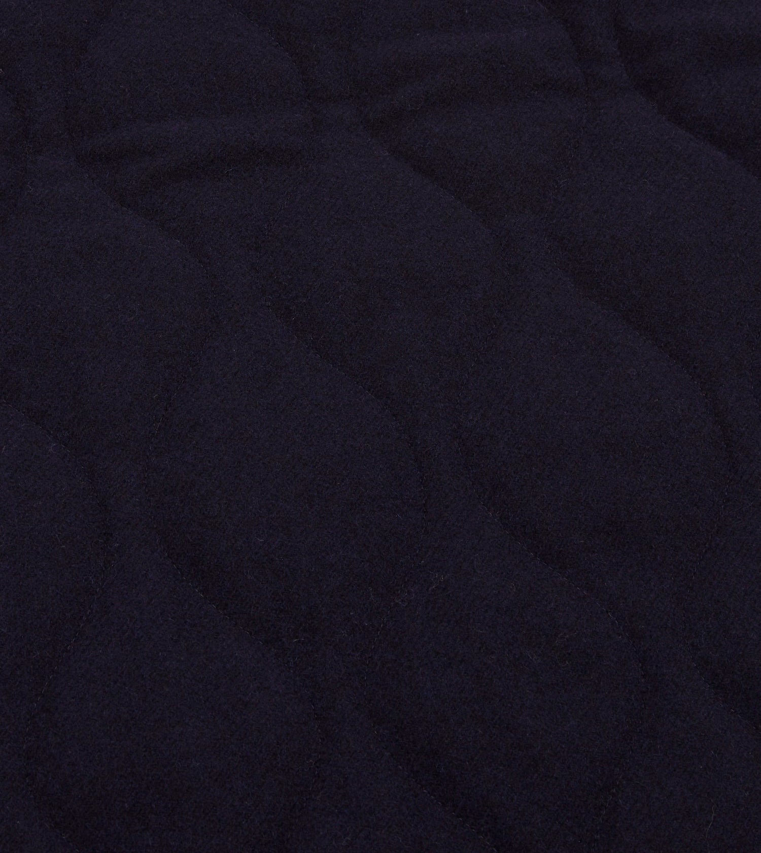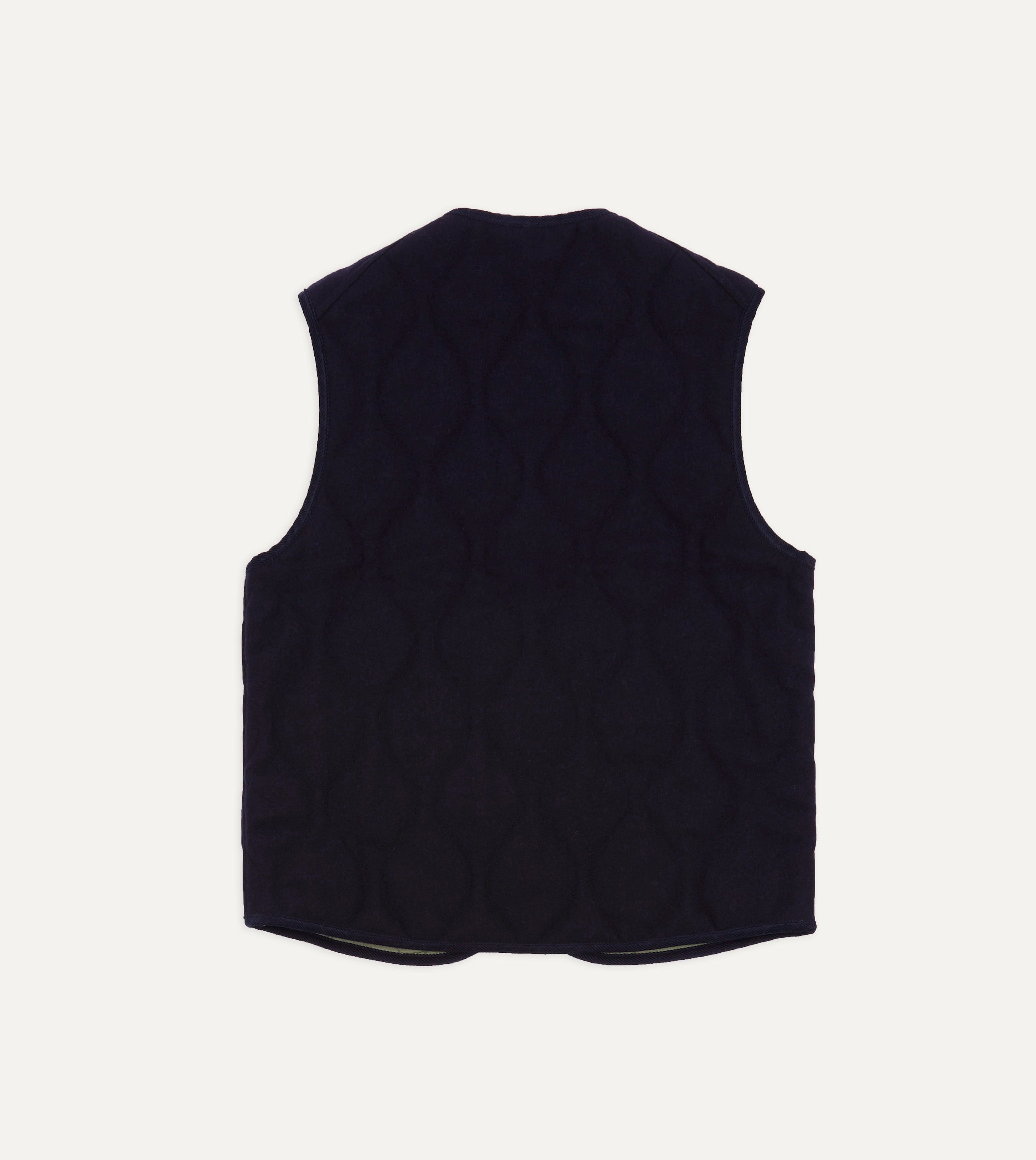 A sporty piece of outerwear with an undeniably rugged charm, this quilted gilet takes its cues from hiking and mountaineering clothing. Cut from a rugged melton wool and generously wadded with recycled wool to create a pleasingly voluminous effect, the gilet is finished with a two-way zip, wide snap button pockets, and 14 wale corduroy piping.