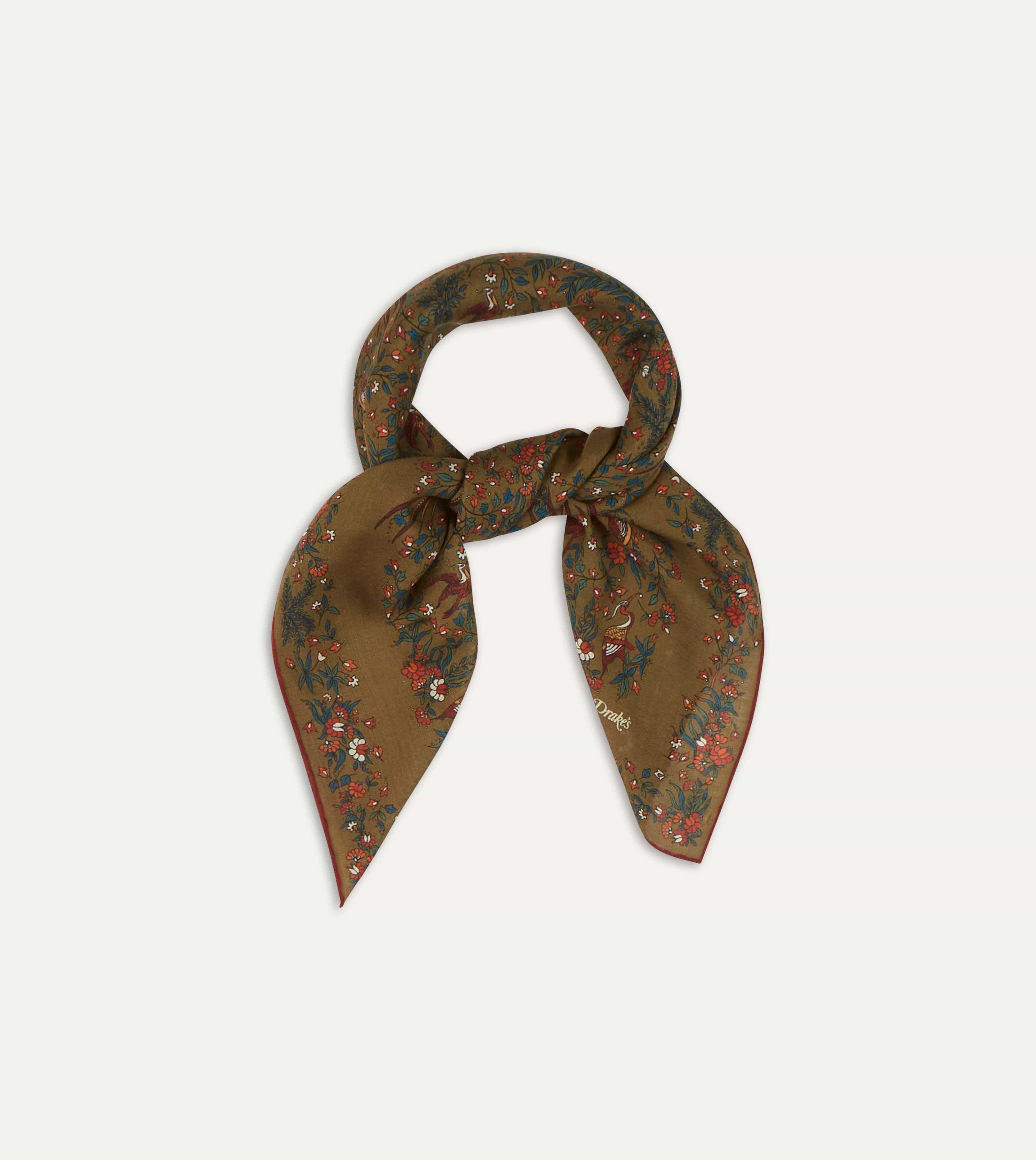Olive Birds of Paradise Print Wool-Silk Square Scarf